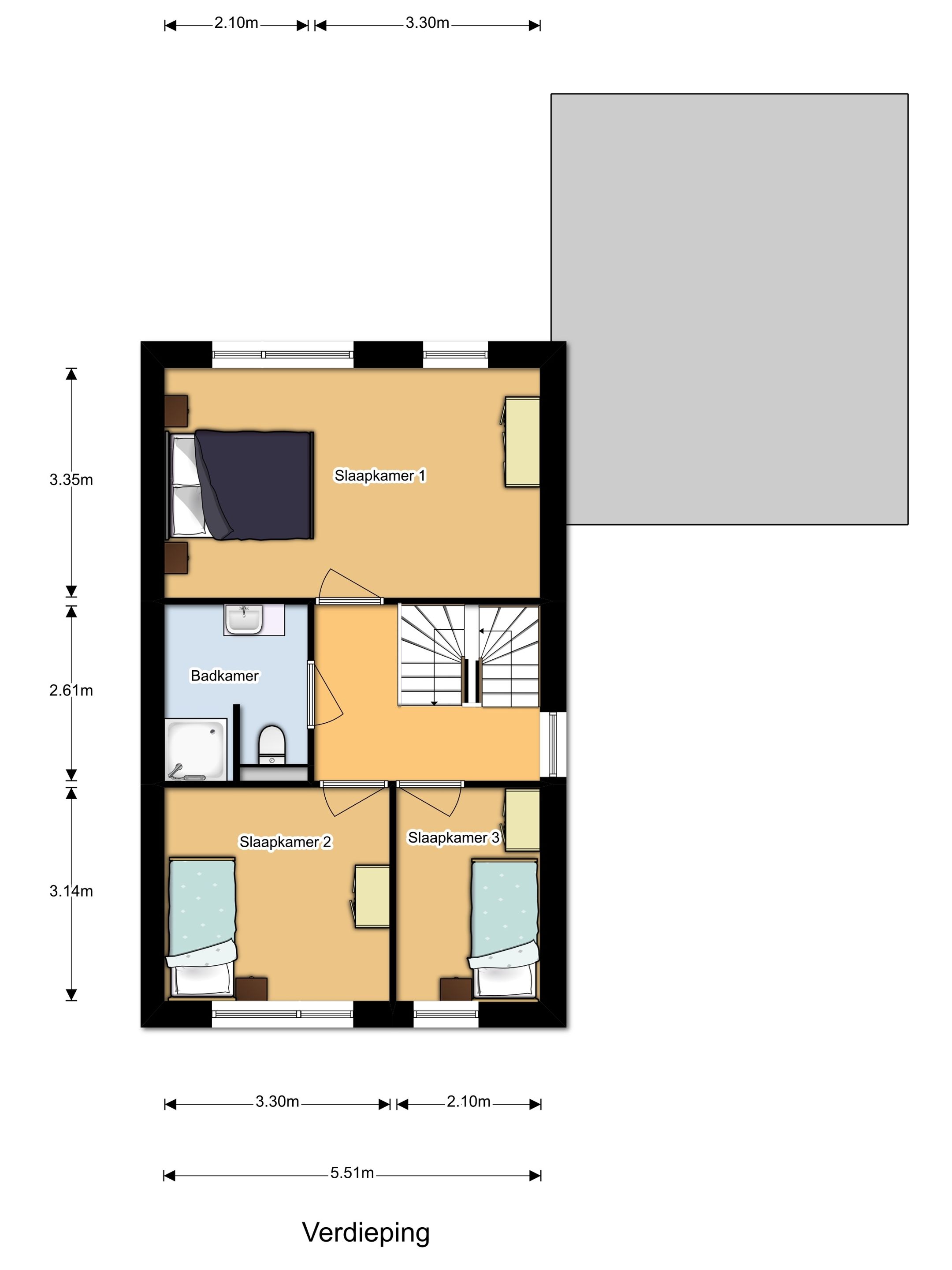 2 slaapkamers bevinden zich aan de voorzijde van de woning en de grootste slaapkamer aan de achterzijde.