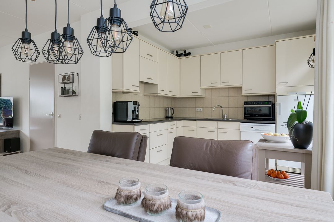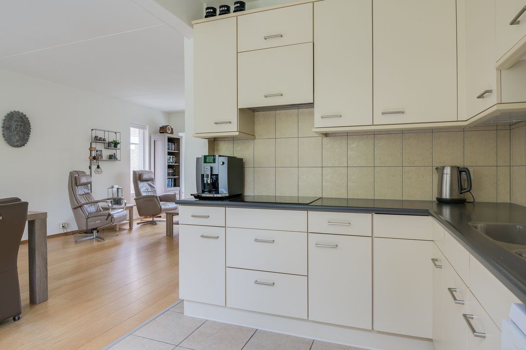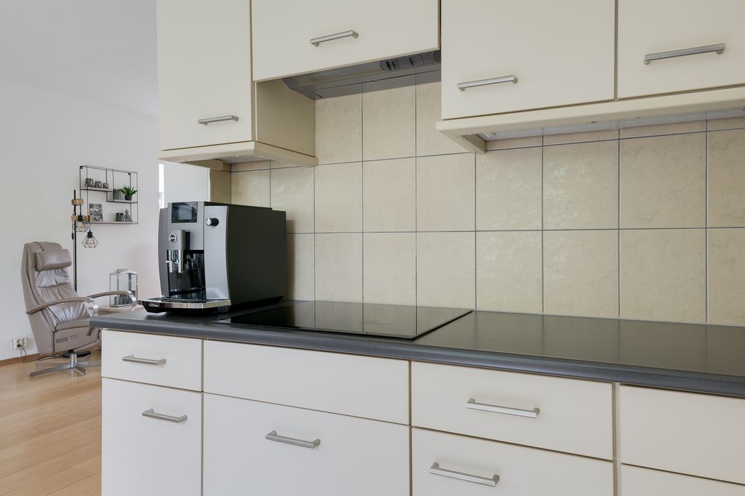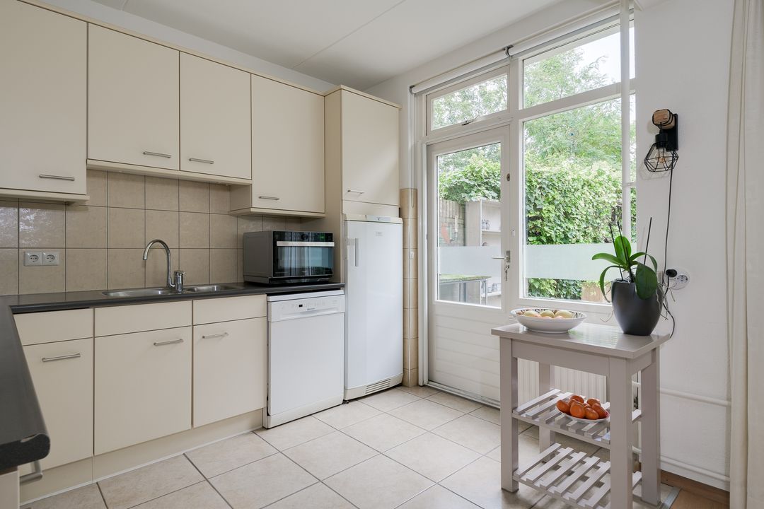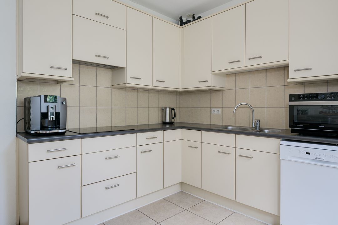 De open keuken is voorzien van alle moderne gemakken, zoals een inductiekookplaat, vaatwasser en koelkast. Via de achterdeur heeft u direct toegang tot de tuin – ideaal voor een kopje koffie in de zon of een gezellige barbecue op zomeravonden. De lichte tegelvloer is niet alleen praktisch maar geeft de keuken ook een frisse uitstraling.