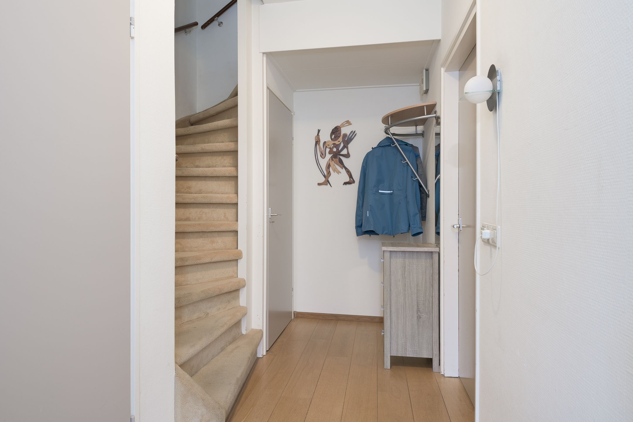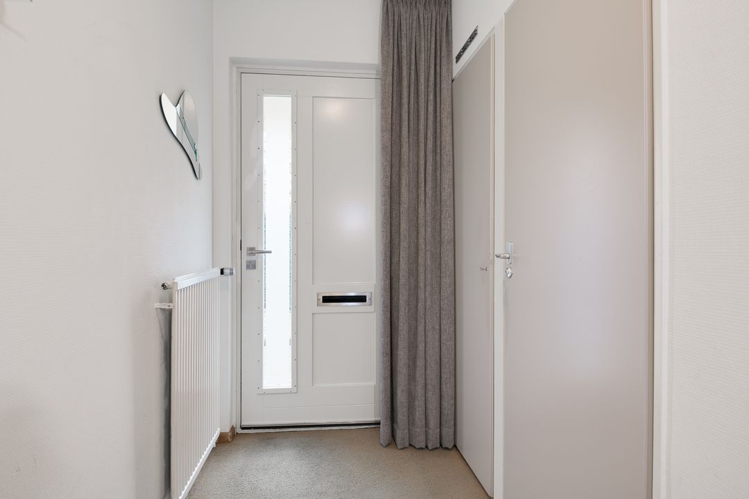 Na het parkeren op uw eigen oprit bereikt u via enkele stappen de voordeur. De hal is praktisch ingedeeld met een handige trapkast voor extra bergruimte en een nis waar u een garderobe kunt creëren. In de hal vindt u ook de meterkast en een modern toilet met wandcloset en fonteintje. De lichte parketvloer, die doorloopt in de rest van de woning, leidt u via een deur naar de woonkamer of via de trap naar de eerste verdieping.
