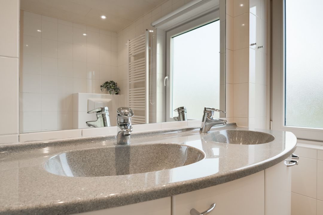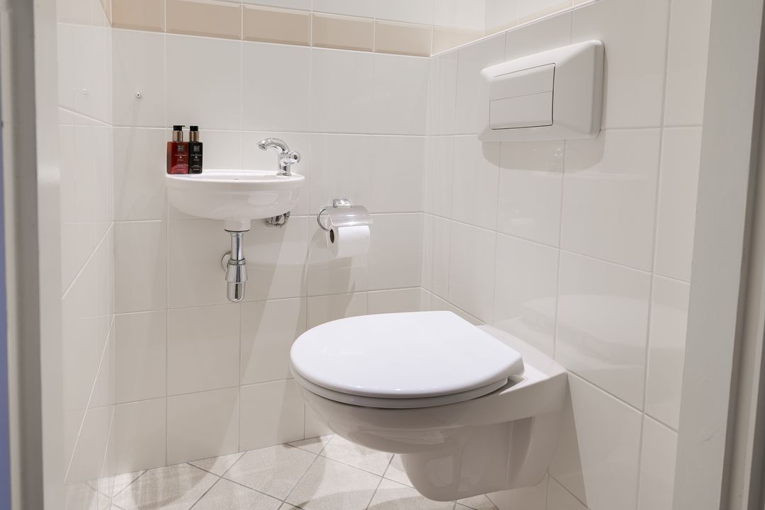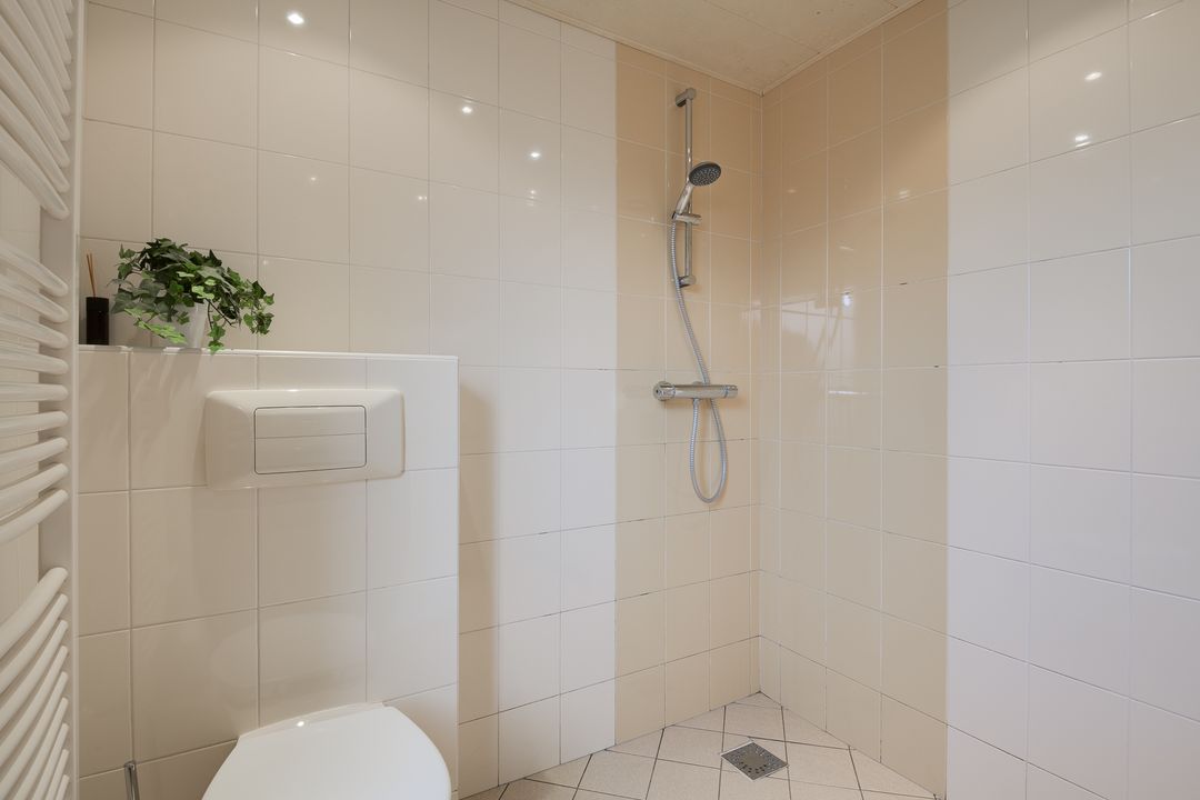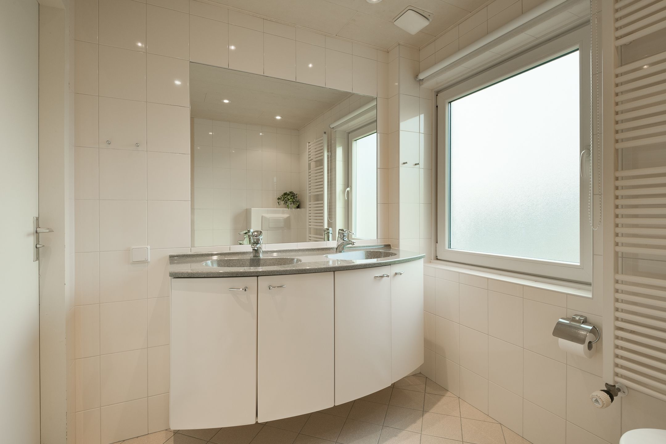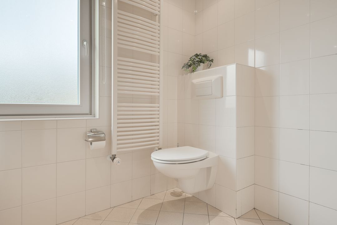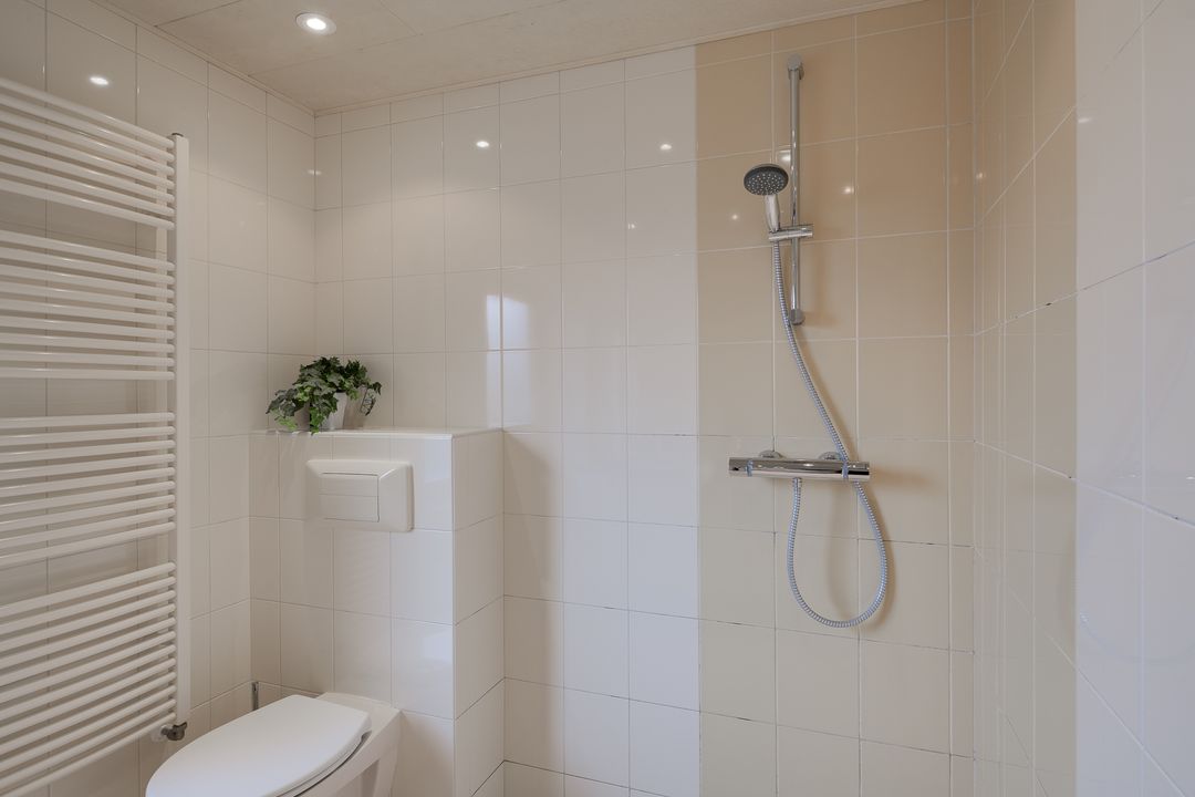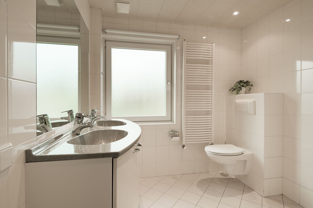 De badkamer is strak en modern uitgevoerd met een ruime douche, toilet en een dubbele wastafel. De witte tegels en designradiator geven de ruimte een eigentijdse uitstraling. Extra prettig is het grote raam, waarmee u in een handomdraai voor natuurlijke ventilatie zorgt.