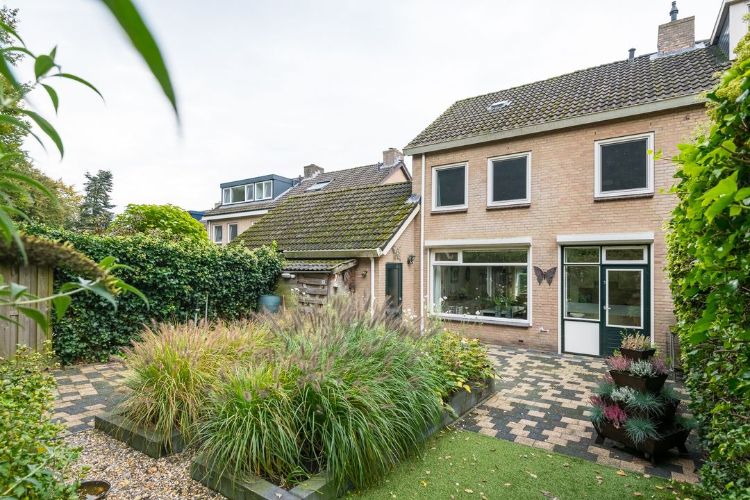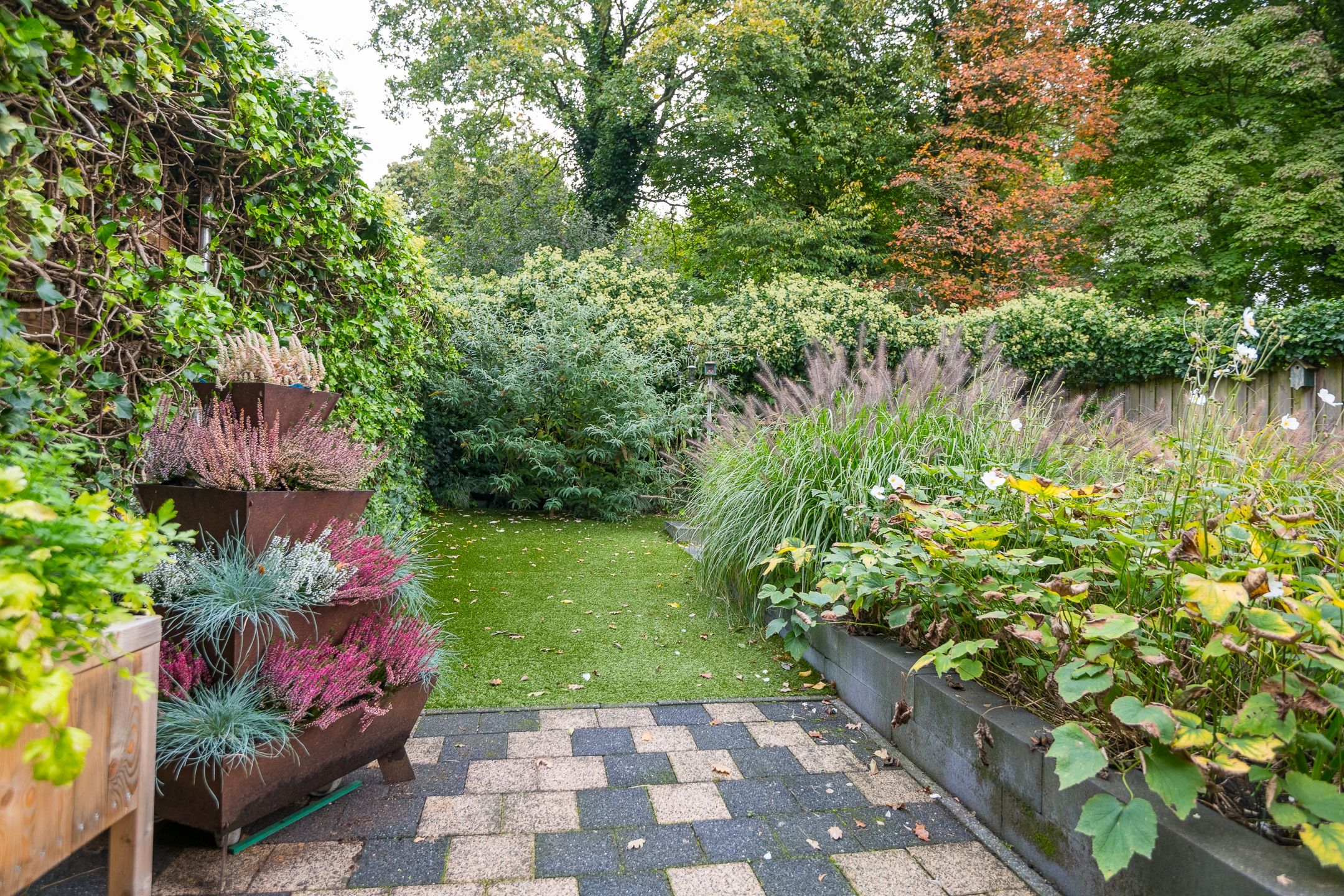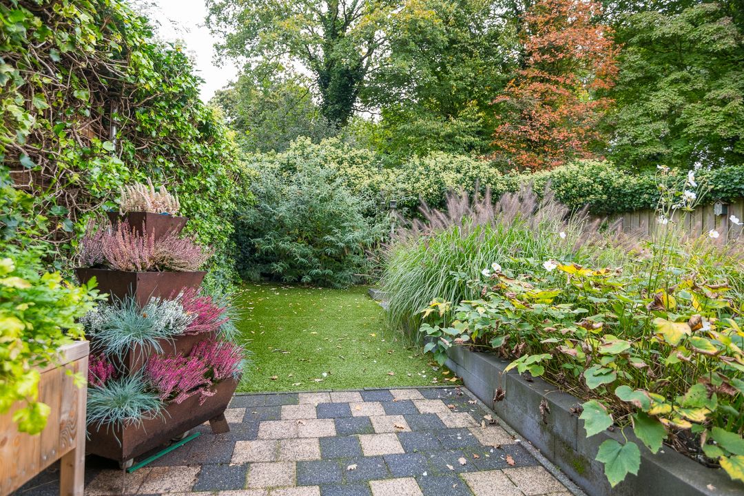 De achtertuin is een groene oase met verhoogde plantenbakken, siergrassen en vaste planten. De bestrating is in een decoratief patroon gelegd en de tuin is voorzien van een stukje kunstgras. Een buitenkraan, buitenstopcontacten en tuinverlichting maken het plaatje compleet.