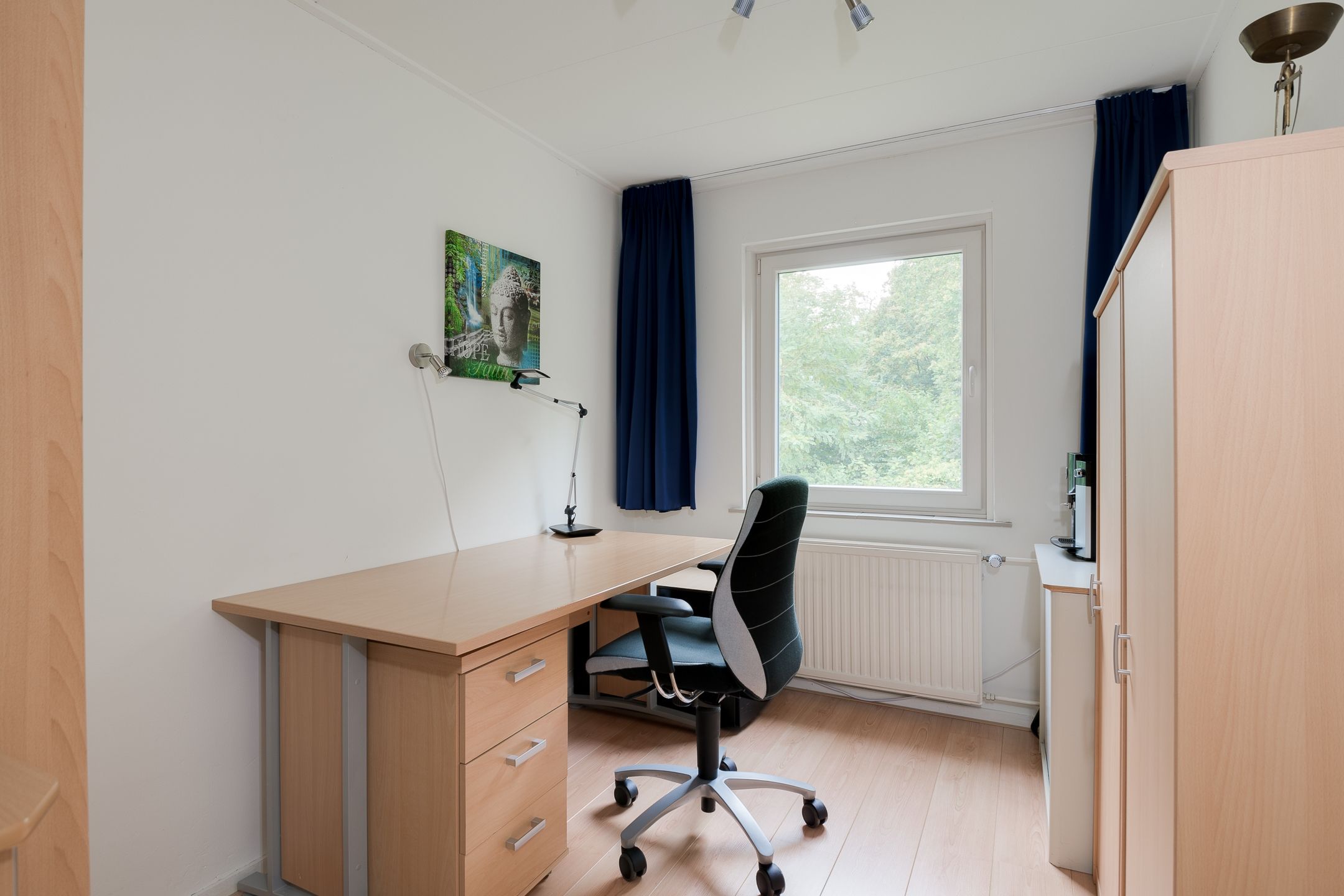 De derde slaapkamer bevindt zich aan de achterkant van het huis. Deze is momenteel ingericht als praktisch thuiskantoor, en laat perfect zien hoe veelzijdig deze ruimte is. Met een groot raam dat uitkijkt op het groen is dit een rustige werkplek waar u geconcentreerd kunt werken, maar de kamer kan ook eenvoudig worden omgetoverd tot een slaapkamer, speelkamer of hobbykamer – de mogelijkheden zijn eindeloos.