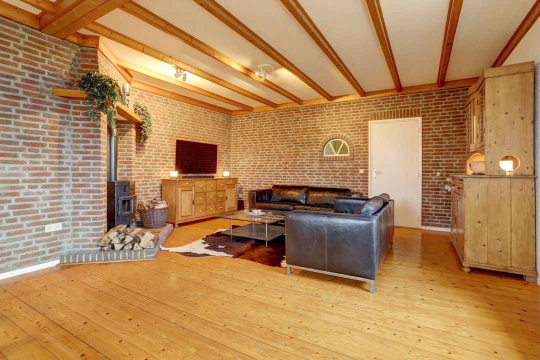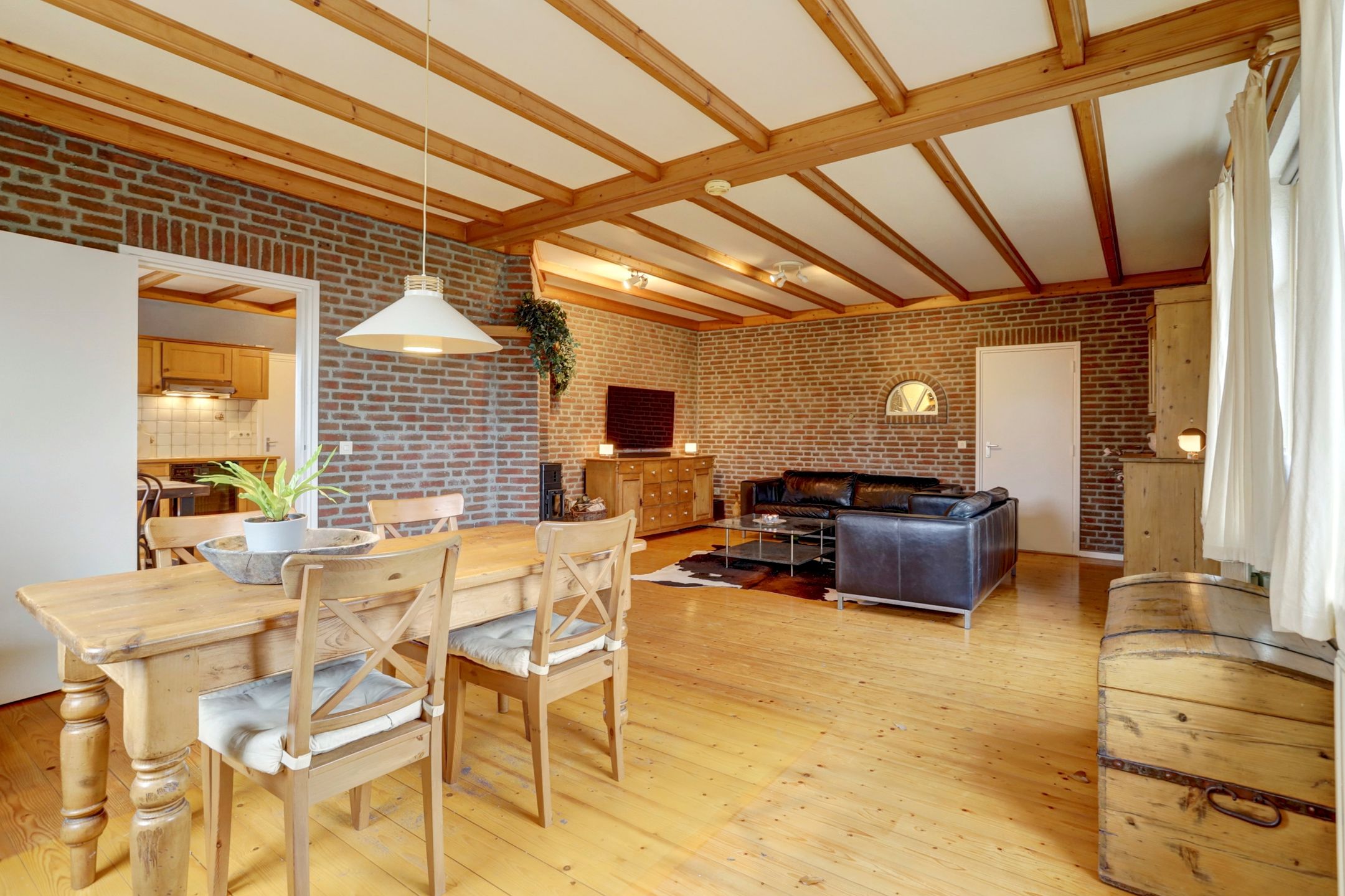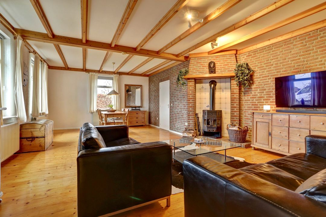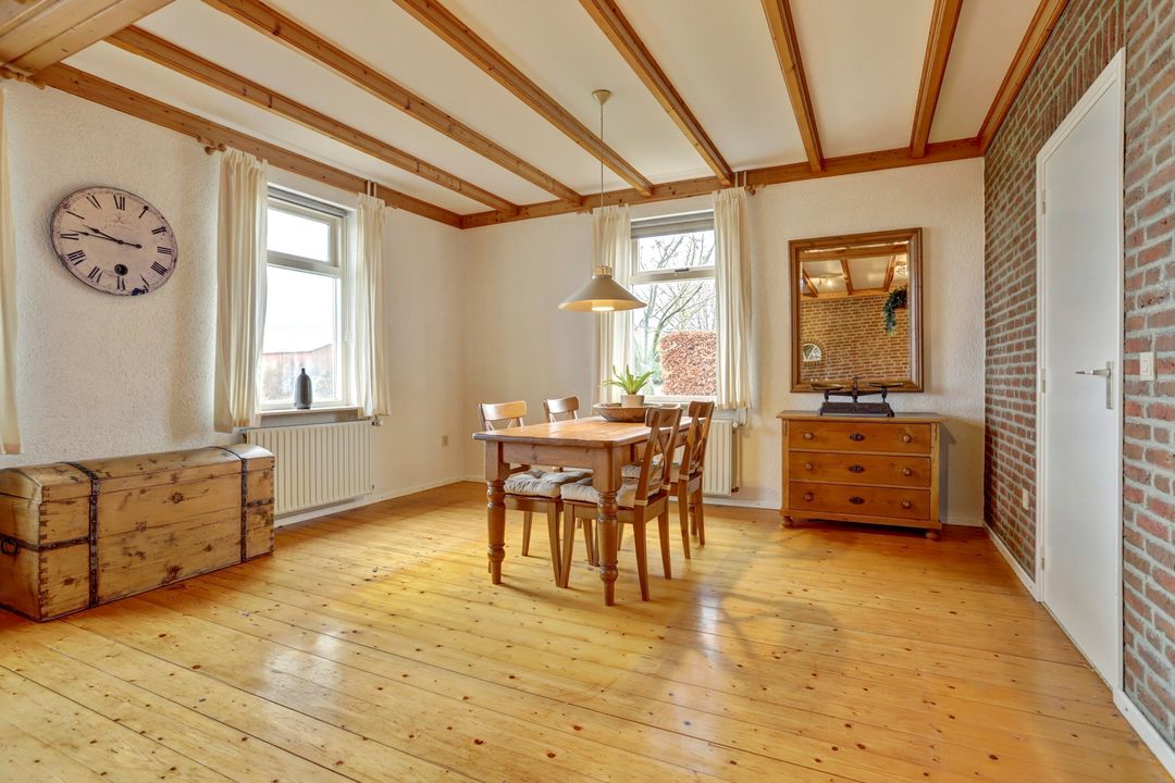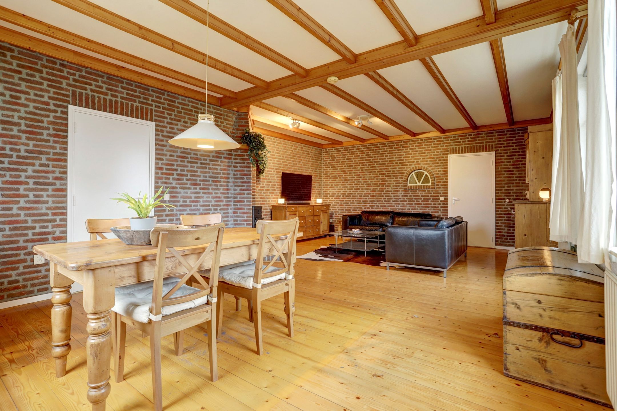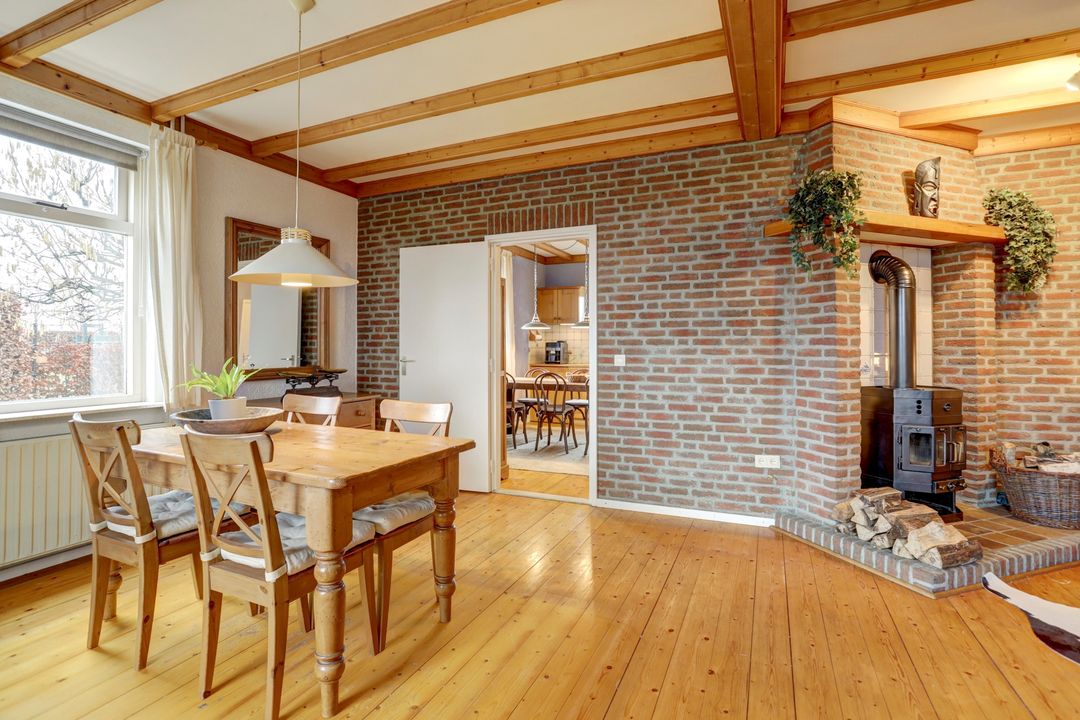 De woonkamer is royaal en licht met drie ramen en bovenlichten die op kiepstand kunnen voor frisse lucht. Hier is alle ruimte voor een comfortabele zithoek bij de houtkachel, een grote eettafel voor lange avonden met familie en vrienden of een speelhoek voor de kinderen. Een charmant detail is het halfronde raampje dat een speelse doorkijk naar de hal biedt. Ook hier versterken de houten vloeren, het balkenplafond en de muren van schoon metselwerk de karakteristieke, landelijke sfeer.