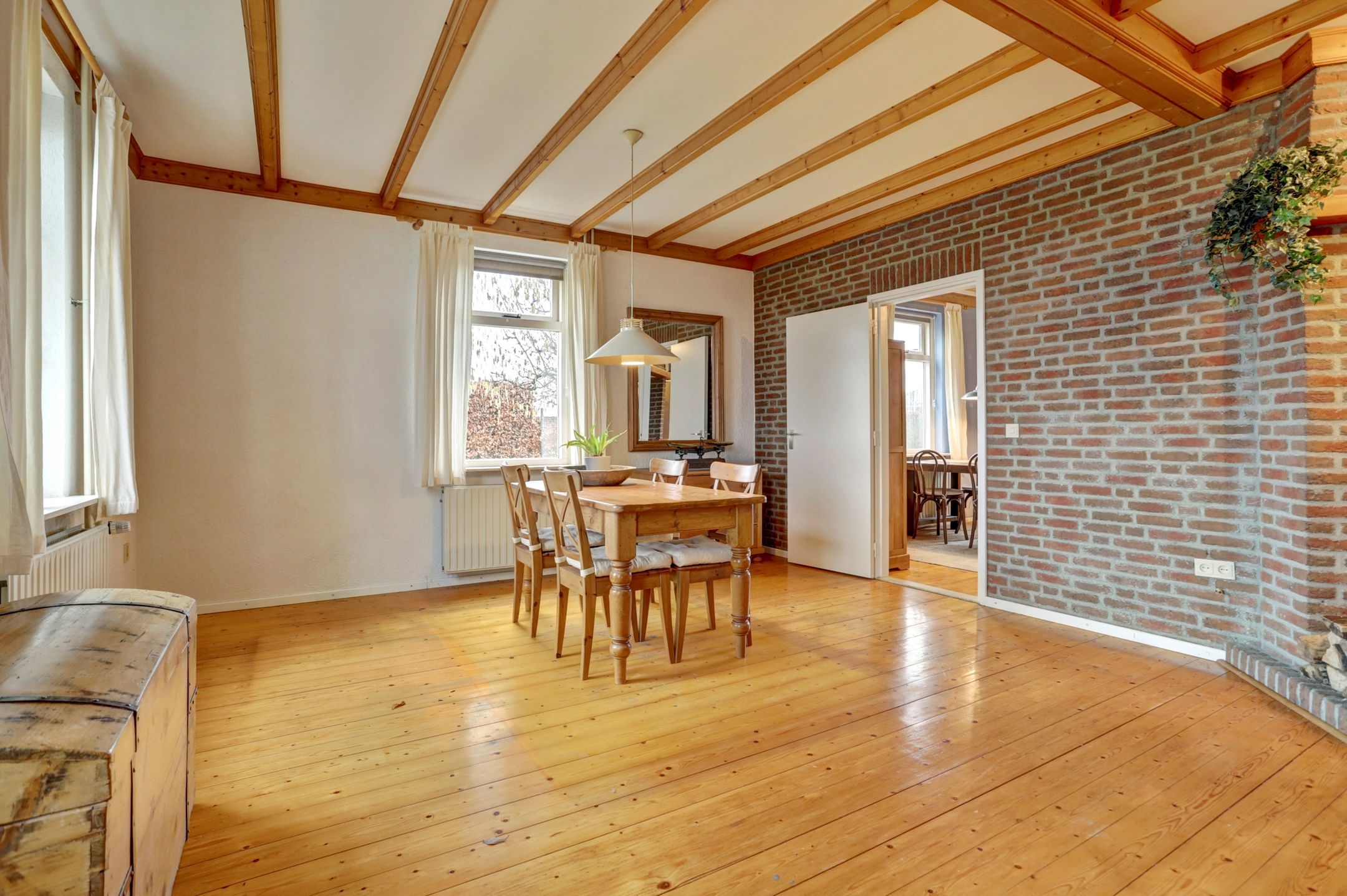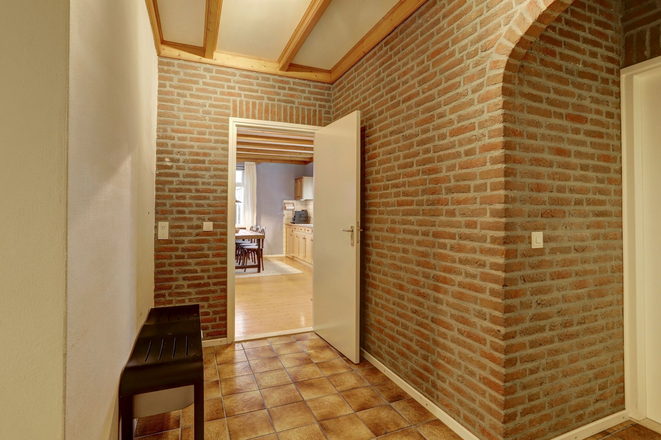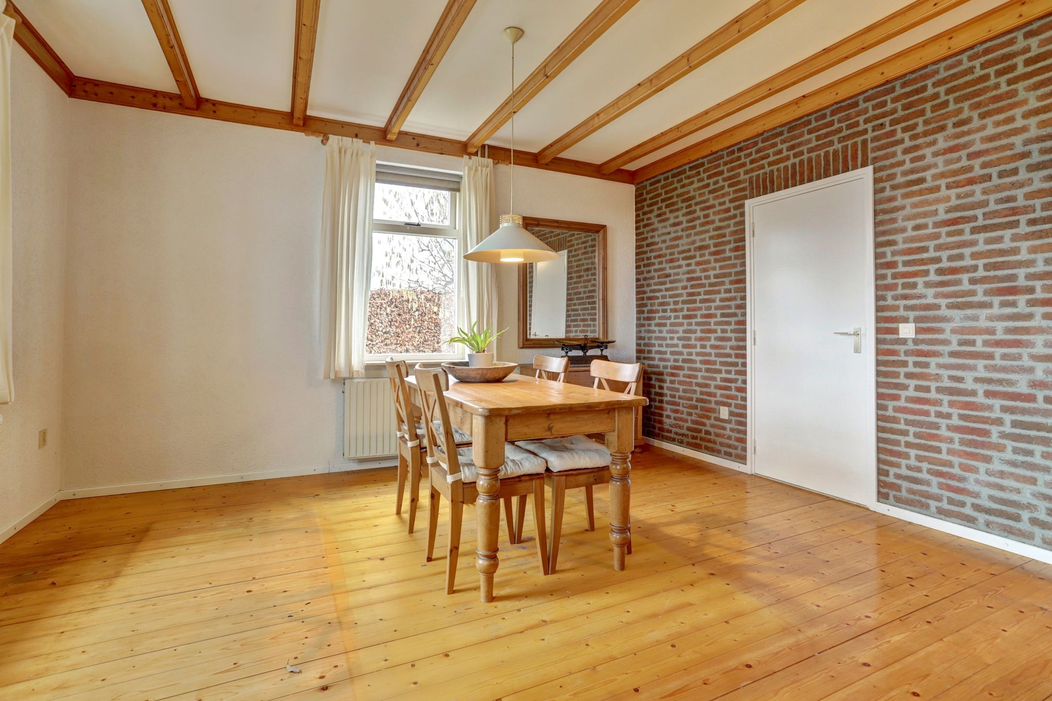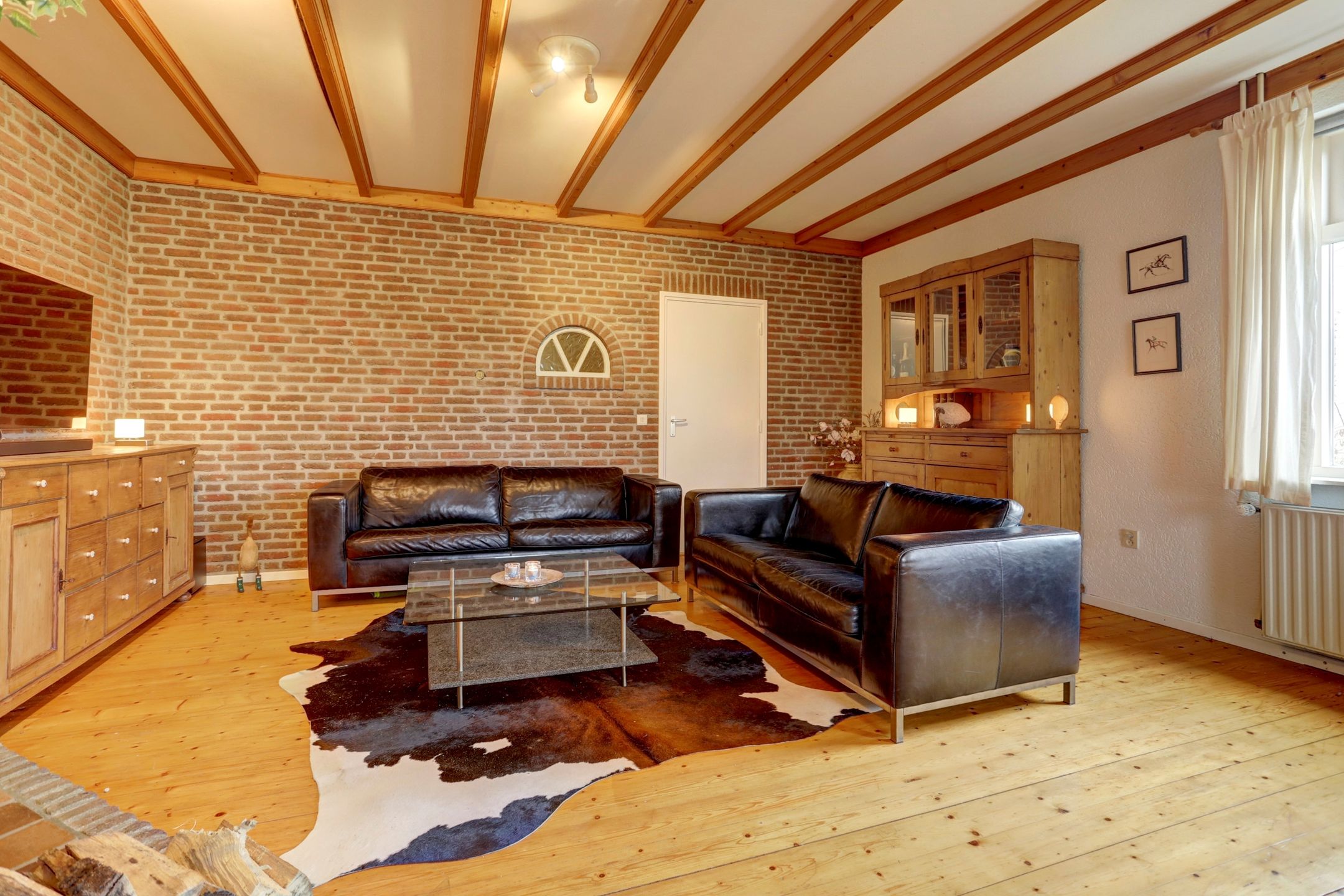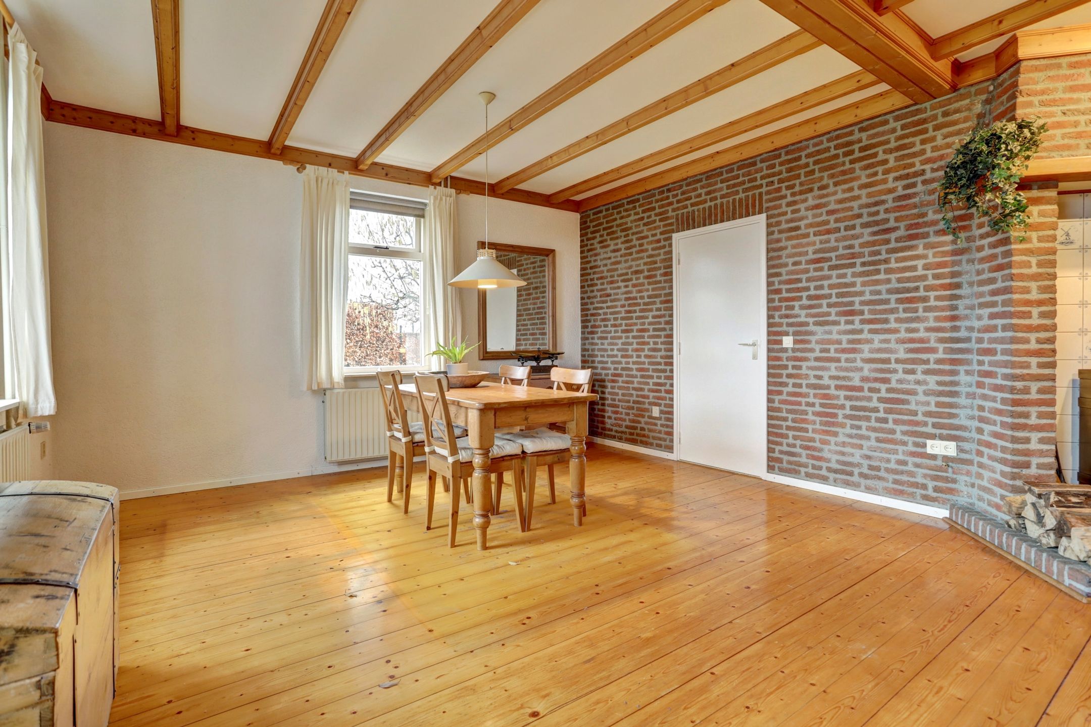 De woonkamer is royaal en licht met drie ramen en bovenlichten die op kiepstand kunnen voor frisse lucht. Hier is alle ruimte voor een comfortabele zithoek bij de houtkachel, een grote eettafel voor lange avonden met familie en vrienden of een speelhoek voor de kinderen. Een charmant detail is het halfronde raampje dat een speelse doorkijk naar de hal biedt. Ook hier versterken de houten vloeren, het balkenplafond en de muren van schoon metselwerk de karakteristieke, landelijke sfeer.