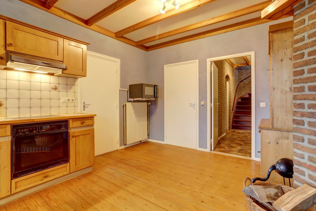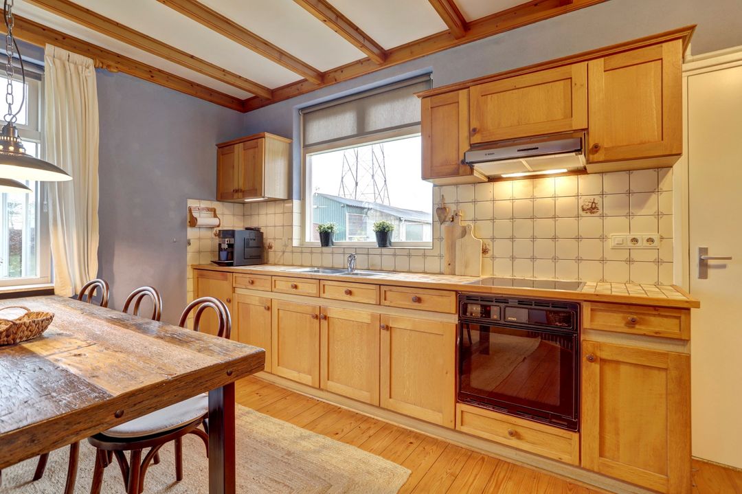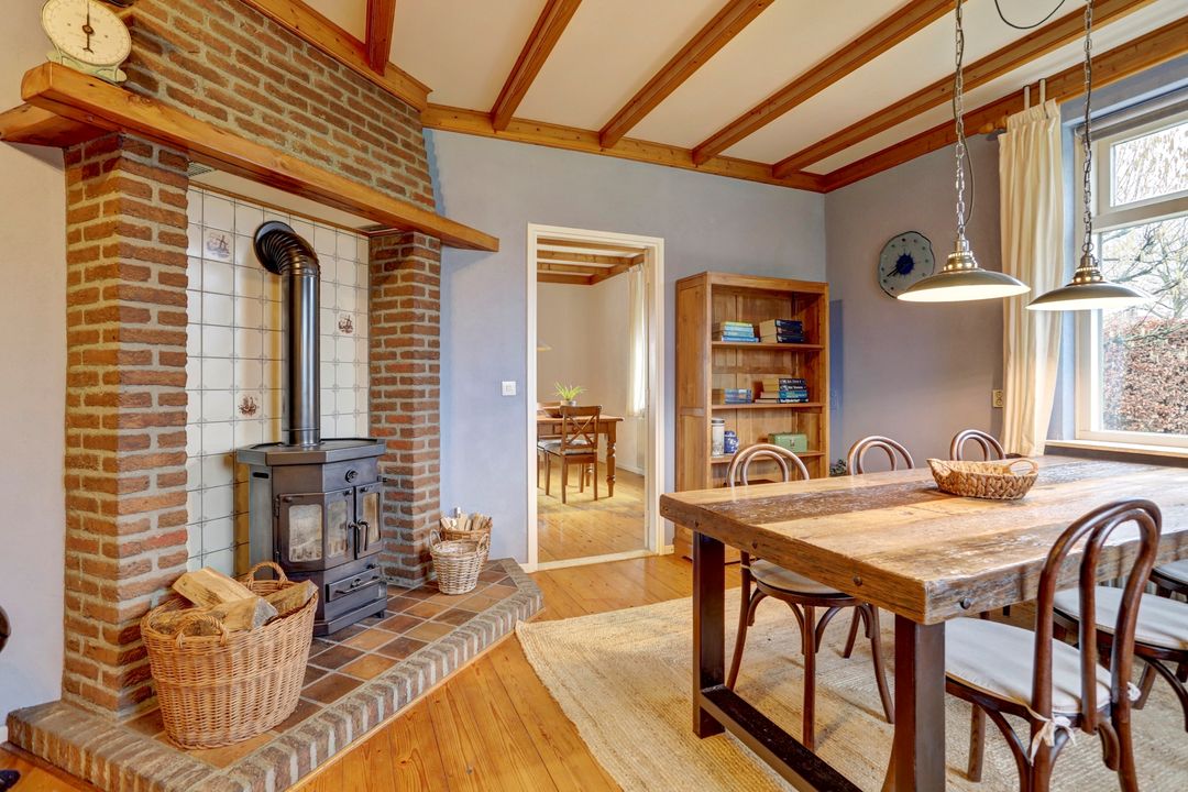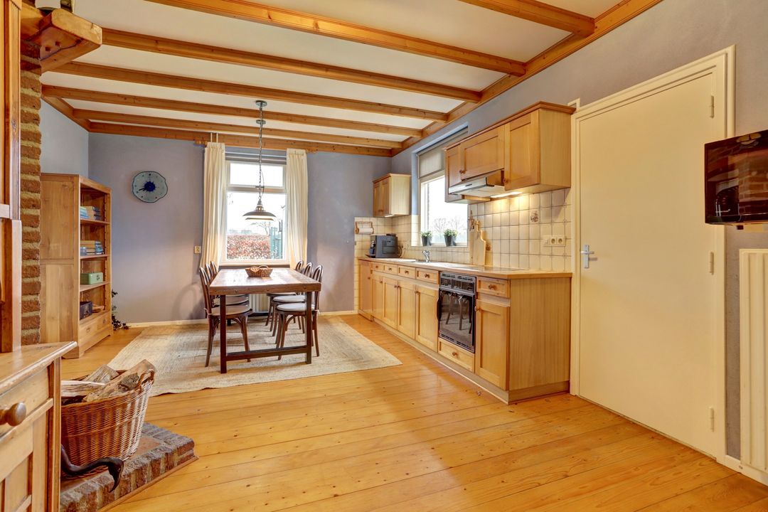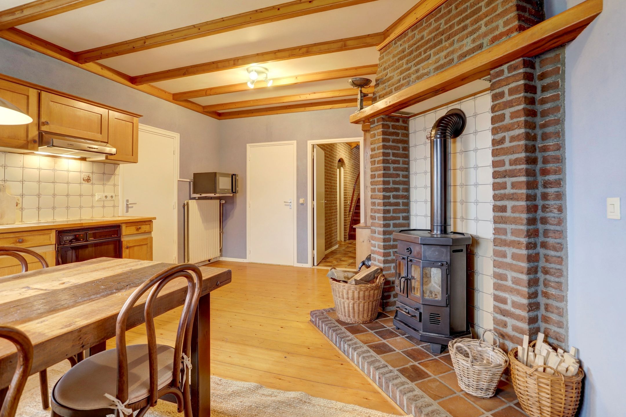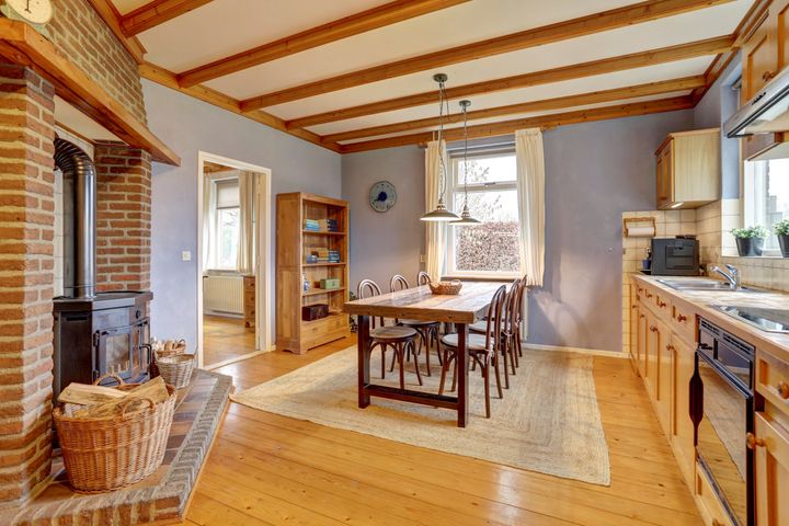Vanuit de bijkeuken loop je door naar de keuken. Deze is goed onderhouden en functioneel, al biedt modernisatie ruimte om er helemaal je eigen draai aan te geven. De eikenhouten keukenkastjes zijn degelijk en tijdloos en het aanrechtblad met kleine tegeltjes is praktisch onverwoestbaar. Je kookt hier op een inductiekookplaat met vier zones en beschikt over een oven voor de dagelijkse maaltijden. Twee ramen geven uitzicht op de tuin en het eigen weiland. De houten vloer, het balkenplafond en de houtkachel met authentieke schouw zorgen voor dat echte, warme boerderijgevoel. Vanuit de keuken bereik je bovendien de ruime kelder: ideaal voor het opslaan van provisie, voorraad of wijn.
