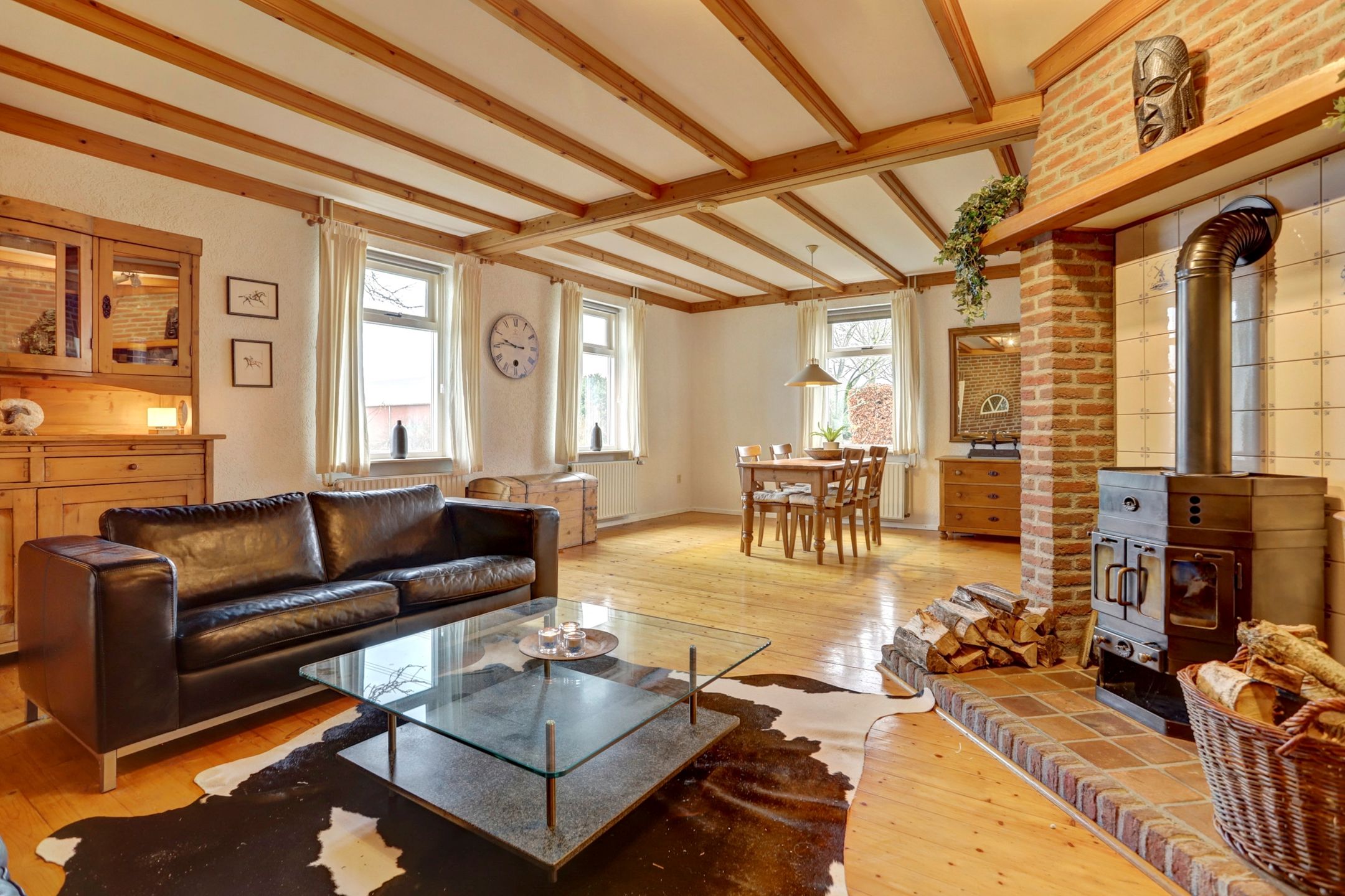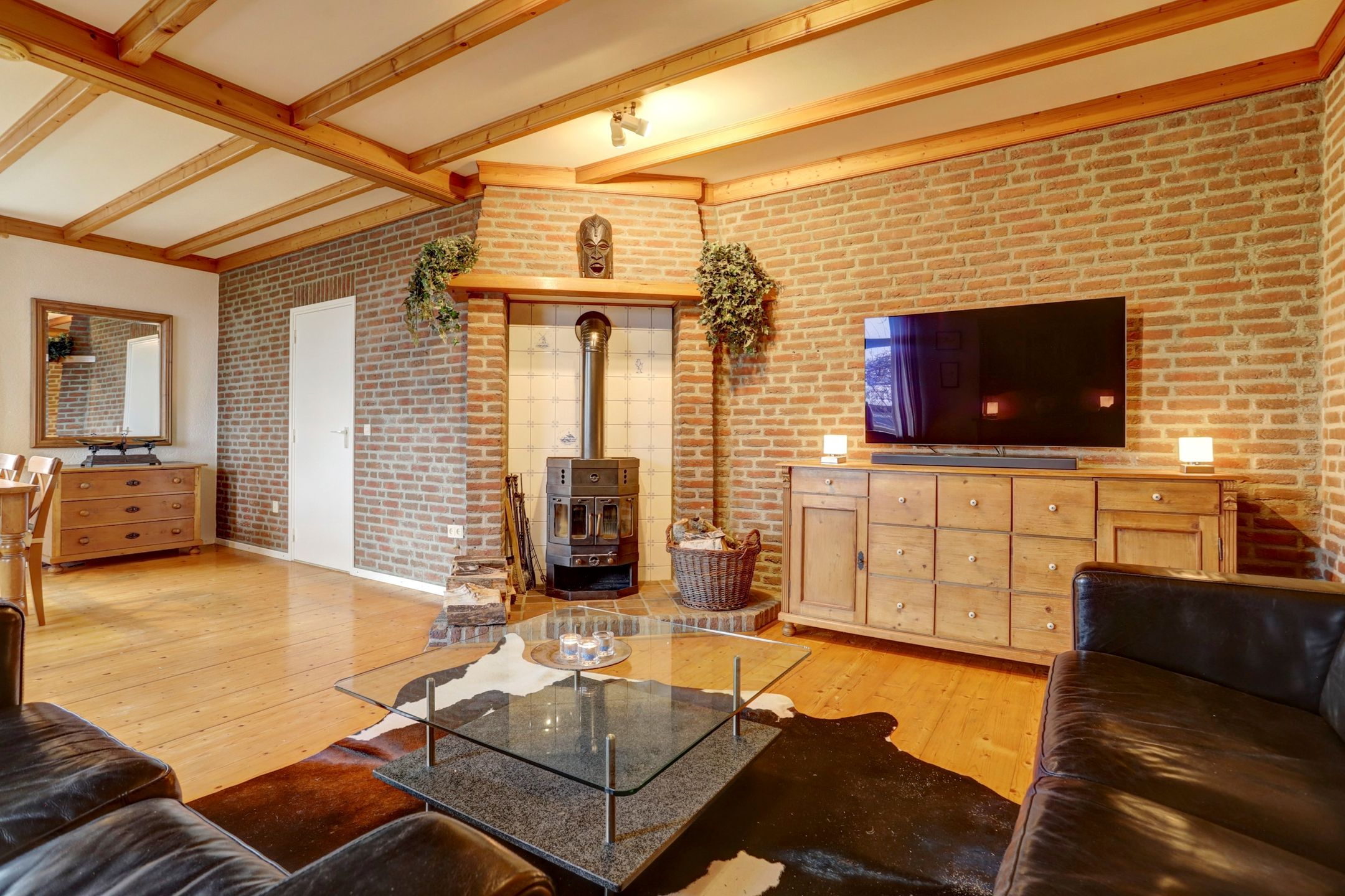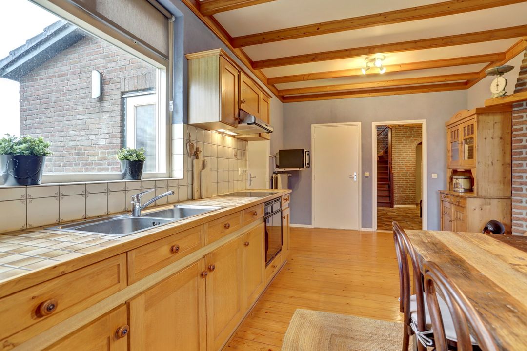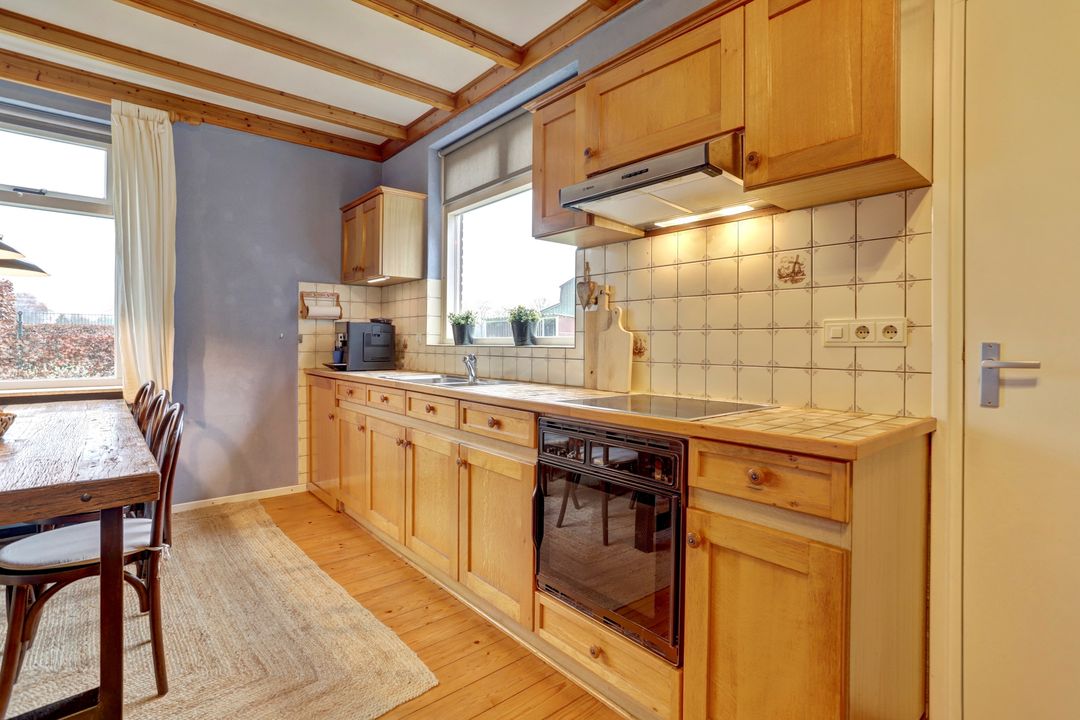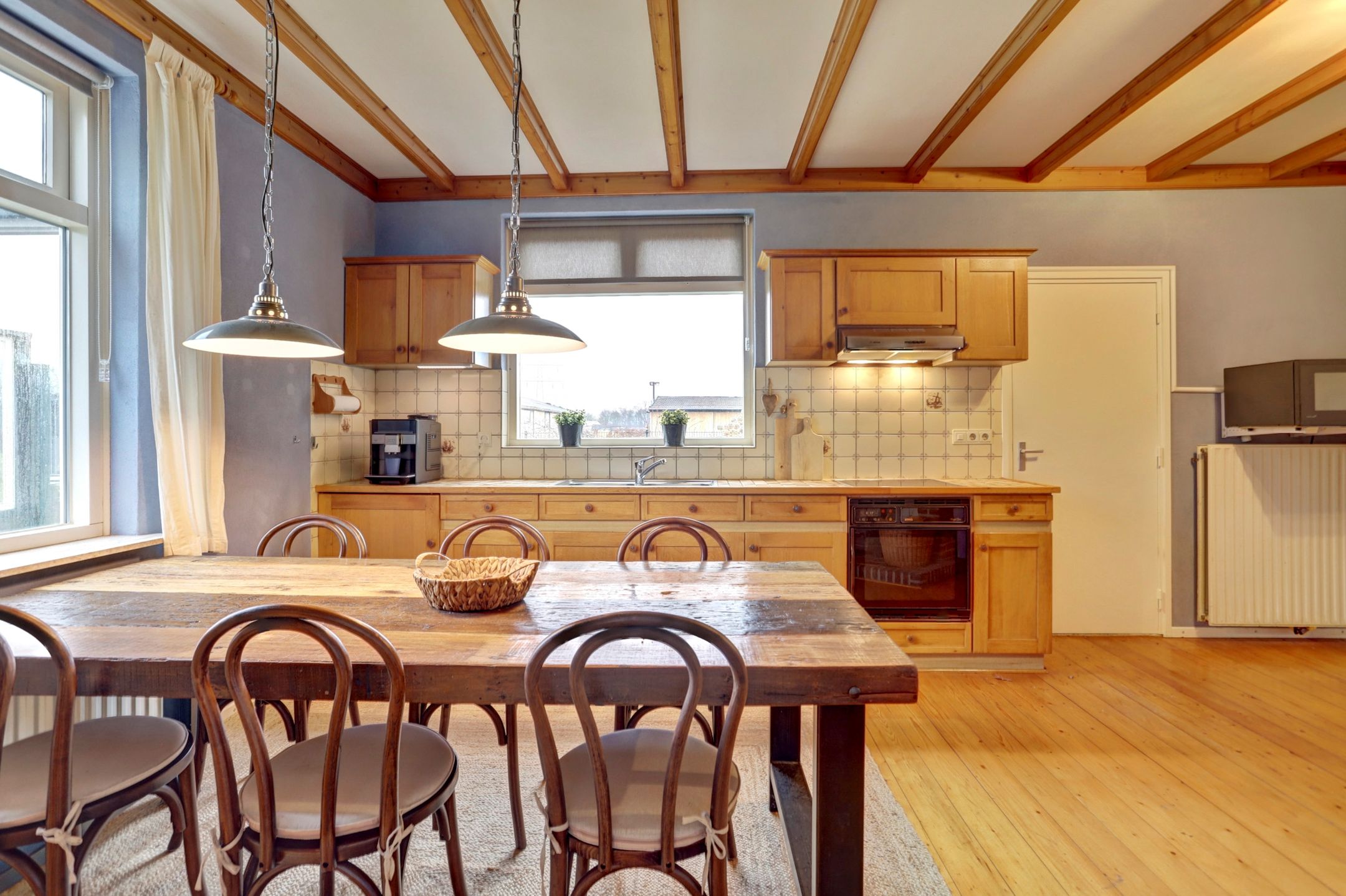 Vanuit de bijkeuken loop je door naar de keuken. Deze is goed onderhouden en functioneel, al biedt modernisatie ruimte om er helemaal je eigen draai aan te geven. De eikenhouten keukenkastjes zijn degelijk en tijdloos en het aanrechtblad met kleine tegeltjes is praktisch onverwoestbaar. Je kookt hier op een inductiekookplaat met vier zones en beschikt over een oven voor de dagelijkse maaltijden. Twee ramen geven uitzicht op de tuin en het eigen weiland. De houten vloer, het balkenplafond en de houtkachel met authentieke schouw zorgen voor dat echte, warme boerderijgevoel. Vanuit de keuken bereik je bovendien de ruime kelder: ideaal voor het opslaan van provisie, voorraad of wijn.