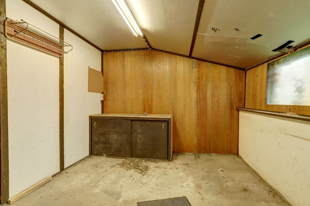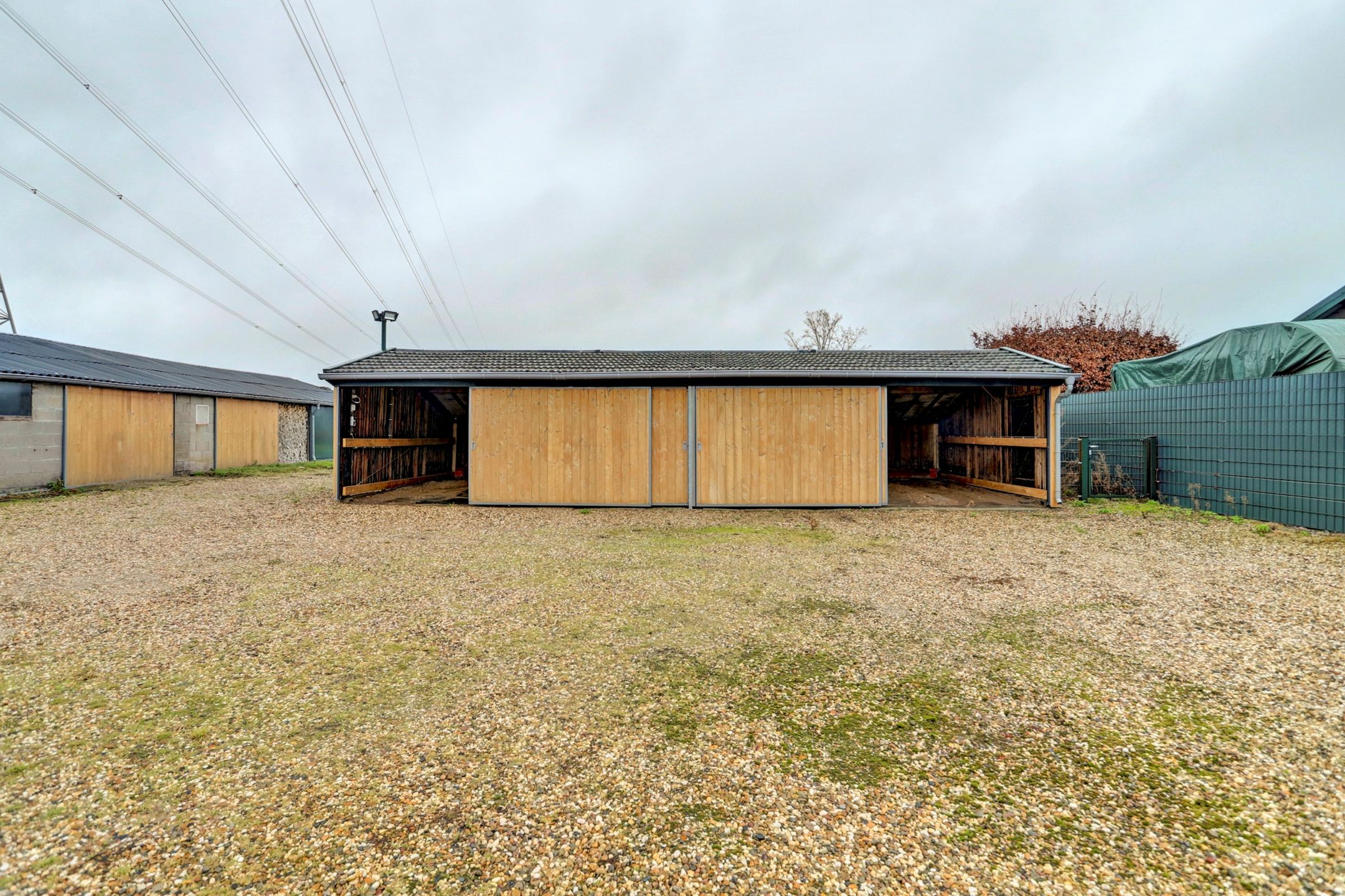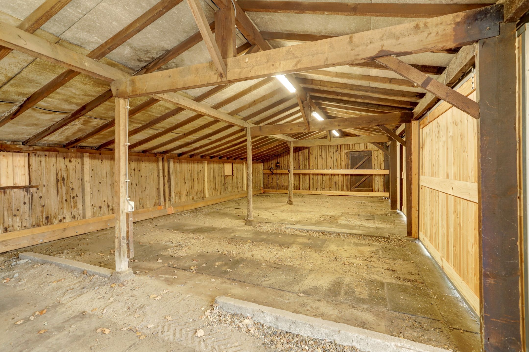 Het tweede gebouw is eenvoudiger van opzet, maar minstens zo praktisch. Dit bestaat uit één grote open ruimte met vier houten schuifdeuren. Ideaal voor het droog en veilig stallen van auto’s, machines, aanhangers of ander materieel.