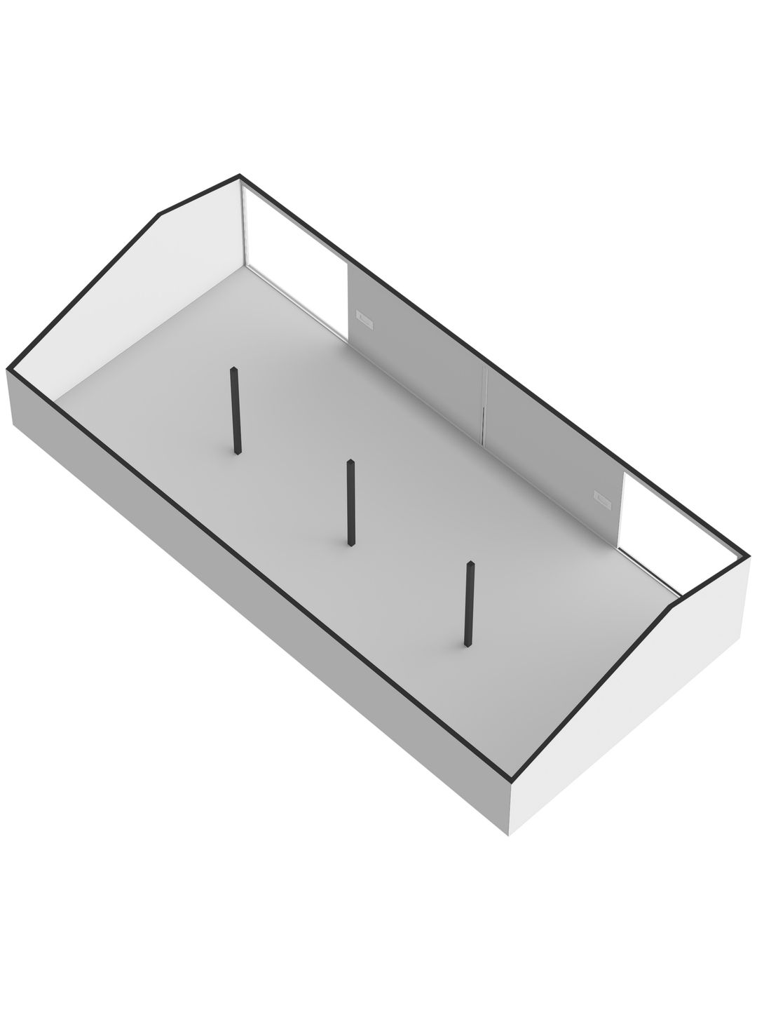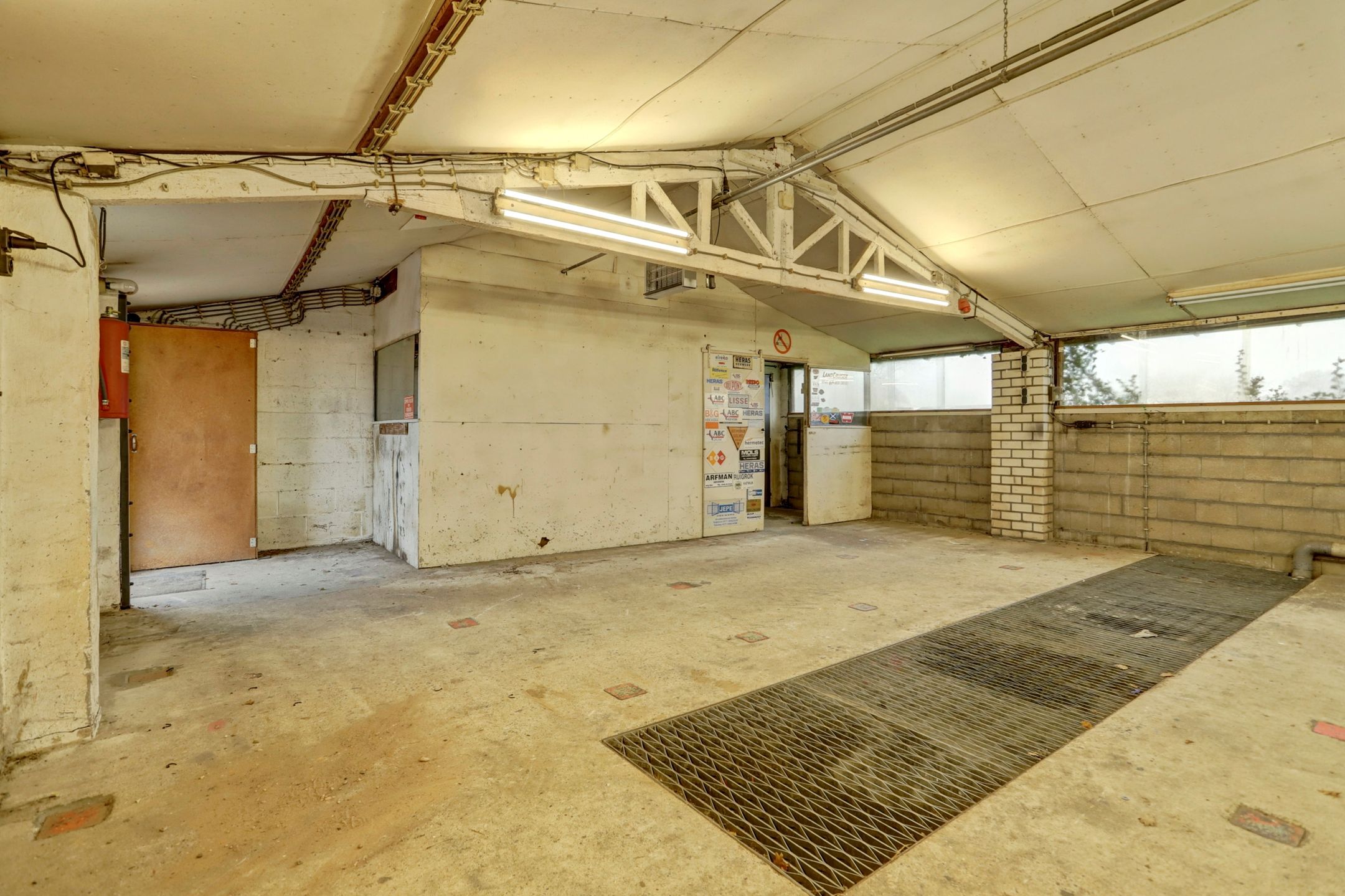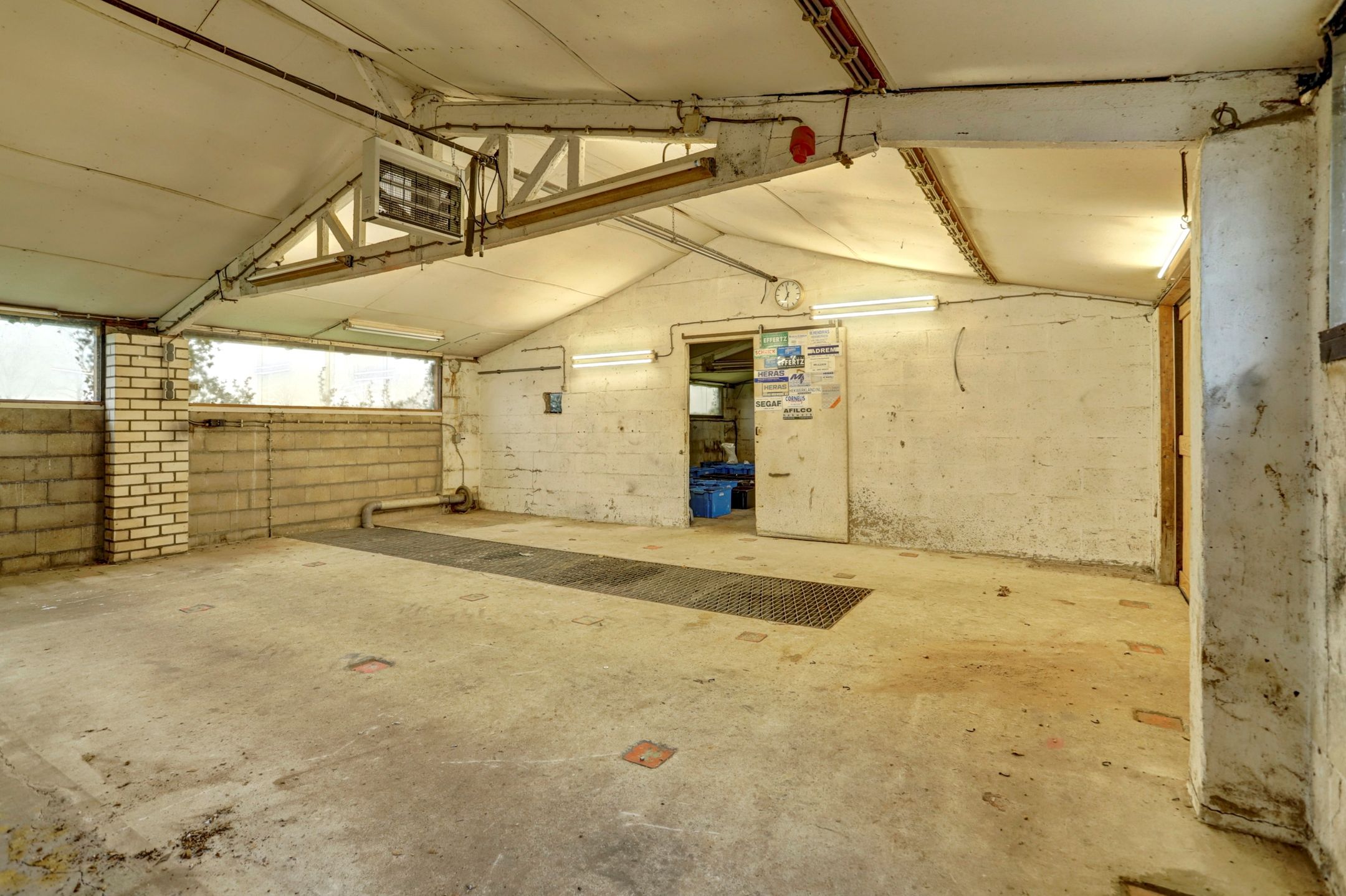 Het tweede gebouw is eenvoudiger van opzet, maar minstens zo praktisch. Dit bestaat uit één grote open ruimte met vier houten schuifdeuren. Ideaal voor het droog en veilig stallen van auto’s, machines, aanhangers of ander materieel.