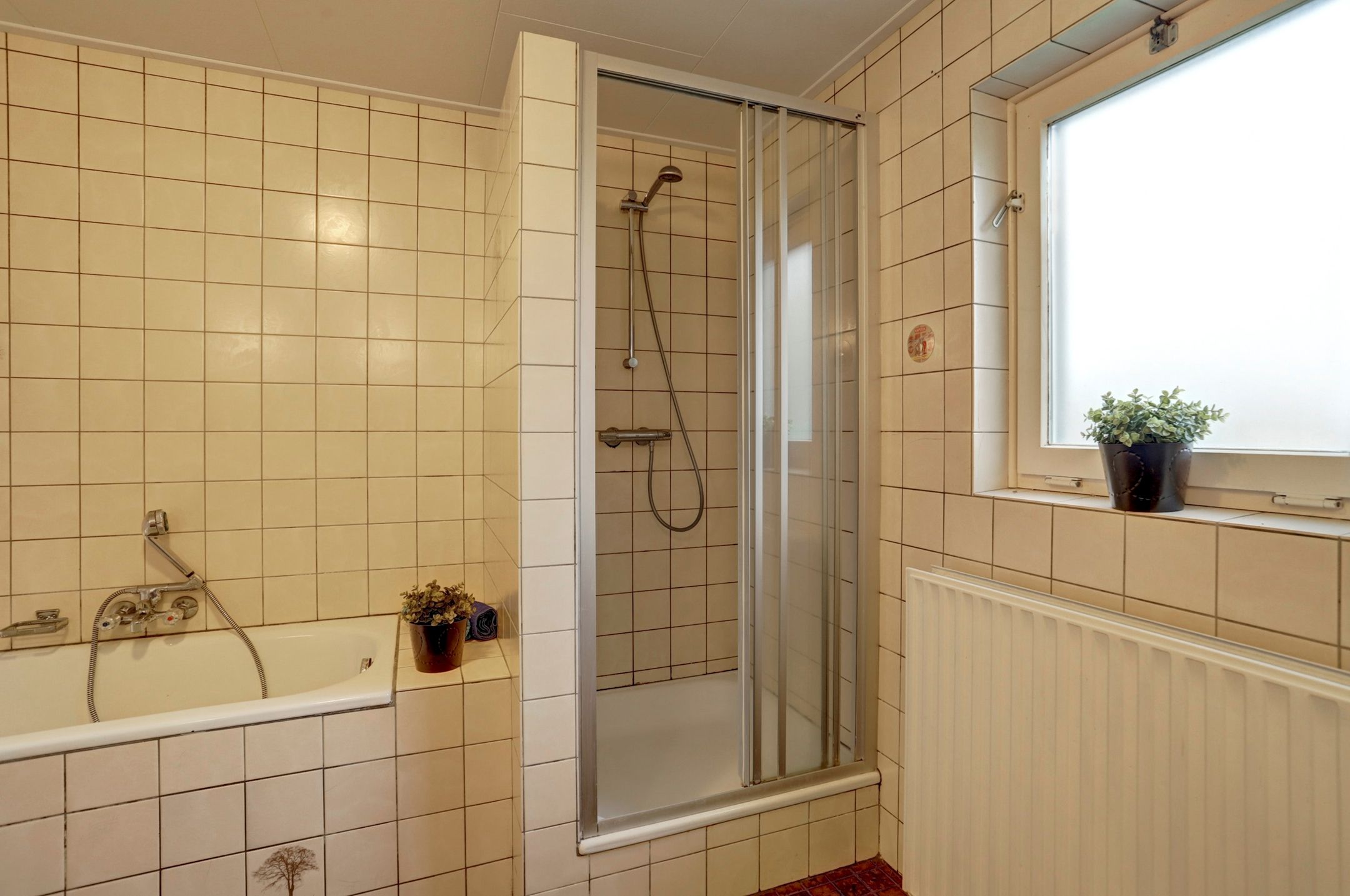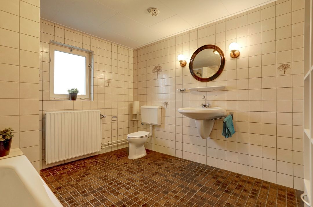 De badkamer ligt eveneens op de begane grond. Deze is netjes en functioneel, maar biedt de mogelijkheid om naar eigen smaak te moderniseren. Je beschikt hier over zowel een douche als een ligbad, een wastafel en een toilet. De afwerking met lichte wandtegels en donkere vloertegeltjes geeft de ruimte een neutrale uitstraling.