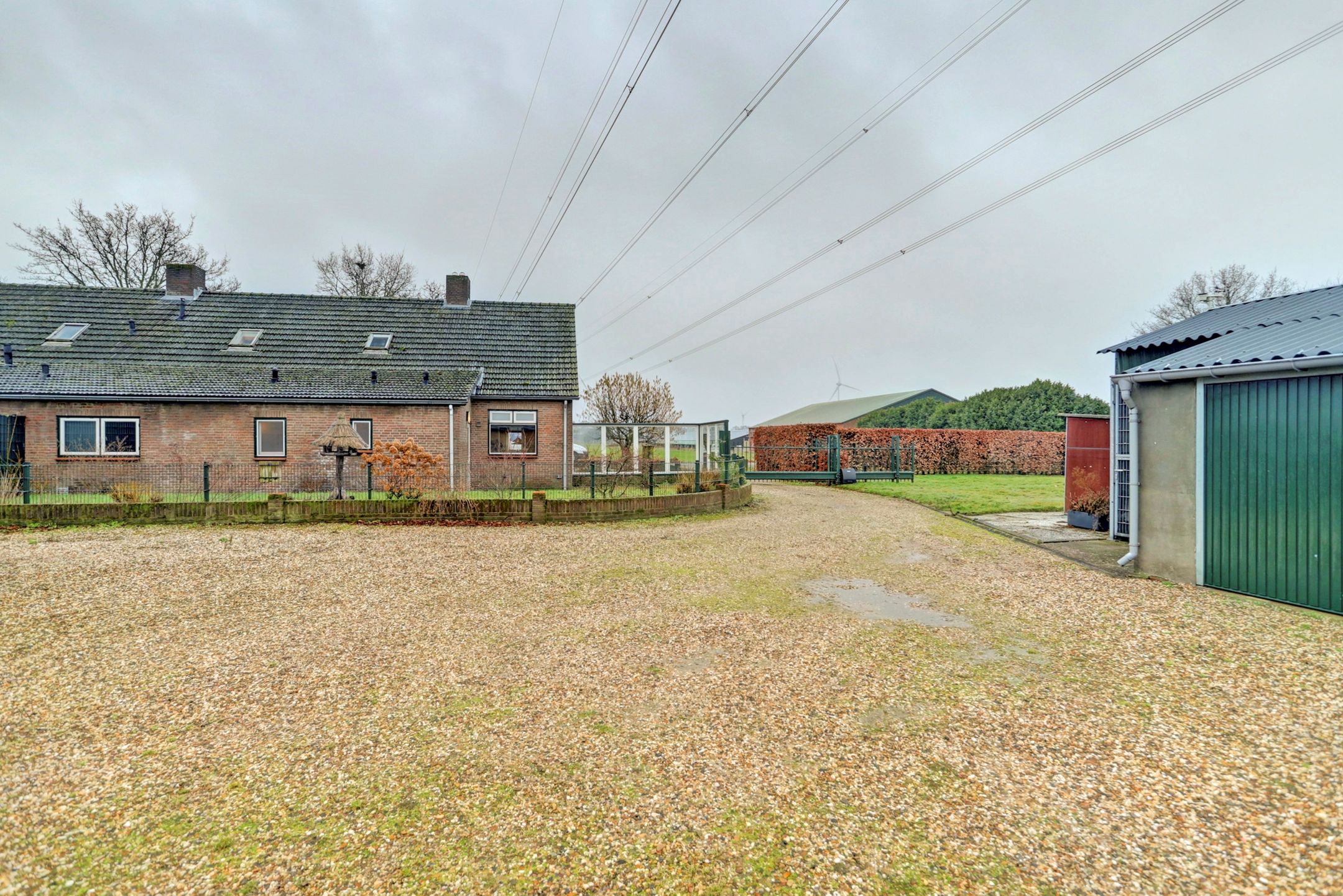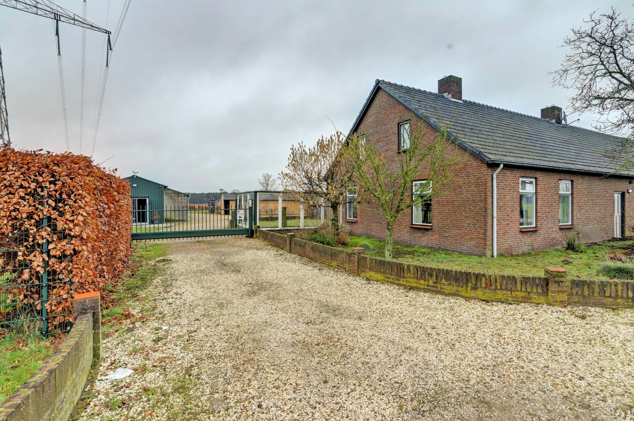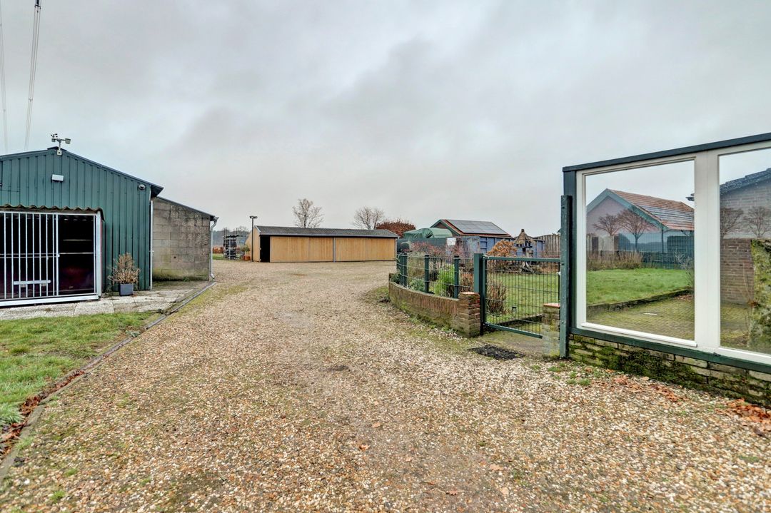Naast de woning loopt een brede oprit van kiezelstenen die niet alleen zorgt voor een landelijke uitstraling maar ook volop parkeerruimte biedt. De oprit voert door naar de twee grote buitengebouwen. Het gehele terrein is rondom afgesloten met een hekwerk van gaas en stroomdraad en bereikbaar via een elektrisch te bedienen stalen schuifpoort, praktisch en veilig.