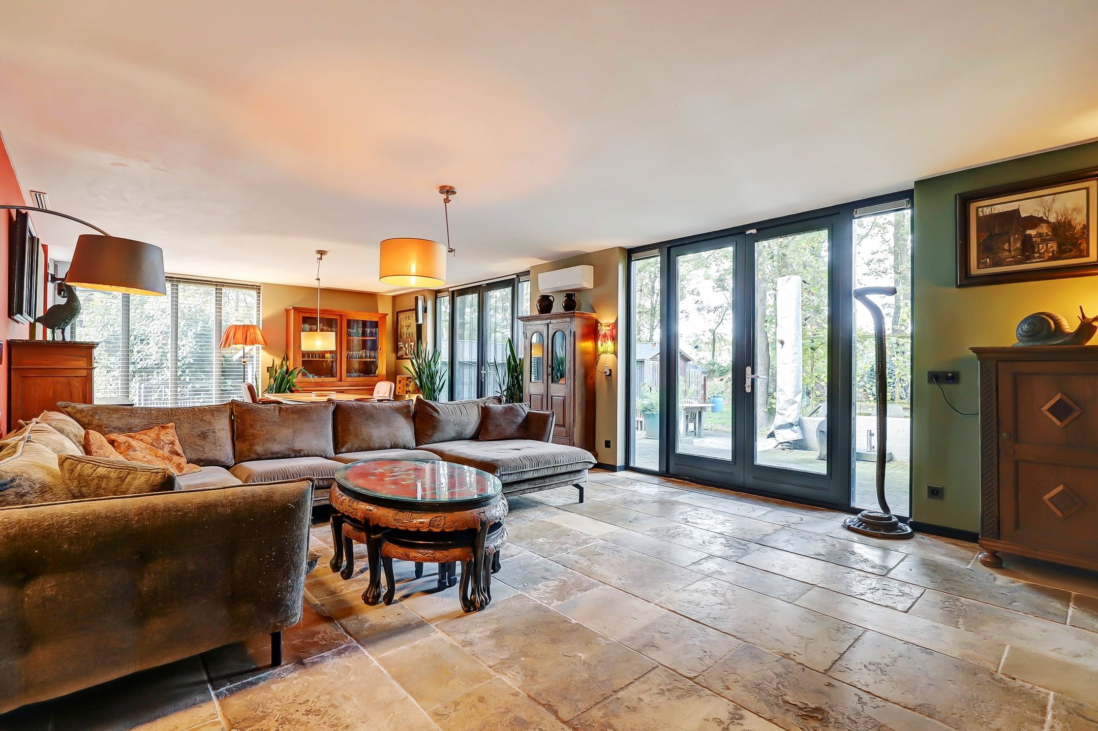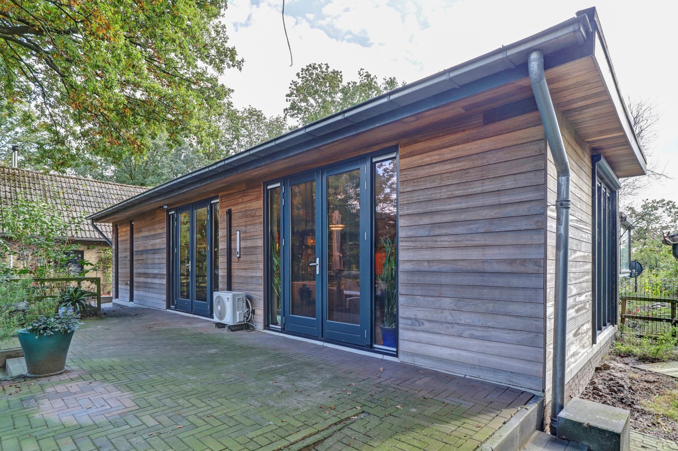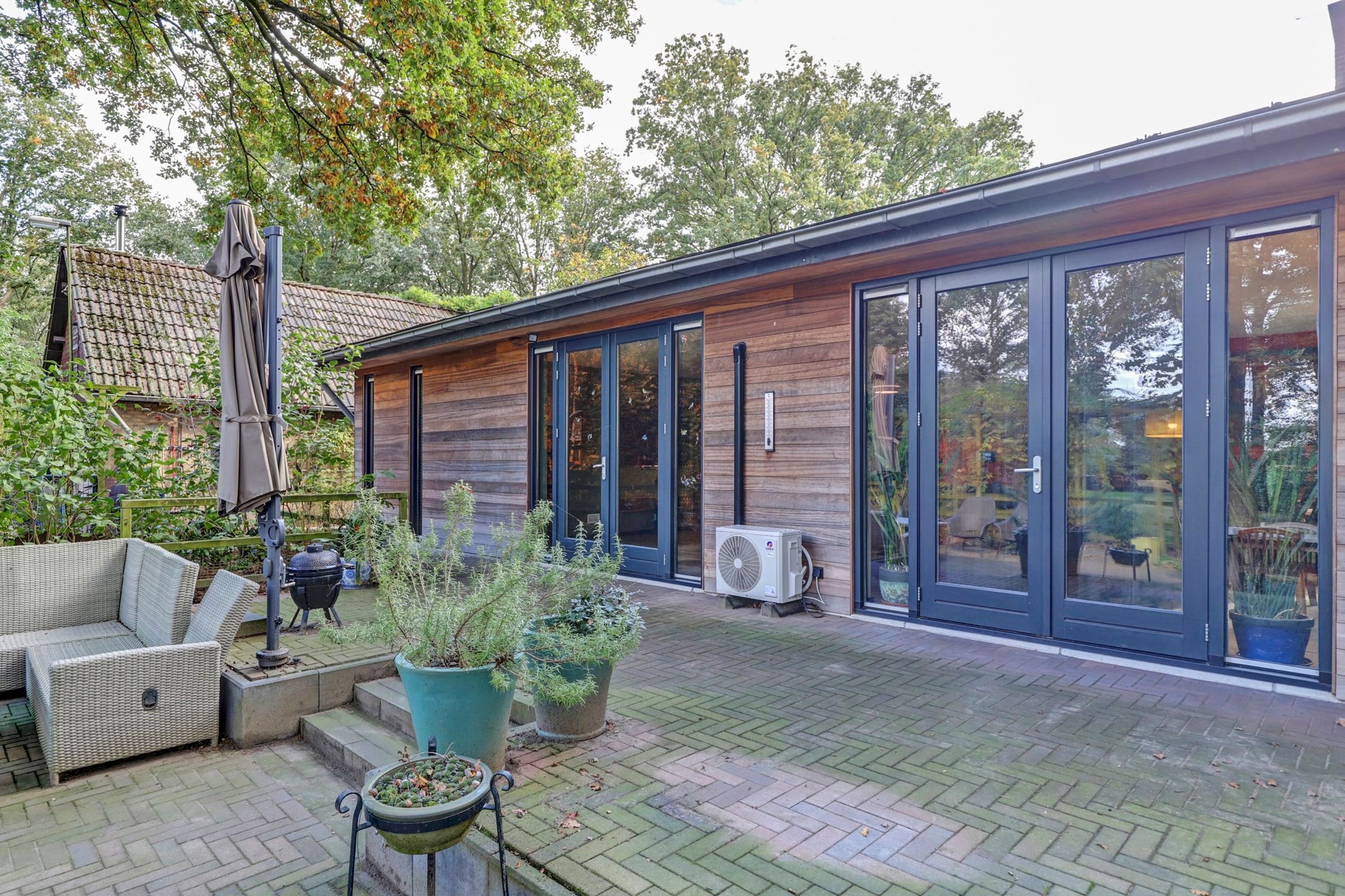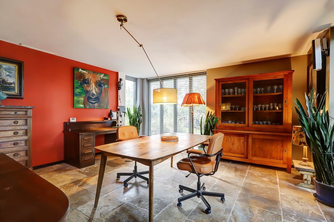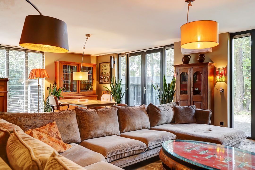 Het grootste gedeelte van de woonkamer is in 2019 aangebouwd. De vele ramen en twee keer dubbel openslaande deuren zorgen niet alleen voor veel daglicht maar ook voor een mooi uitzicht over de tuin en makkelijk toegang tot het terras. In de woonkamer is een vaste airco aanwezig die niet alleen kan koelen maar ook kan verwarmen. In het aangebouwde deel is daarnaast ook vloerverwarming aanwezig.