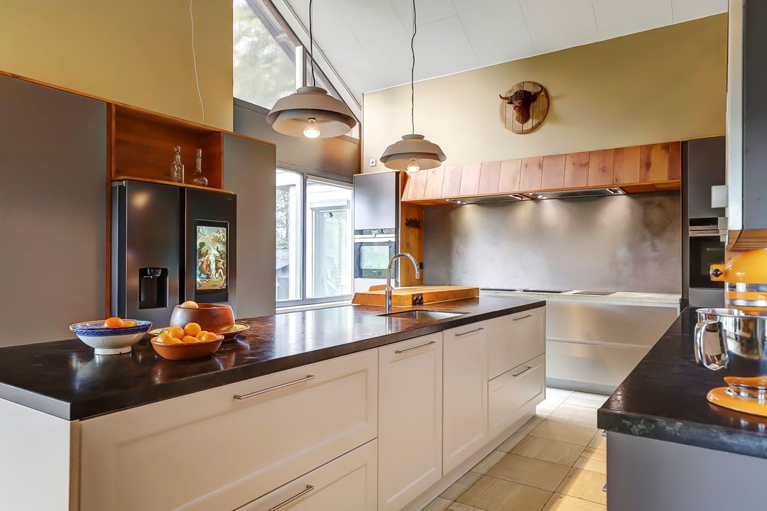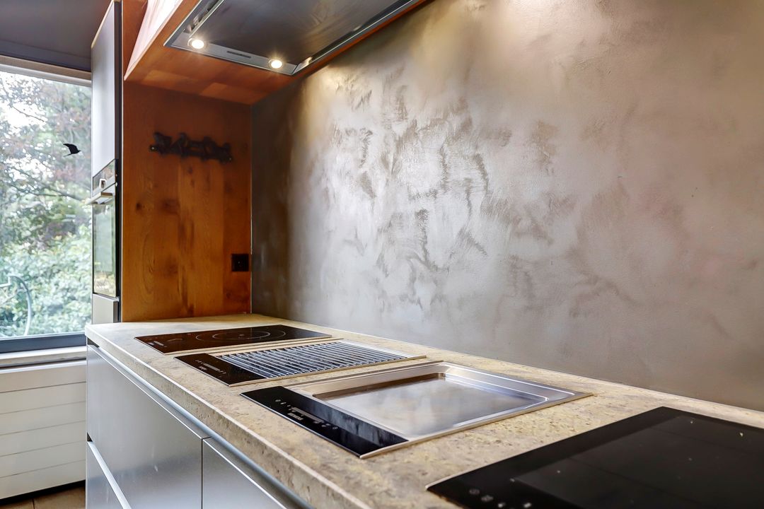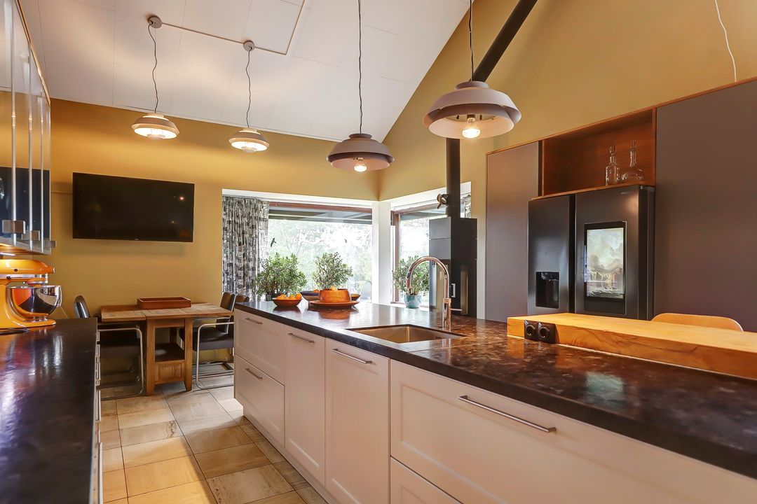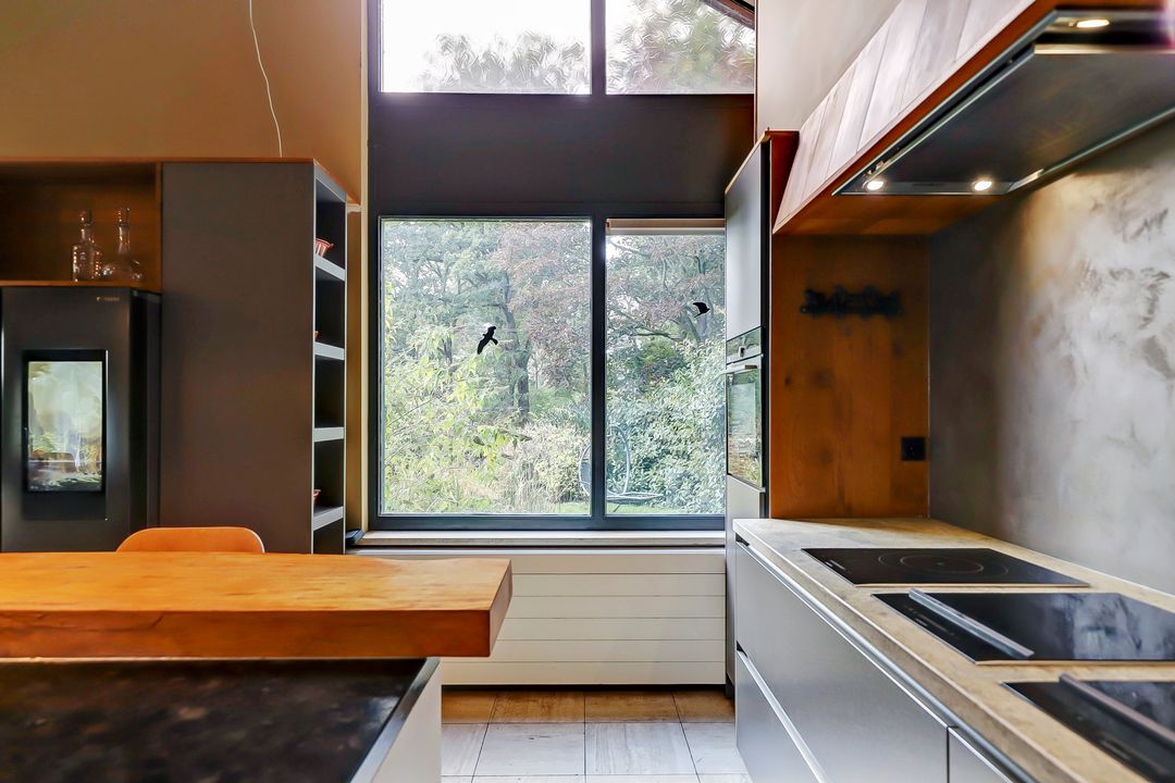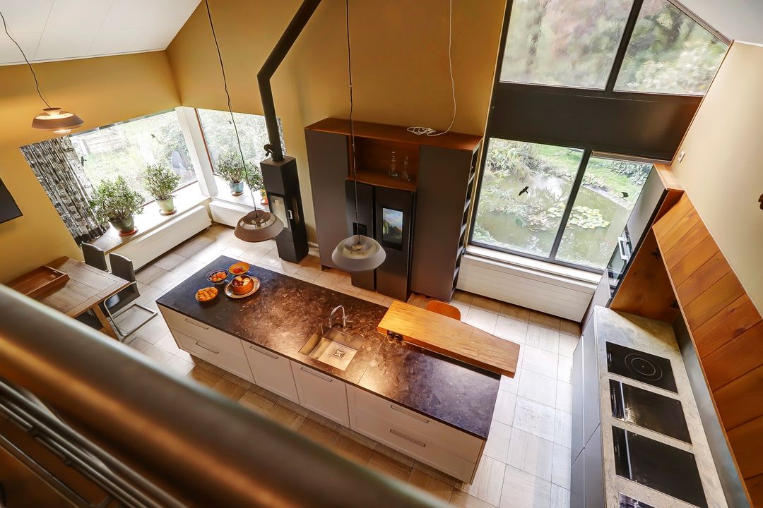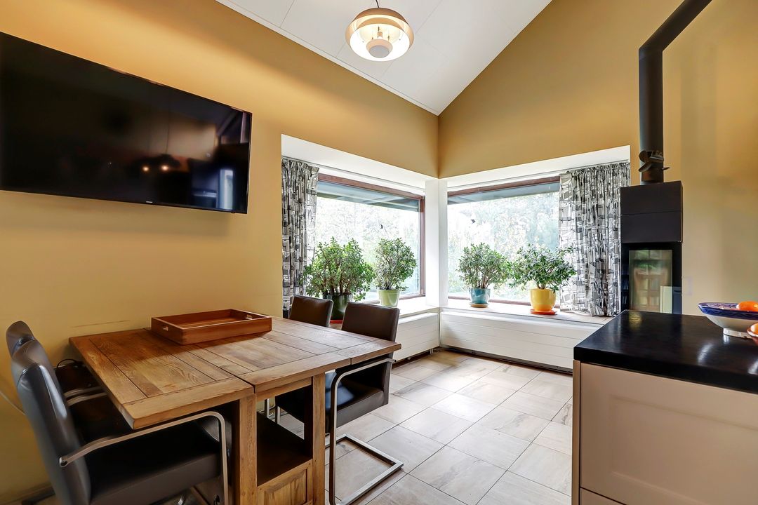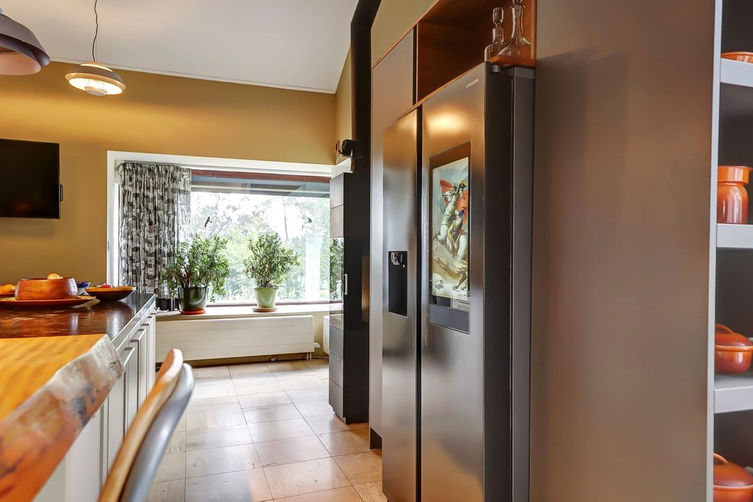 Als je verder de woning in loopt kom je eerst in de keuken. Bij de eerste aanblik zie je meteen dat dit niet zomaar een keuken is maar dat je hier de beschikking hebt over alle luxe en comfort die er maar te bedenken is. Te beginnen met het kookgedeelte: naast twee grote inductieplaten is er ook een barbecue aanwezig en een teppanyakiplaat. Wil je liever iets uit de oven klaarmaken? Dat kan in de combi-oven of in de stoomoven. Kokend water haal je gemakkelijk uit de Quooker kraan. Maar de meeste indruk maakt ongetwijfeld de Samsung Family Hub koelkast. Deze smart-koelkast gaat een stapje verder dan alleen maar het koel houden van je eten en drinken. Via het touchscreen kun je een boodschappenlijst maken en delen met je gezinsleden, je kunt tv kijken en boodschappen bestellen via de apps. Twijfel je tijdens het boodschappen doen of je nog iets vergeten bent? Via de app kun je snel even checken wat er precies in de koelkast ligt. De ingebouwde ijsmachine zorgt ook nog eens dat je snel gekoeld water kunt pakken, ijsblokjes of schaafijs. Verder heb je in deze keuken heel veel opbergmogelijkheden in de grote lades en kasten. Het raam kijkt uit over de vijver naast de woning zodat je tijdens het koken ook nog een leuk uitzicht hebt. De gezellige houtkachel maakt de ruimte helemaal af!