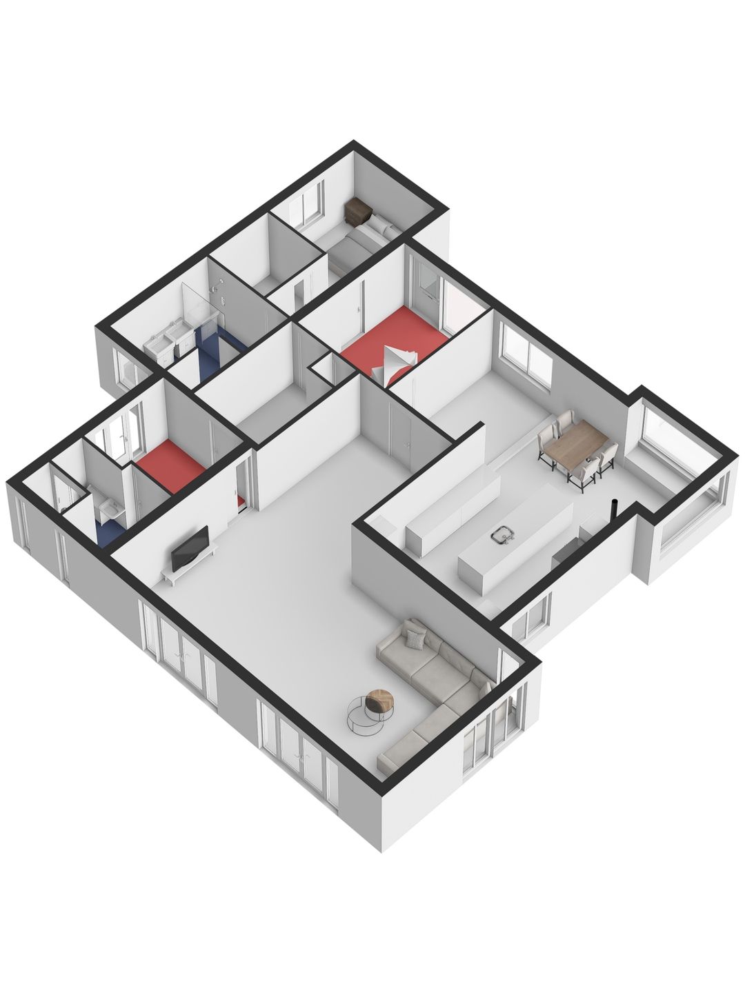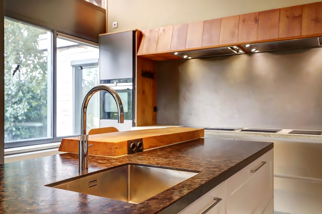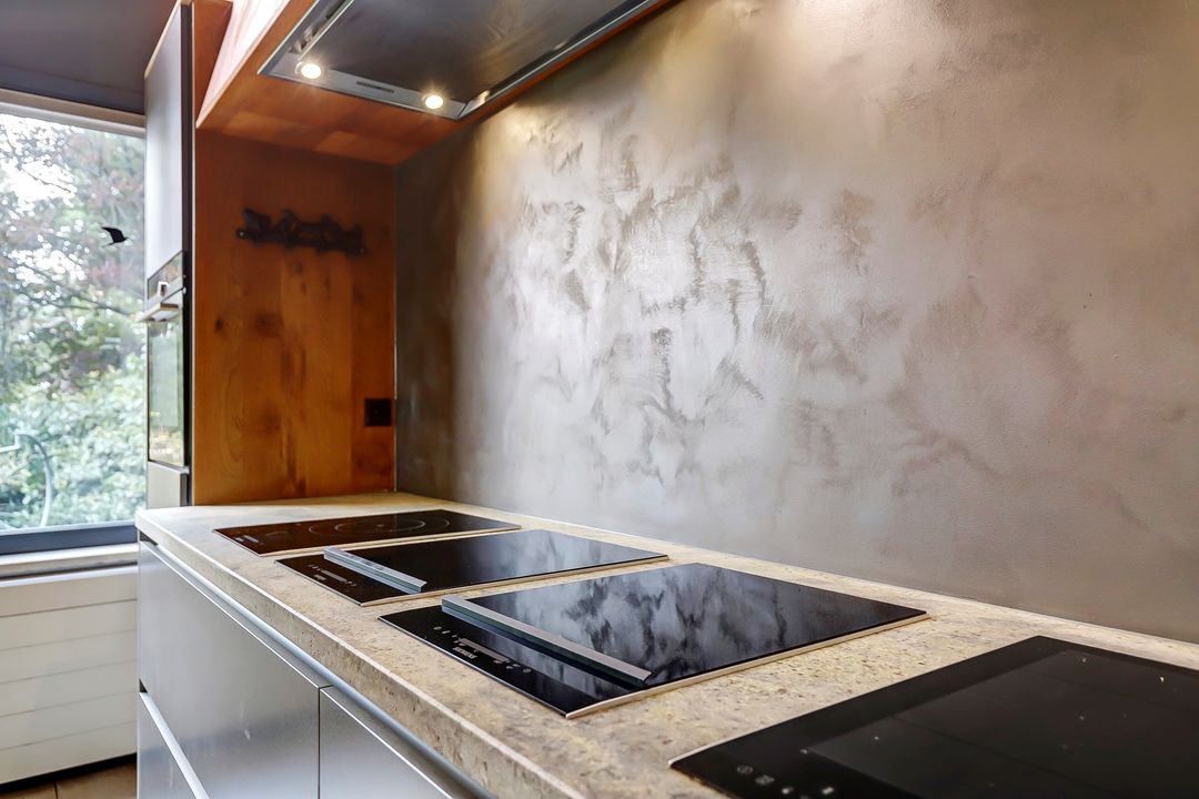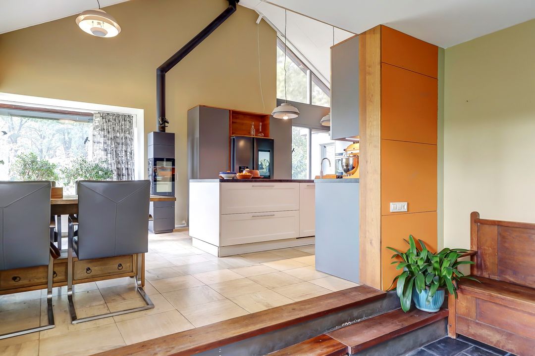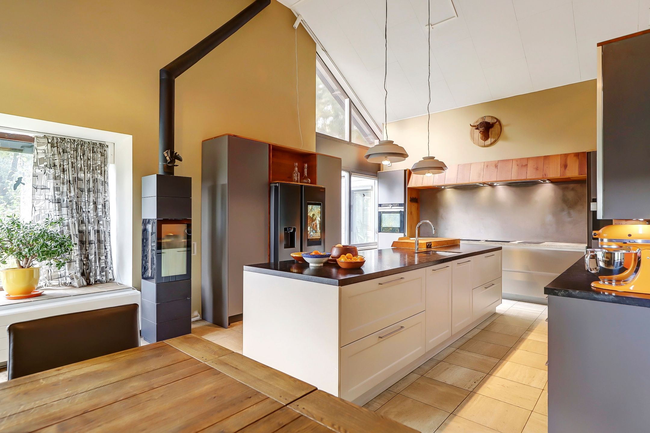 Als je verder de woning in loopt kom je eerst in de keuken. Bij de eerste aanblik zie je meteen dat dit niet zomaar een keuken is maar dat je hier de beschikking hebt over alle luxe en comfort die er maar te bedenken is. Te beginnen met het kookgedeelte: naast twee grote inductieplaten is er ook een barbecue aanwezig en een teppanyakiplaat. Wil je liever iets uit de oven klaarmaken? Dat kan in de combi-oven of in de stoomoven. Kokend water haal je gemakkelijk uit de Quooker kraan. Maar de meeste indruk maakt ongetwijfeld de Samsung Family Hub koelkast. Deze smart-koelkast gaat een stapje verder dan alleen maar het koel houden van je eten en drinken. Via het touchscreen kun je een boodschappenlijst maken en delen met je gezinsleden, je kunt tv kijken en boodschappen bestellen via de apps. Twijfel je tijdens het boodschappen doen of je nog iets vergeten bent? Via de app kun je snel even checken wat er precies in de koelkast ligt. De ingebouwde ijsmachine zorgt ook nog eens dat je snel gekoeld water kunt pakken, ijsblokjes of schaafijs. Verder heb je in deze keuken heel veel opbergmogelijkheden in de grote lades en kasten. Het raam kijkt uit over de vijver naast de woning zodat je tijdens het koken ook nog een leuk uitzicht hebt. De gezellige houtkachel maakt de ruimte helemaal af!
