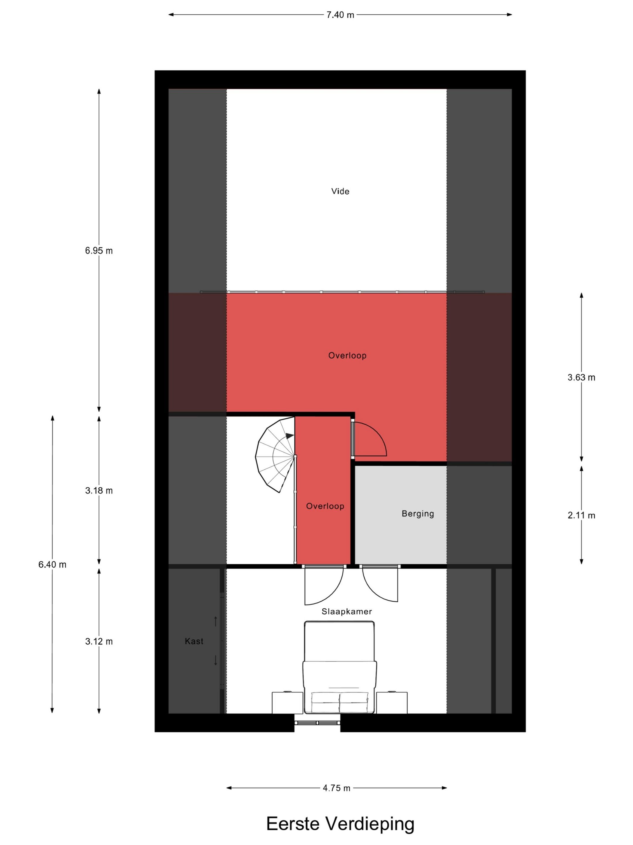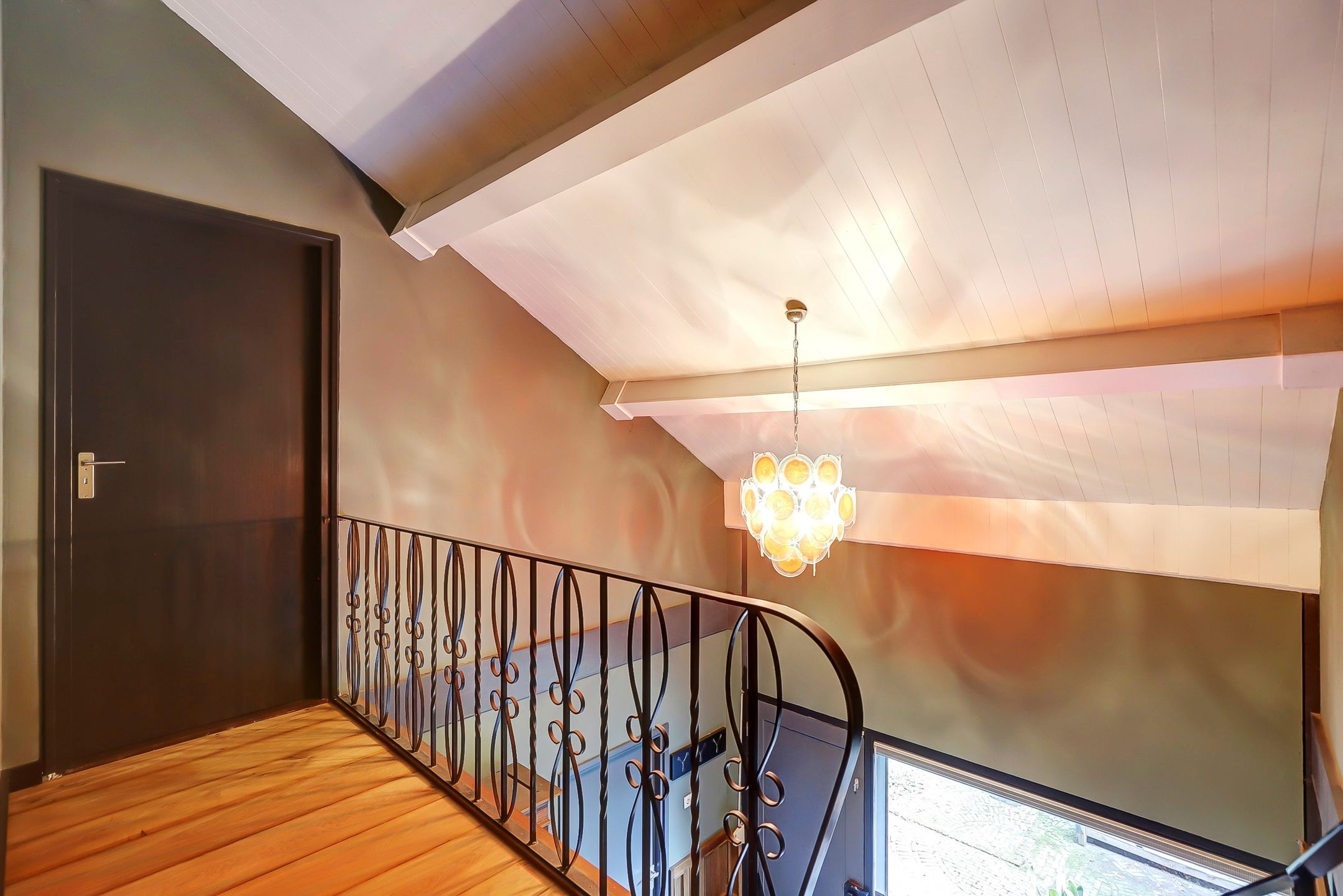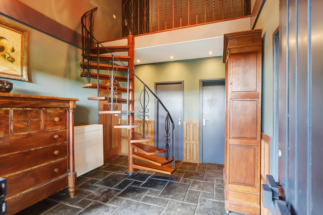 Via de wenteltrap loop je naar de verdieping waar je de beschikking hebt over een vide en een slaapkamer.