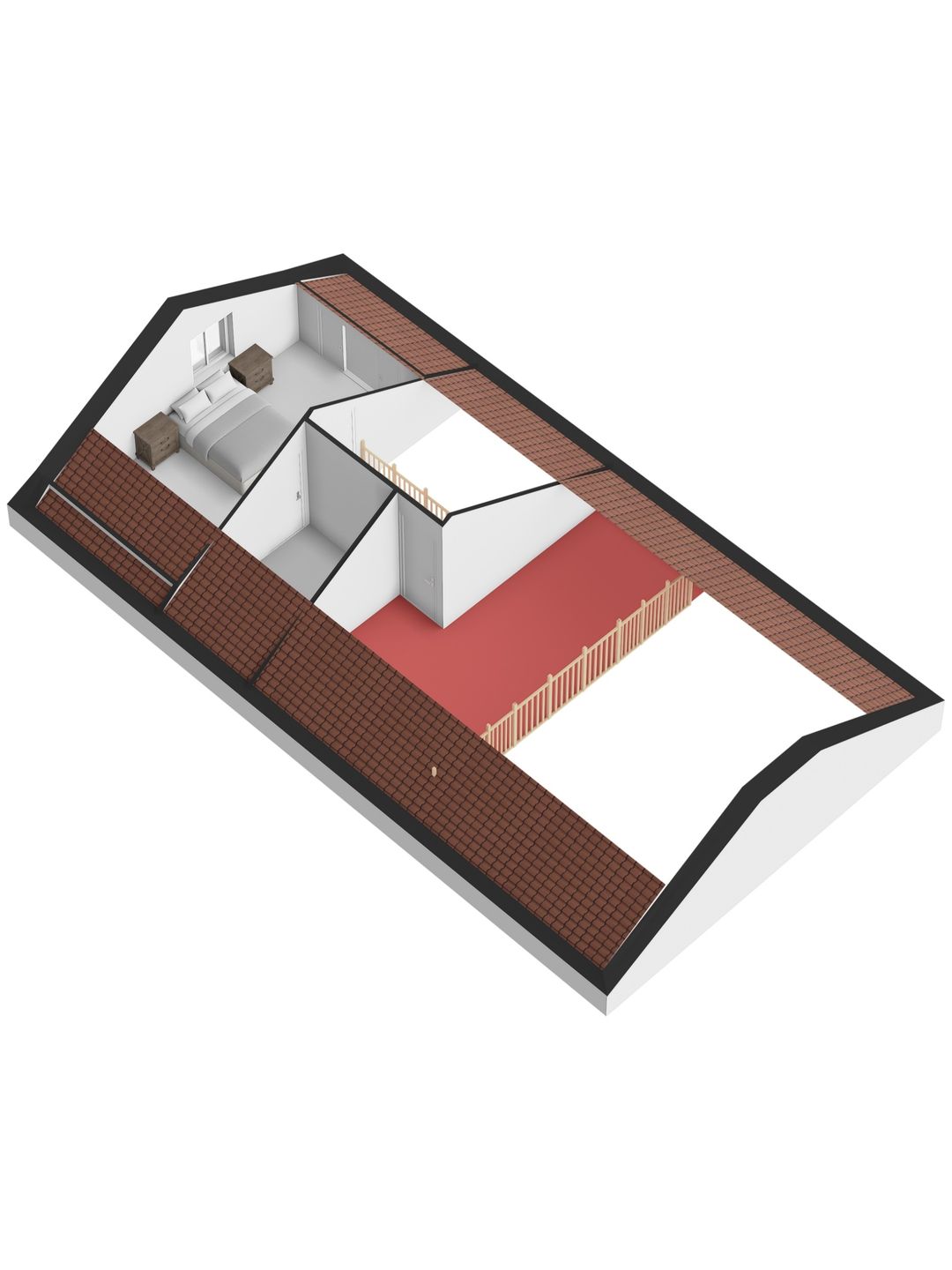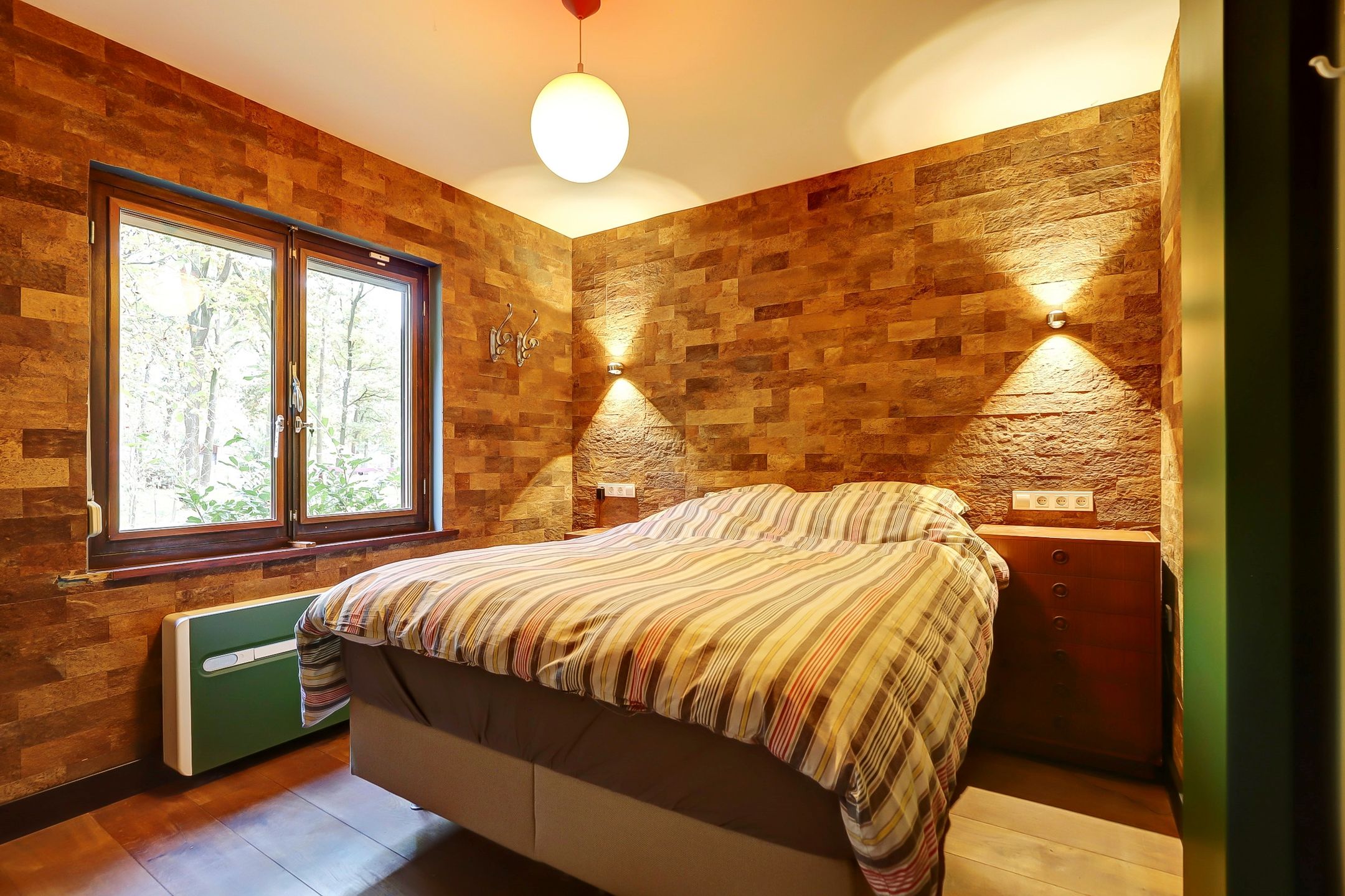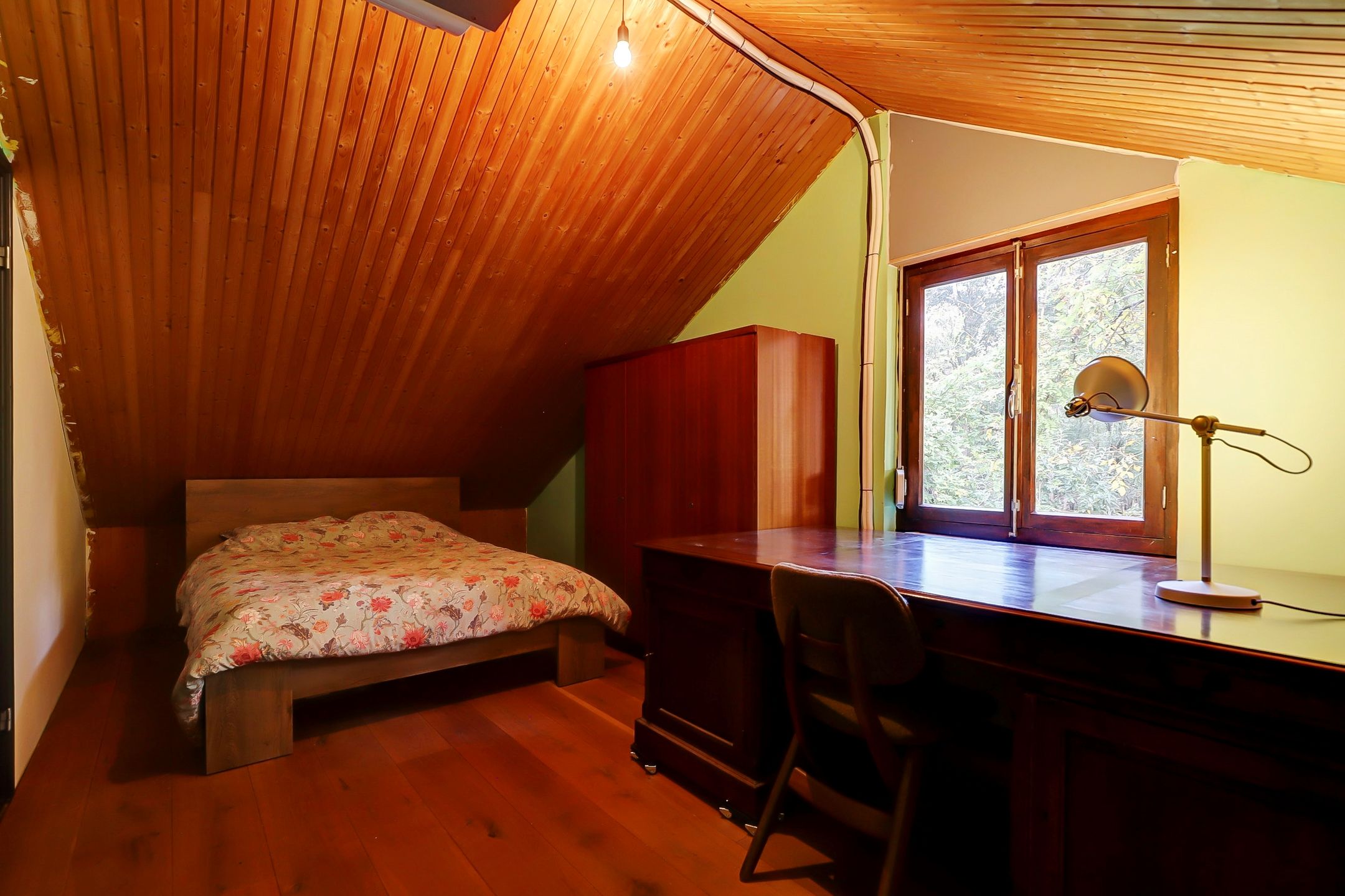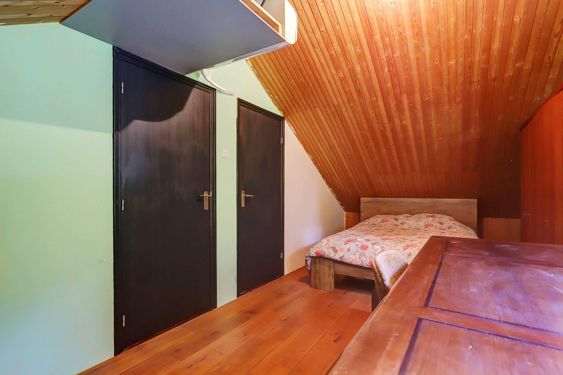 De slaapkamer op de bovenverdieping is ruim genoeg voor een tweepersoonsbed en een kledingkast. Ook deze slaapkamer heeft de beschikking over een vaste airco-installatie. Via de slaapkamer heb je toegang tot de bergzolder. Hier is al een afvoer aanwezig omdat het in de planning lag om hier ooit nog een douche en toilet te realiseren.