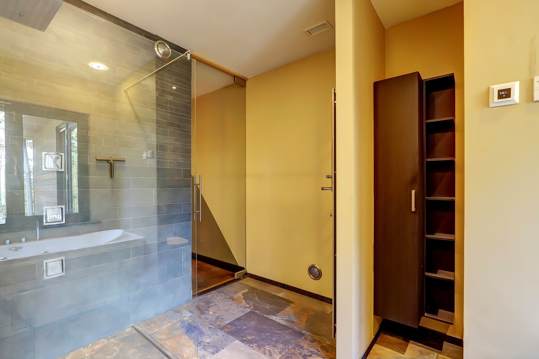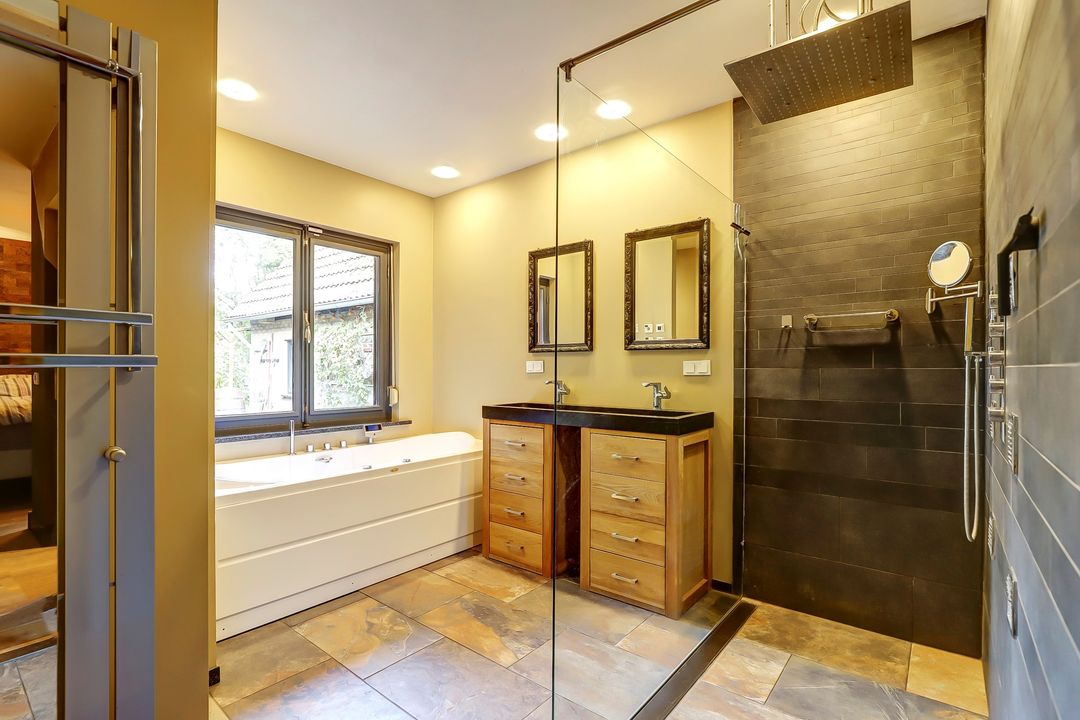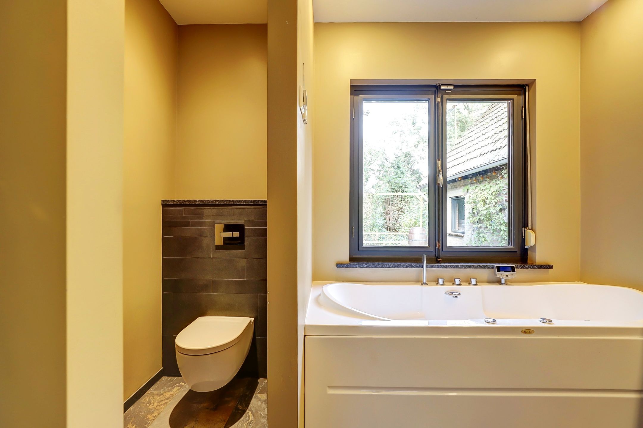 Deze badkamer heef een luxe inloopdouche met een extra grote regendouche met misteffect. In de zijwand zitten ook verschillende sproeistanden verwerkt maar hier moet even naar gekeken worden om het weer werkend te krijgen. Het ligbad is een whirlpool waarbij je ook nog de temperatuur in kunt stellen zodat het water lekker warm blijft, hoe lang je er ook in ligt! De dubbele wasbak is van zwarte graniet en beschikt over een opbergmeubel. Achter een muurtje bevindt zich nog een toilet. De badkamer is van het slaapgedeelte afgesloten door middel van een glazen deur.