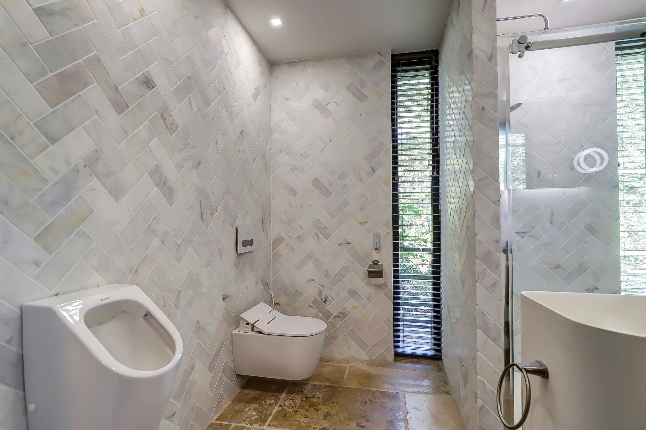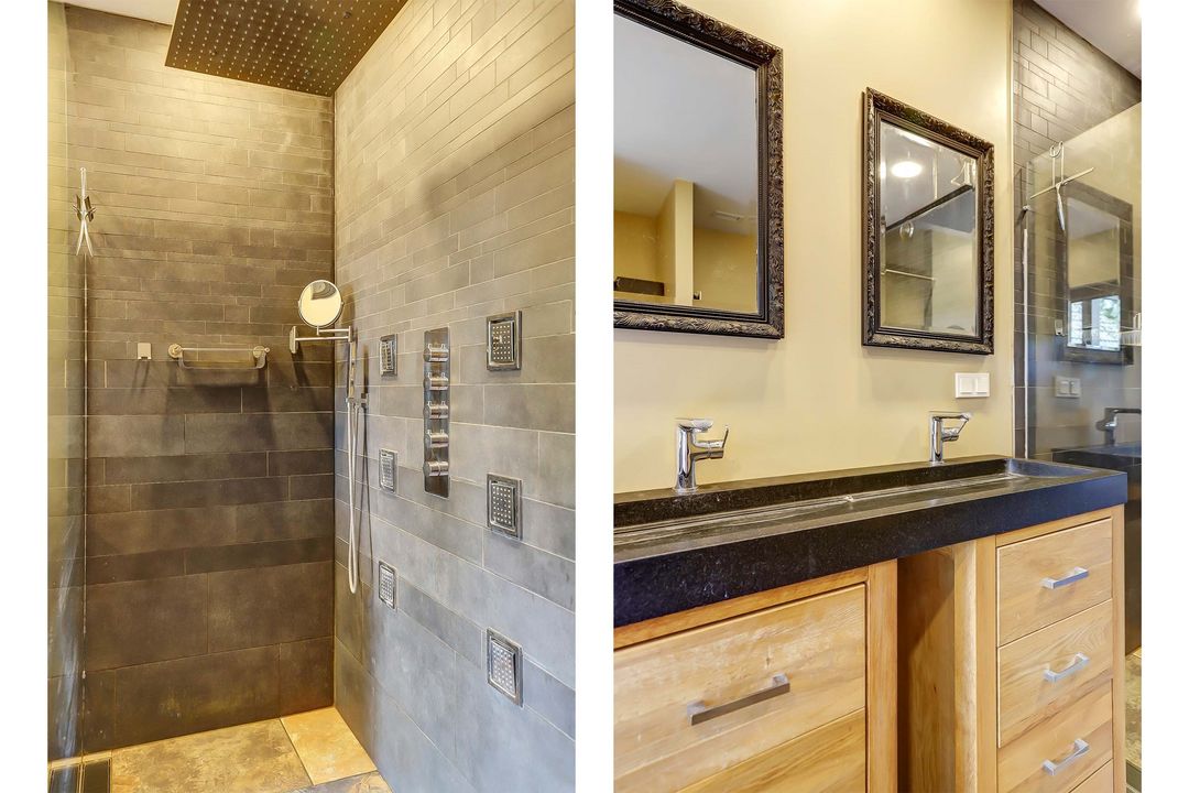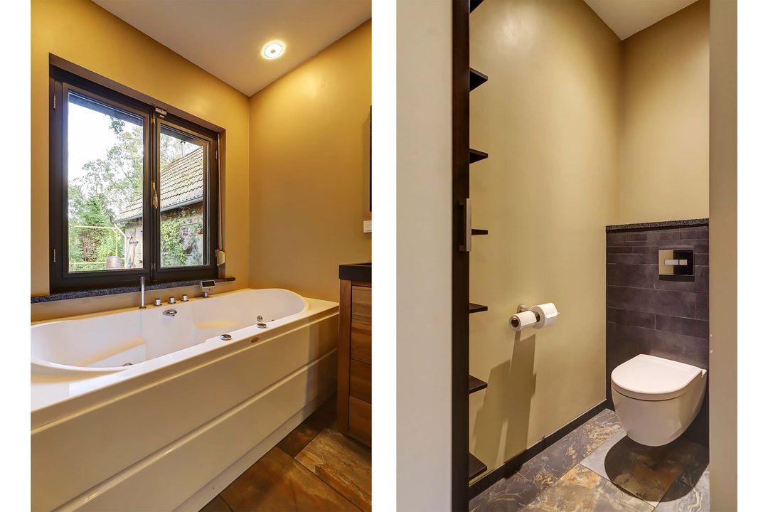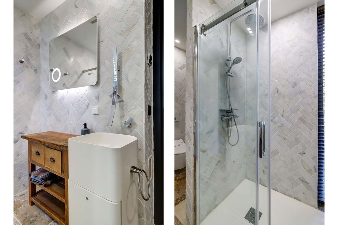 De nieuwste badkamer op de begane grond is in 2019 gerealiseerd en heeft een hele ruime inloopdouche met een fijne regendouche. Het toilet is een zogenaamd ‘Japans toilet’ dat ook naspoelt en er is ook nog een urinoir aanwezig. De wanden zijn betegeld met marmertegels in visgraatmotief en op de vloer ligt een neutrale natuursteen van Franse kalksteen.