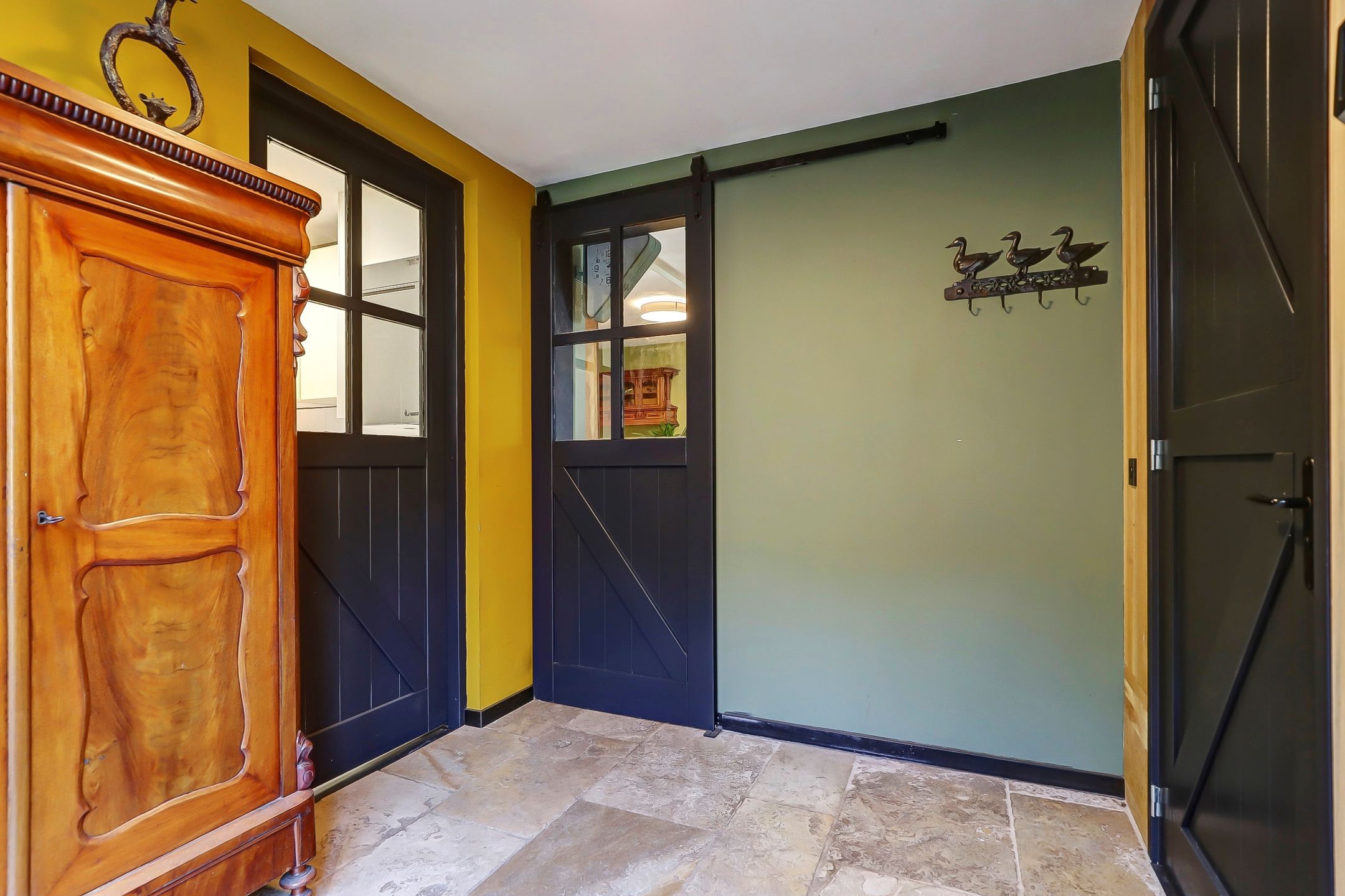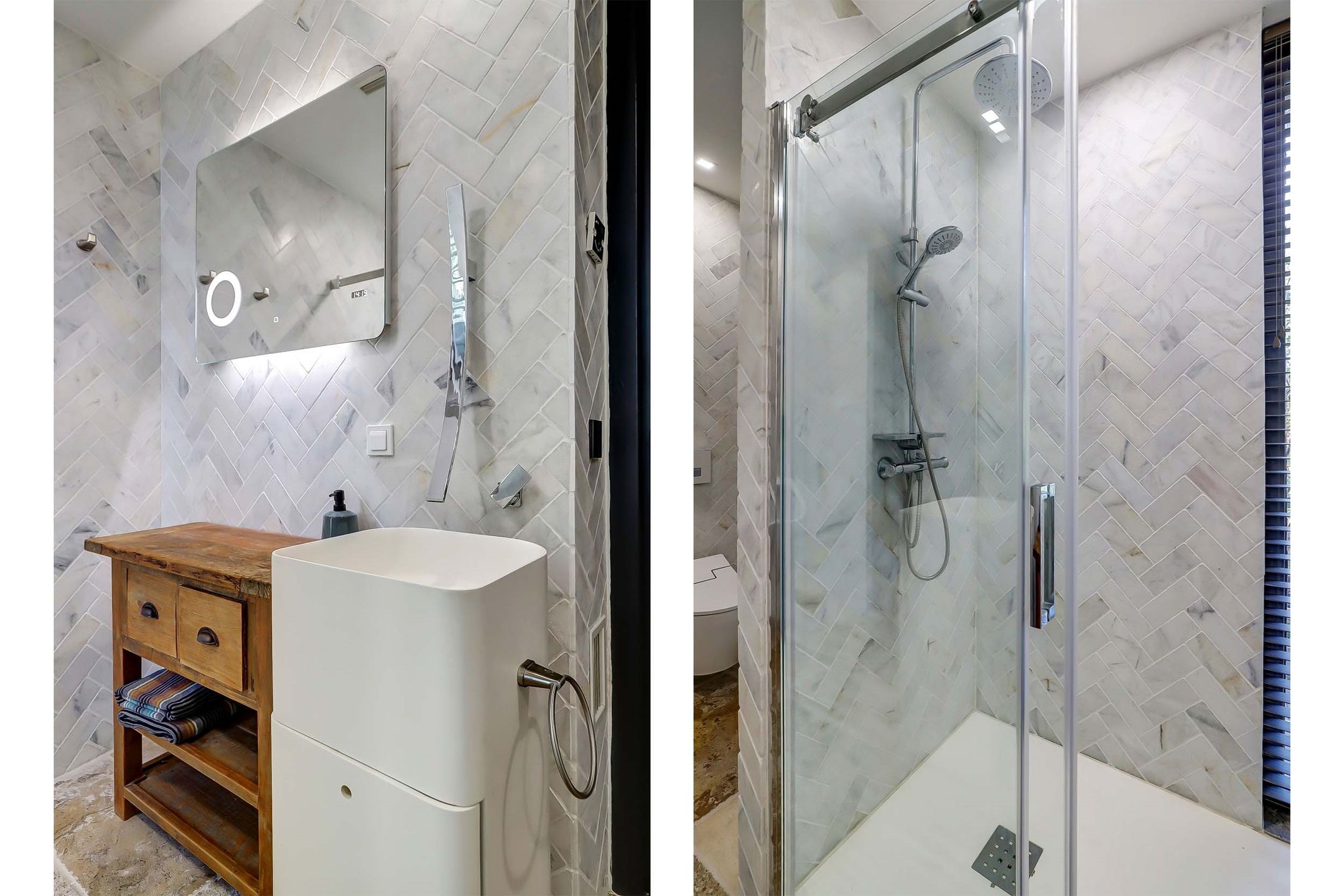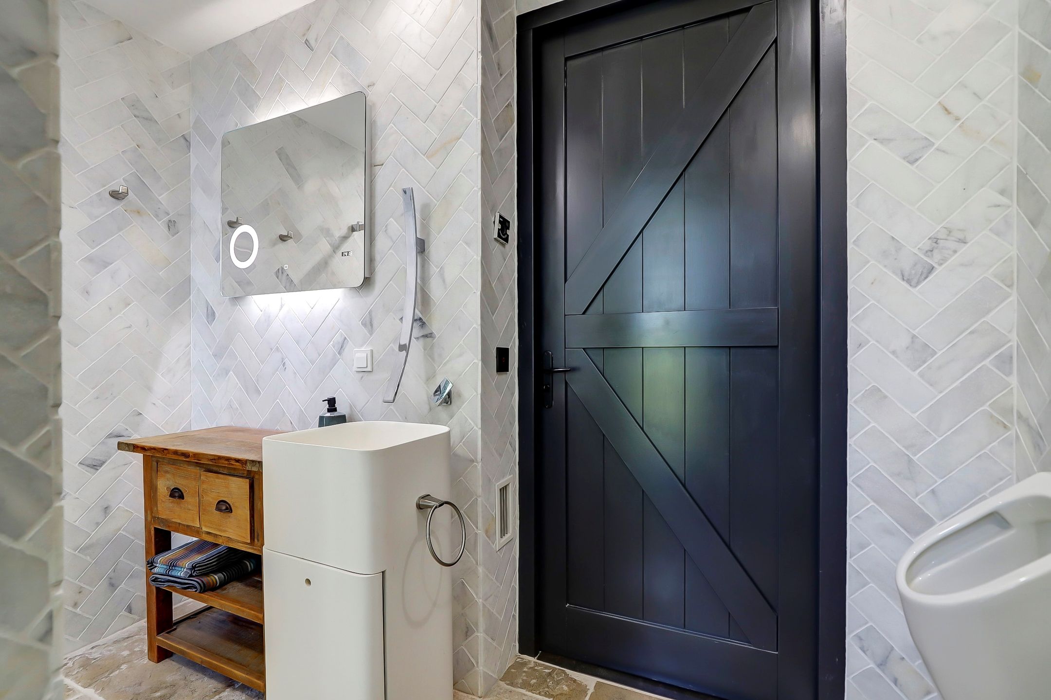 De nieuwste badkamer op de begane grond is in 2019 gerealiseerd en heeft een hele ruime inloopdouche met een fijne regendouche. Het toilet is een zogenaamd ‘Japans toilet’ dat ook naspoelt en er is ook nog een urinoir aanwezig. De wanden zijn betegeld met marmertegels in visgraatmotief en op de vloer ligt een neutrale natuursteen van Franse kalksteen.