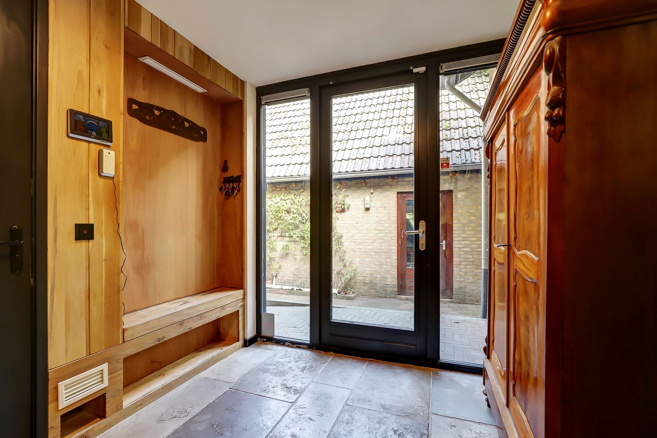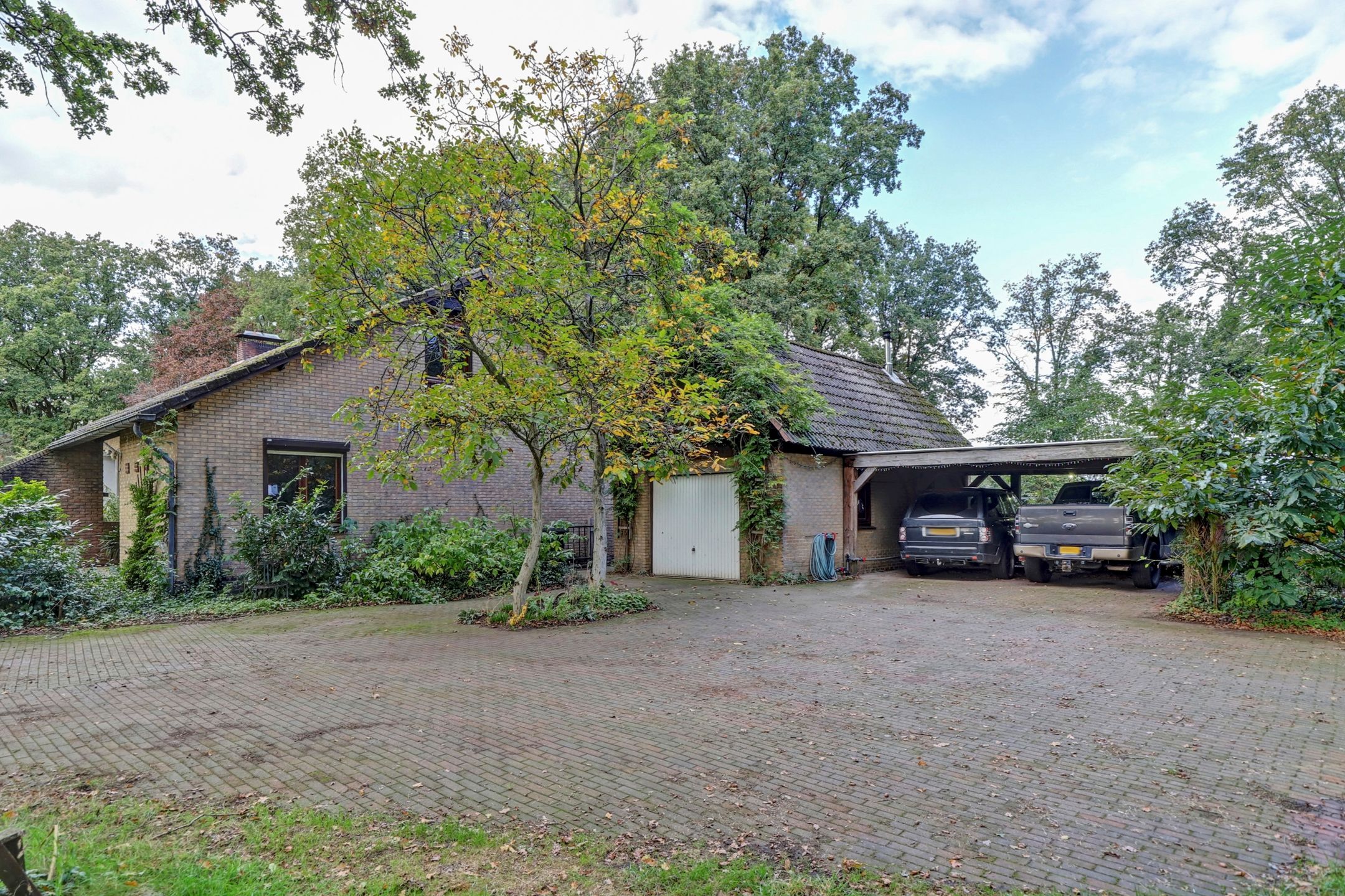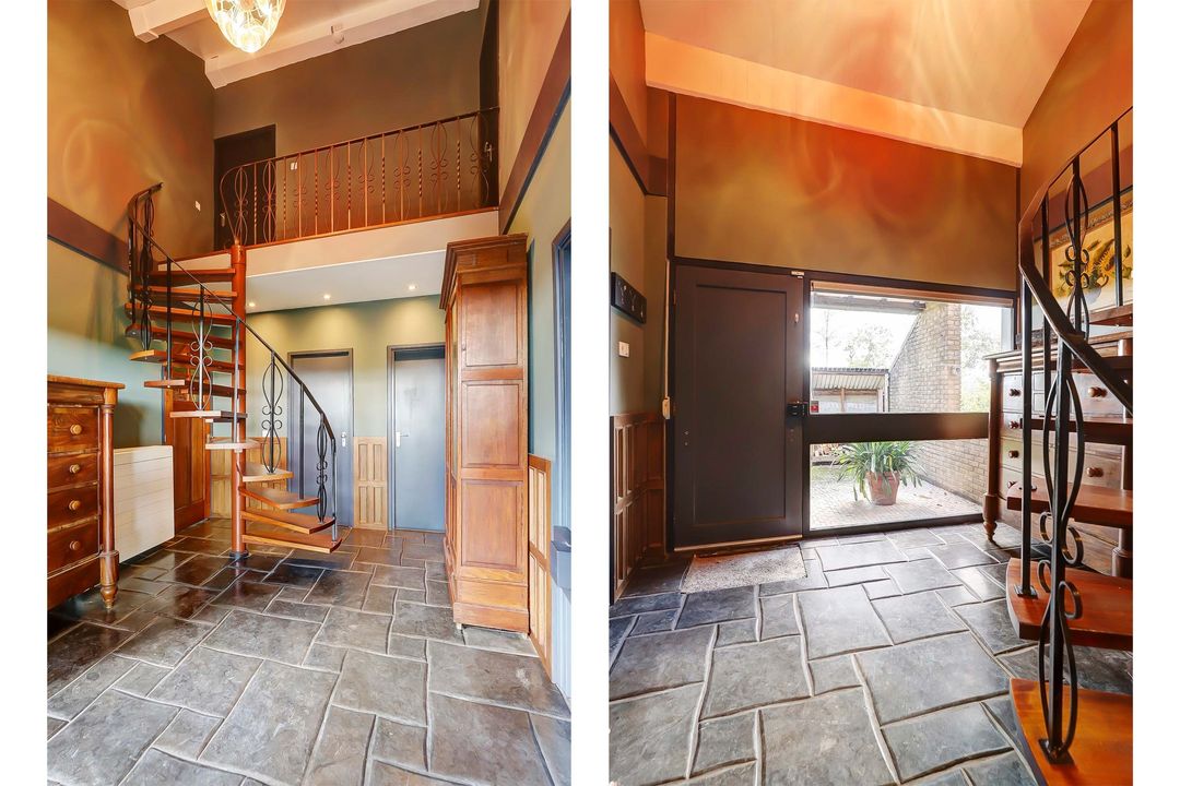 Via de oprit kom je bij een stalen poort die met een afstandsbediening te openen is waardoor je makkelijk met je auto het terrein op kunt rijden en kunt parkeren naast de woning of onder de carport. Via de voordeur betreedt je de hal waar zich de meterkast bevindt met 24 stroomgroepen en 2 krachtstroomgroepen. In de hal ligt ook de wenteltrap naar de bovenverdieping.