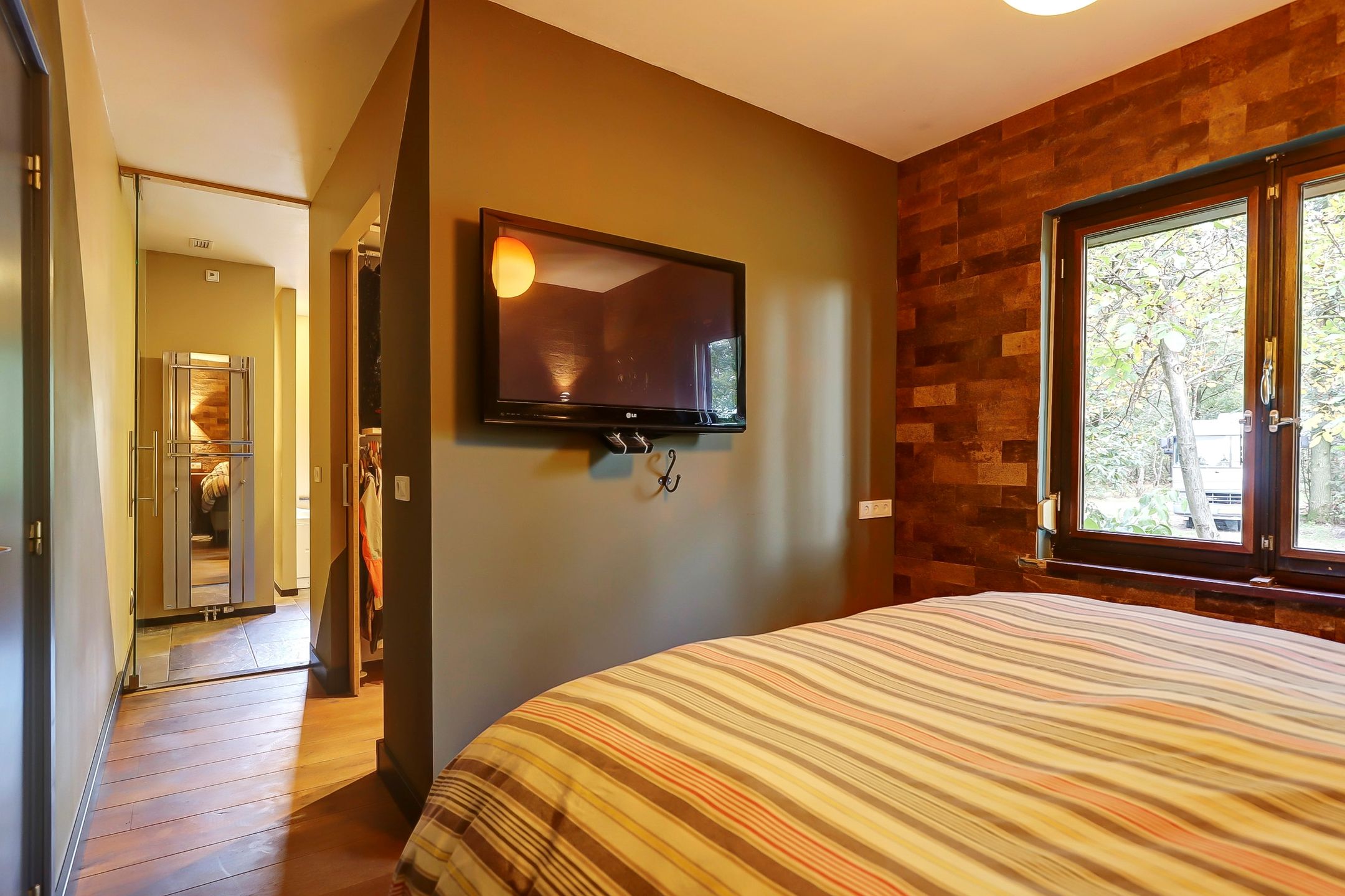 De slaapkamer op de begane grond is niet zomaar een slaapkamer. De kamer bestaat als het ware uit drie delen: in het eerste deel past een groot tweepersoonsbed en hier heb je de beschikking over een vaste airco-installatie. Daarna loop je zo de ruime inloopkast in waar je hang- en leggedeeltes hebt om al je kleren in kwijt te kunnen en in de laatste ruimte ligt de ensuite badkamer.