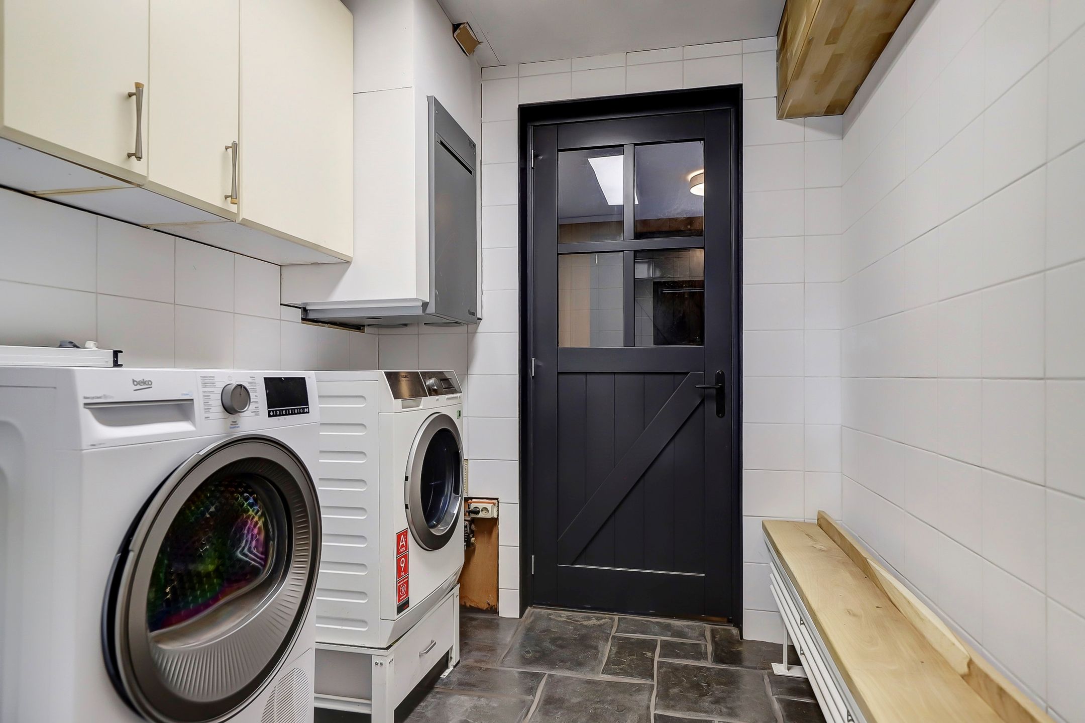 In de handige wasruimte heb je plaats voor een wasmachine en een droger. Verder hangt hier ook de waterontharder en de mechanische ventilatie van de badkamer en de aanbouw.