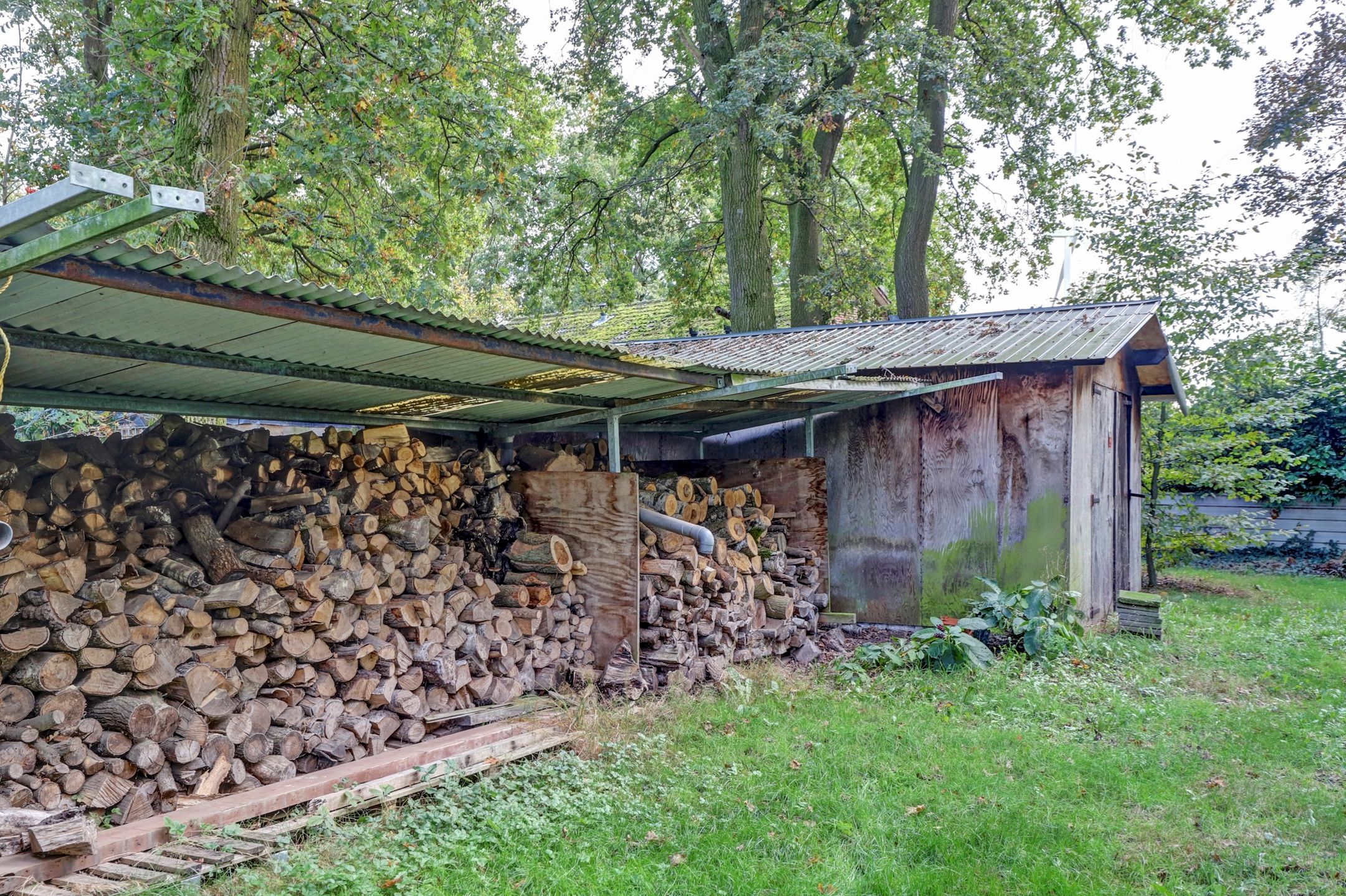In de vrijstaande stenen garage, die naast de woning ligt, heb je ruimte om een auto binnen te parkeren. Achterin de garage staat de milieuvriendelijkere pellet CV ketel met een groot voorraadvat. Deze CV ketel werkt op pelletkorrels en moet je alleen af en toe bijvullen. Naast de garage ligt nog een dubbele carport waar je twee auto’s kunt parkeren.