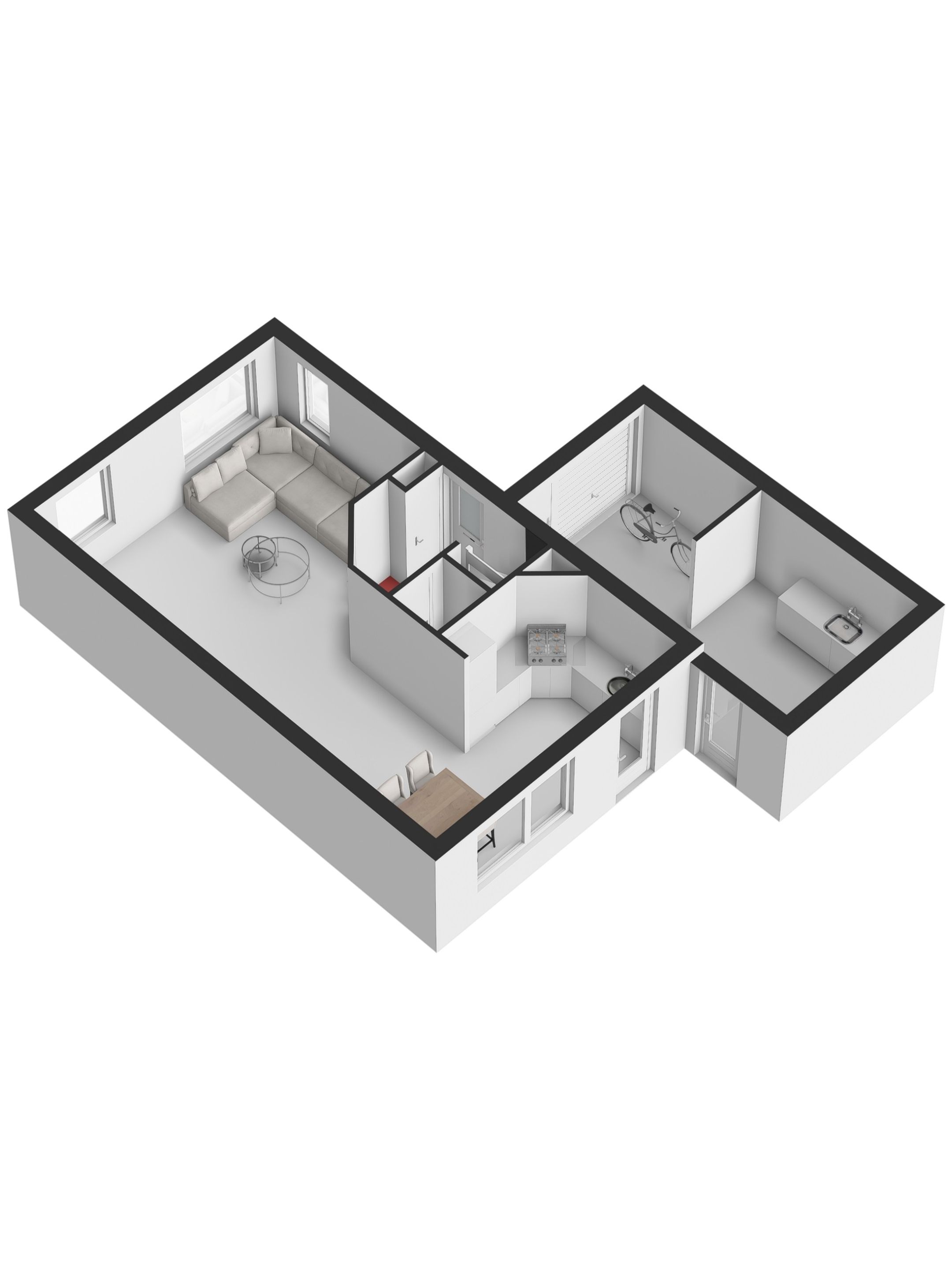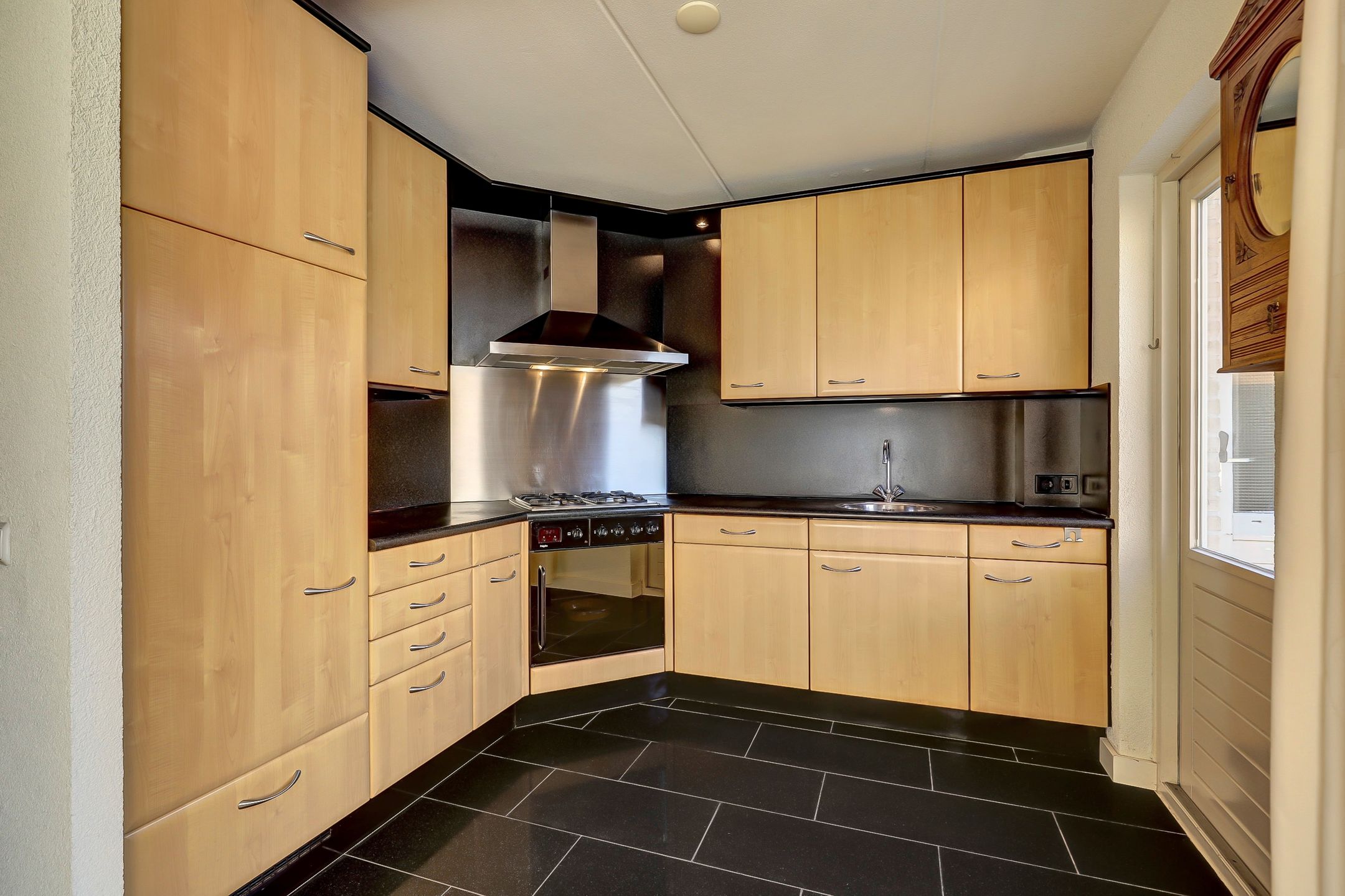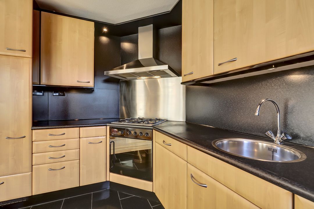 De open keuken is functioneel en neutraal ingericht en biedt het alles wat je nodig hebt. Je kookt op een vierpits gasfornuis met een rvs afzuigkap en bijpassende rvs spatplaat. Verder beschik je over een oven, vaatwasser en een ruime koelkast. Dankzij de vele kastjes is er meer dan voldoende opbergruimte voor al je keukenspullen en provisie. Sfeerverlichting onder de bovenkastjes en diverse inbouwspots in het plafond zorgen voor prettig werk- en accentlicht. Het donkere kunststof aanrechtblad en de achterwand vormen samen met de donkere tegelvloer een stijlvol en praktisch geheel. Vanuit de keuken stap je zo de tuin in waardoor binnen en buiten op een natuurlijke manier met elkaar verbonden zijn. Een fijne indeling die het dagelijkse wooncomfort compleet maakt.