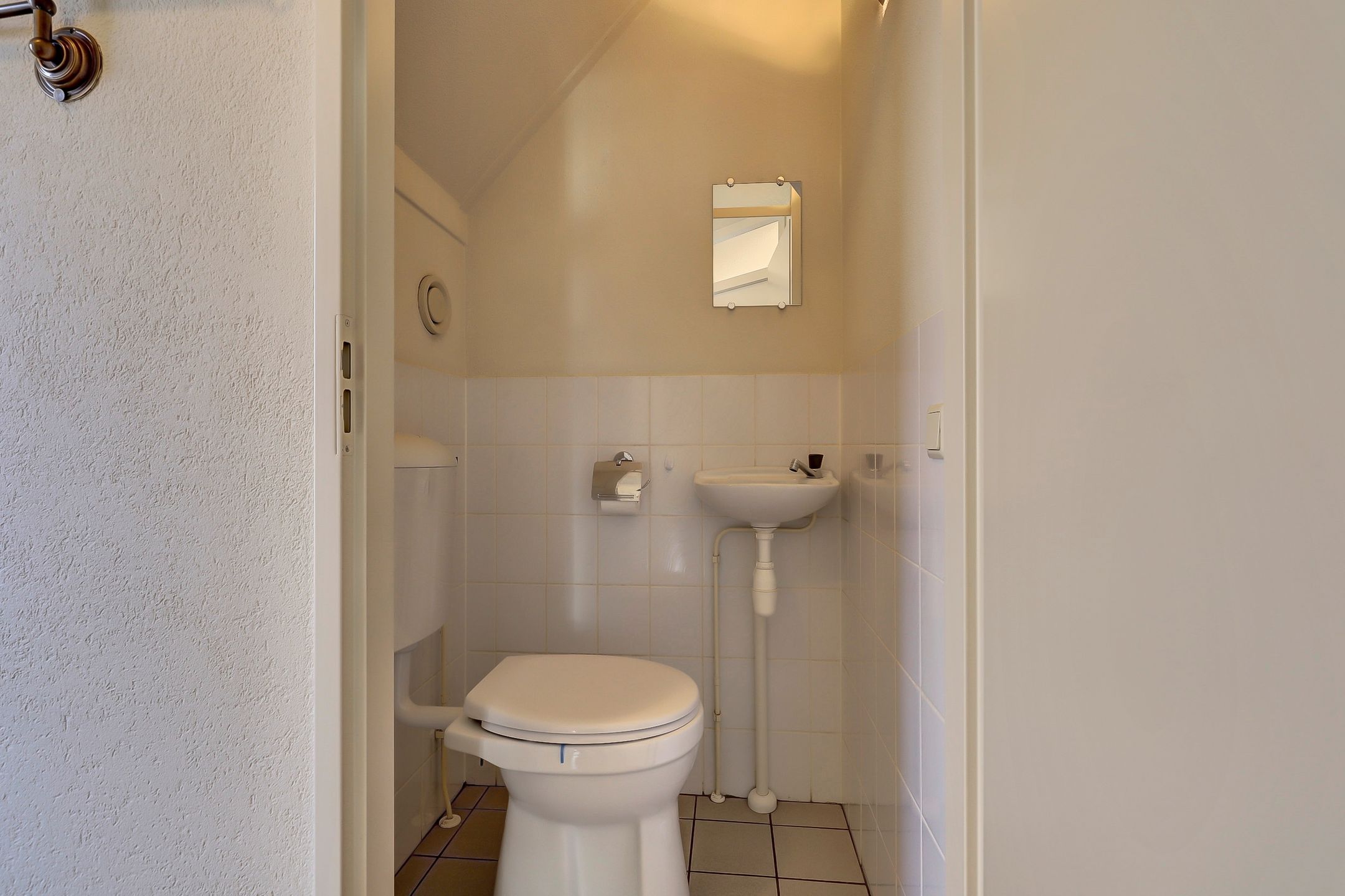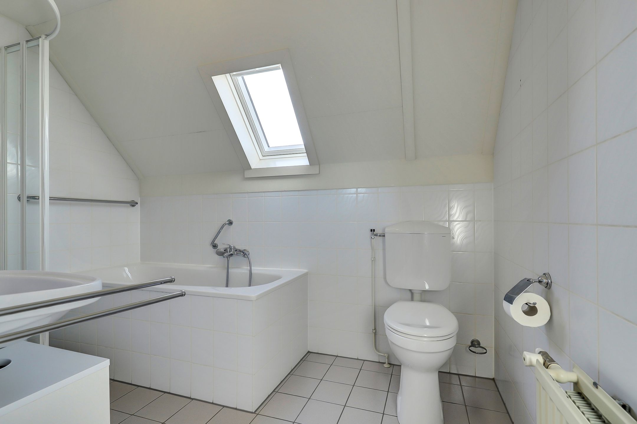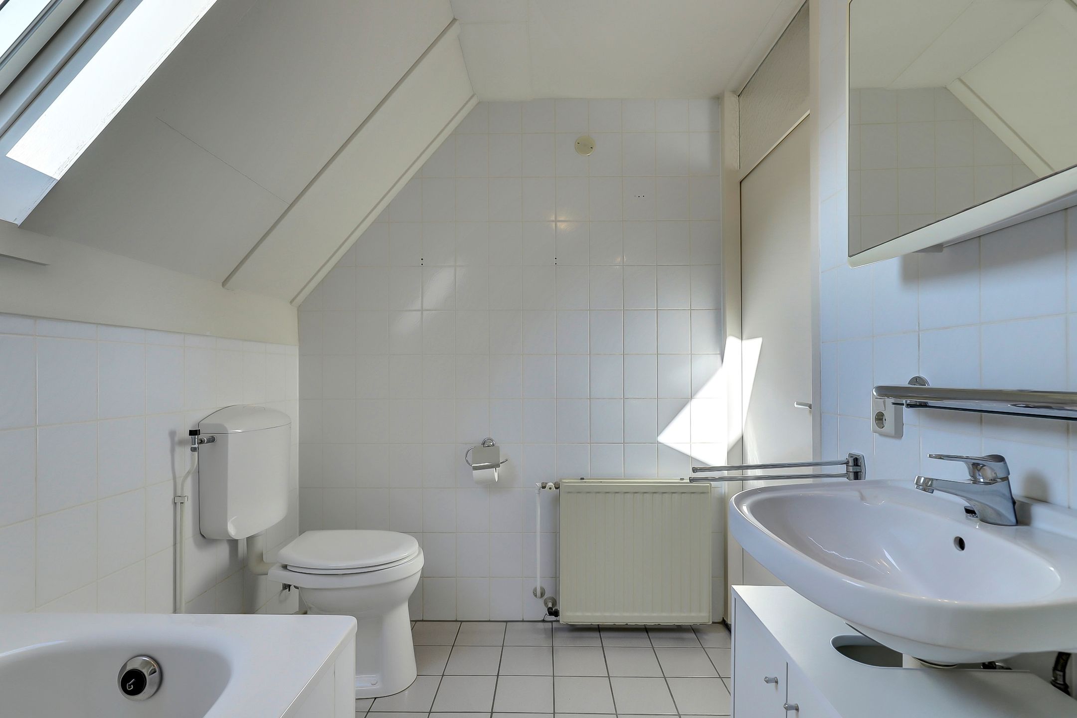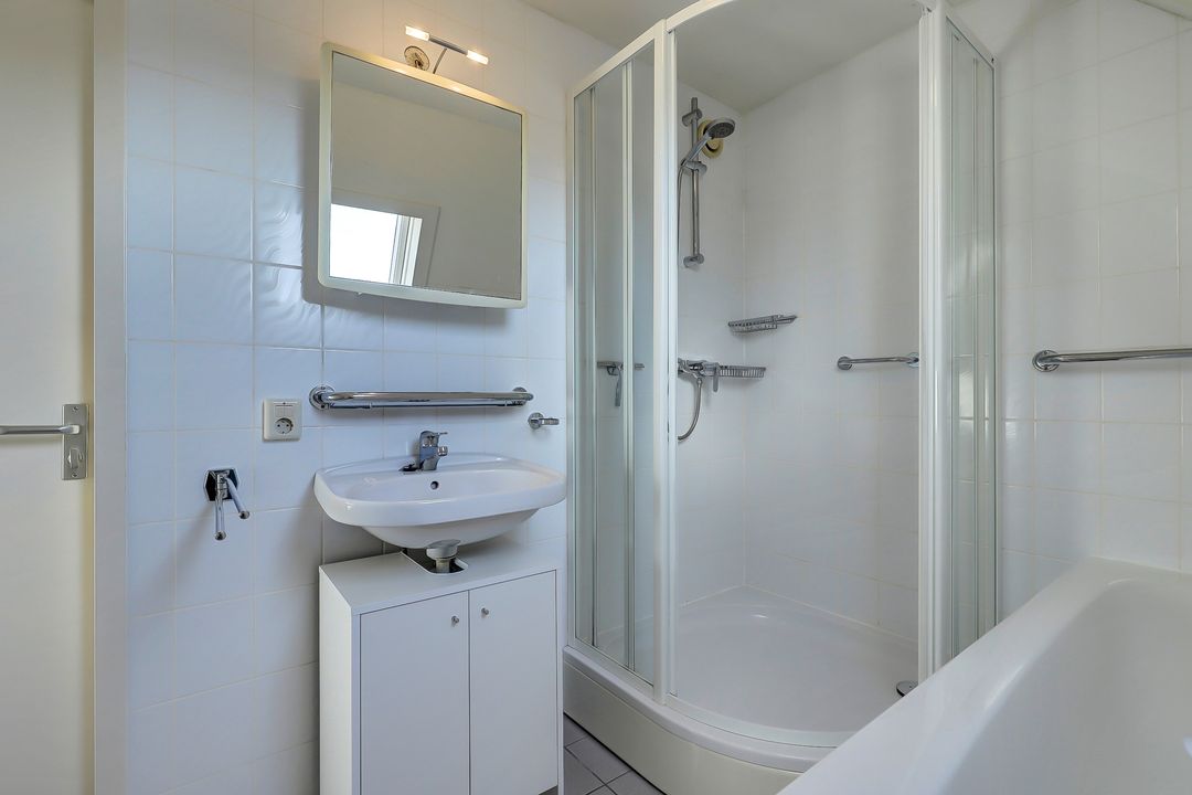 De badkamer is verrassend ruim en biedt alle comfort die je mag verwachten. Hier kun je kiezen voor een verfrissende douche in de halfronde douchecabine met schuifwanden of juist ontspannen in het ligbad. Daarnaast beschikt de badkamer over een toilet, een wastafel met meubel en een handige spiegelkast voor extra bergruimte. Het kleine dakraam zorgt voor natuurlijke ventilatie en daglicht terwijl de mechanische afzuiging extra comfort biedt. De afwerking in neutrale, lichte tinten geeft de ruimte een tijdloze en frisse uitstraling.