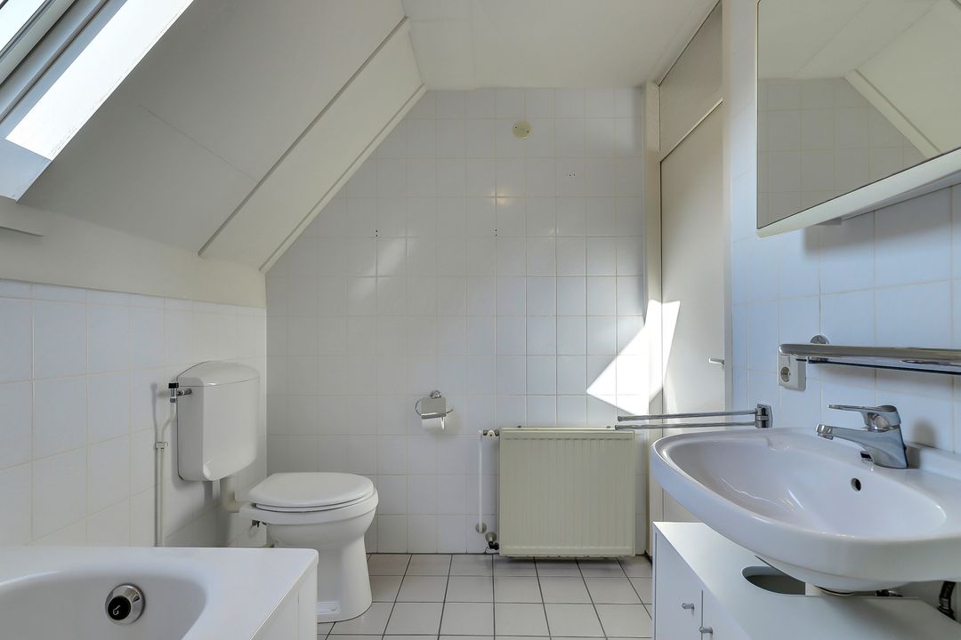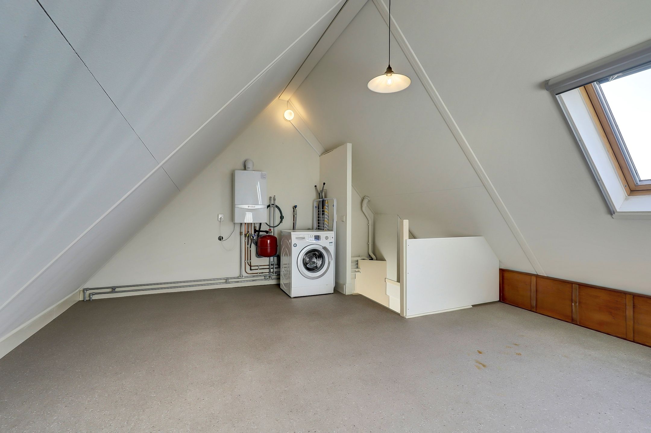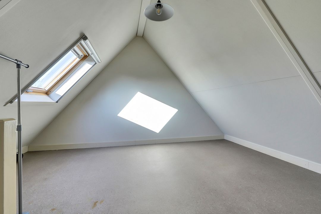 Boven kom je uit op een ruime, open zolder die momenteel bestaat uit één grote multifunctionele ruimte. Dankzij het Velux dakraam valt er prettig daglicht naar binnen waardoor het geen donkere opslagzolder is maar juist een volwaardige verdieping waar je echt iets moois van kunt maken. De mogelijkheden zijn hier volop aanwezig. Denk aan het realiseren van een vierde slaapkamer, een rustige werkplek, een speelkamer of een fijne hobbyruimte. Door het eventueel nog plaatsen van een dakkapel creëer je bovendien eenvoudig nog meer lichtinval en leefruimte. De zolder is afgewerkt met een nette vinylvloer en is daarnaast praktisch ingericht. Hier vind je de cv-ketel en een aansluiting voor het witgoed waardoor deze verdieping ook uitstekend dienst kan doen als wasruimte. Een verrassend ruime en flexibele verdieping die je geheel naar eigen wens kunt indelen en benutten.