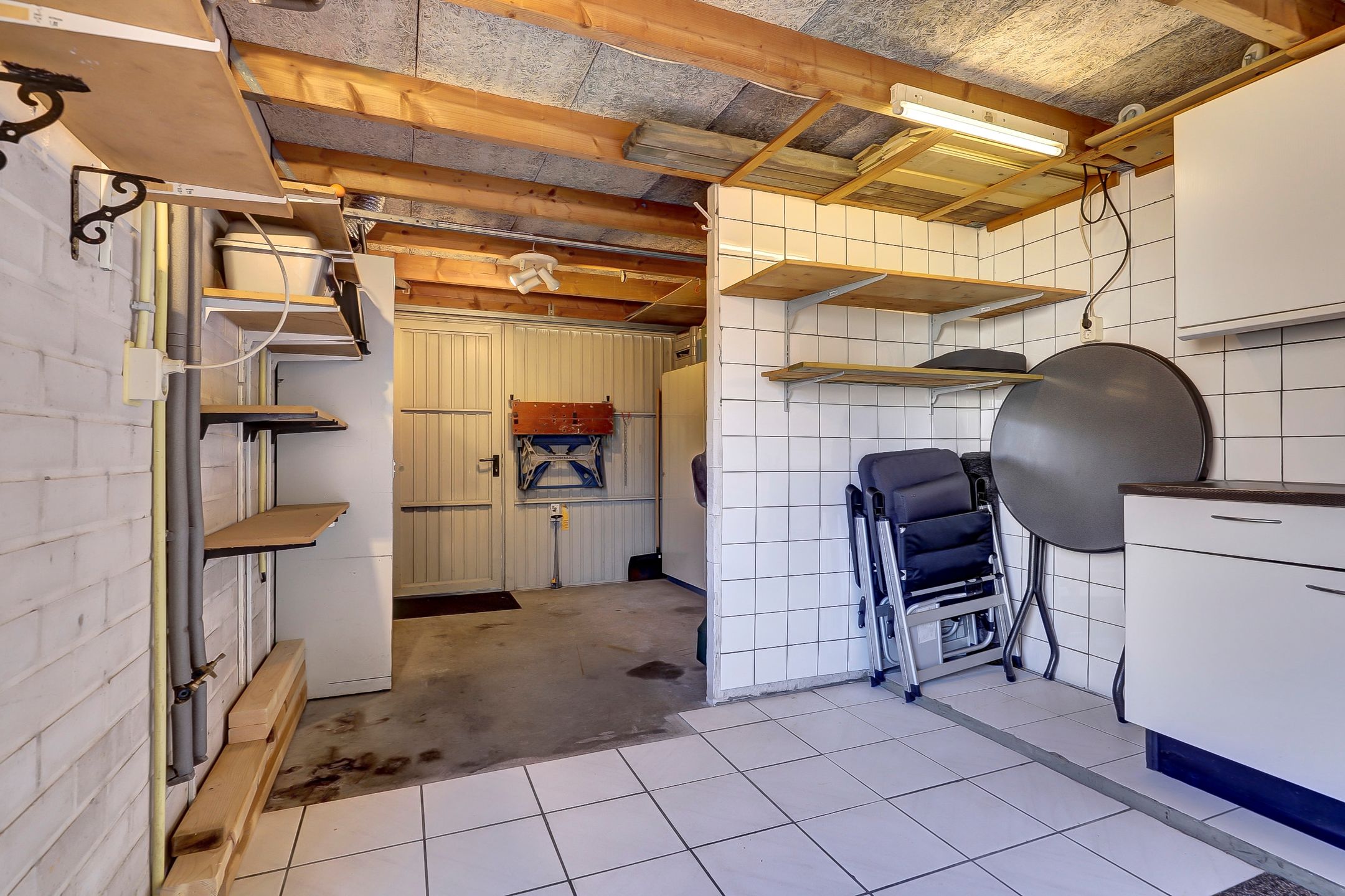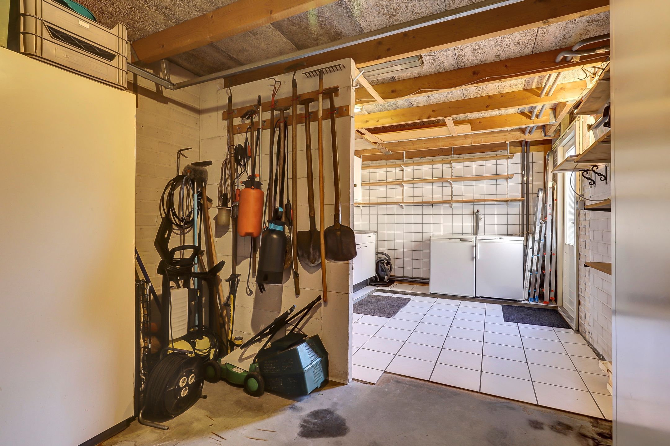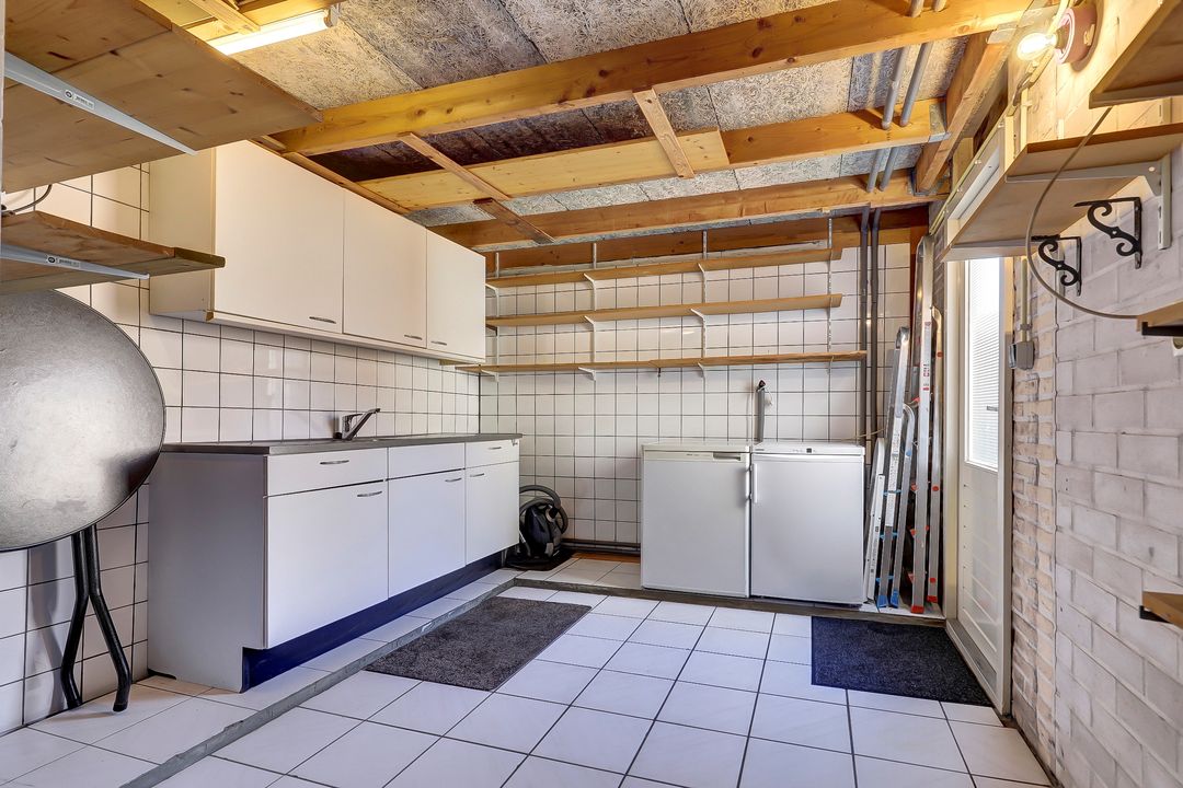 Vanuit de tuin heb je directe toegang tot de garage wat deze ruimte extra praktisch en veelzijdig maakt. De garage is voorzien van een handig keukenblok met wasbak, ideaal voor bijvoorbeeld tuinwerkzaamheden of schoonmaakklusjes. Daarnaast is er volop plek voor het opbergen van tuingereedschap, fietsen en seizoensspullen. Dankzij de ruimte en indeling leent de garage zich ook uitstekend voor het inrichten van een fijne werkplaats waar je naar hartenlust kunt klussen of sleutelen. Voor de garage ligt een eigen oprit en met zowel de kantelpoort als de aparte loopdeur stap je gemakkelijk naar binnen, ook met grotere spullen. Bovendien is er een extra witgoedaansluiting aanwezig wat de garage nog multifunctioneler maakt. Een praktische aanvulling op de woning met volop mogelijkheden.