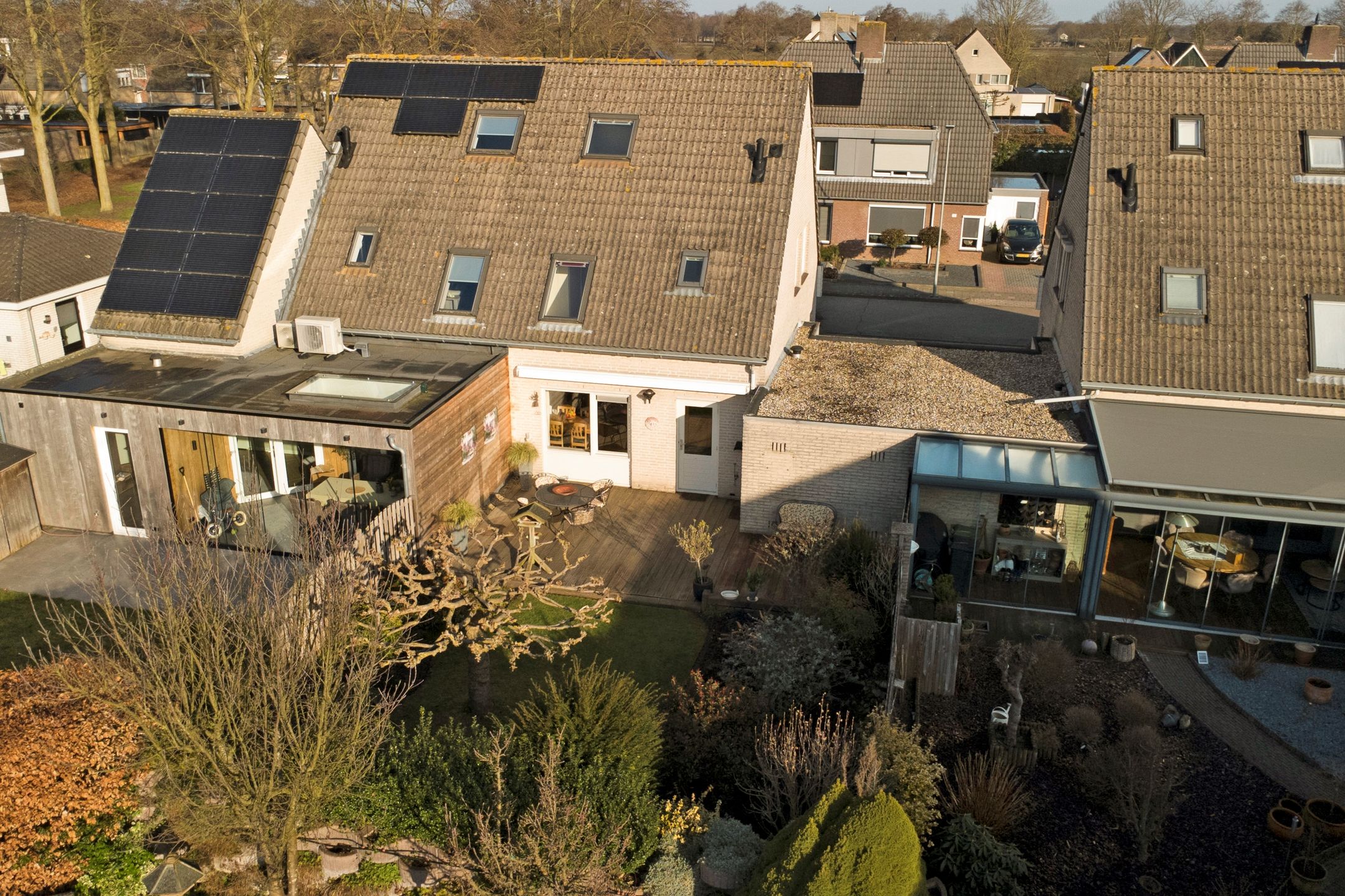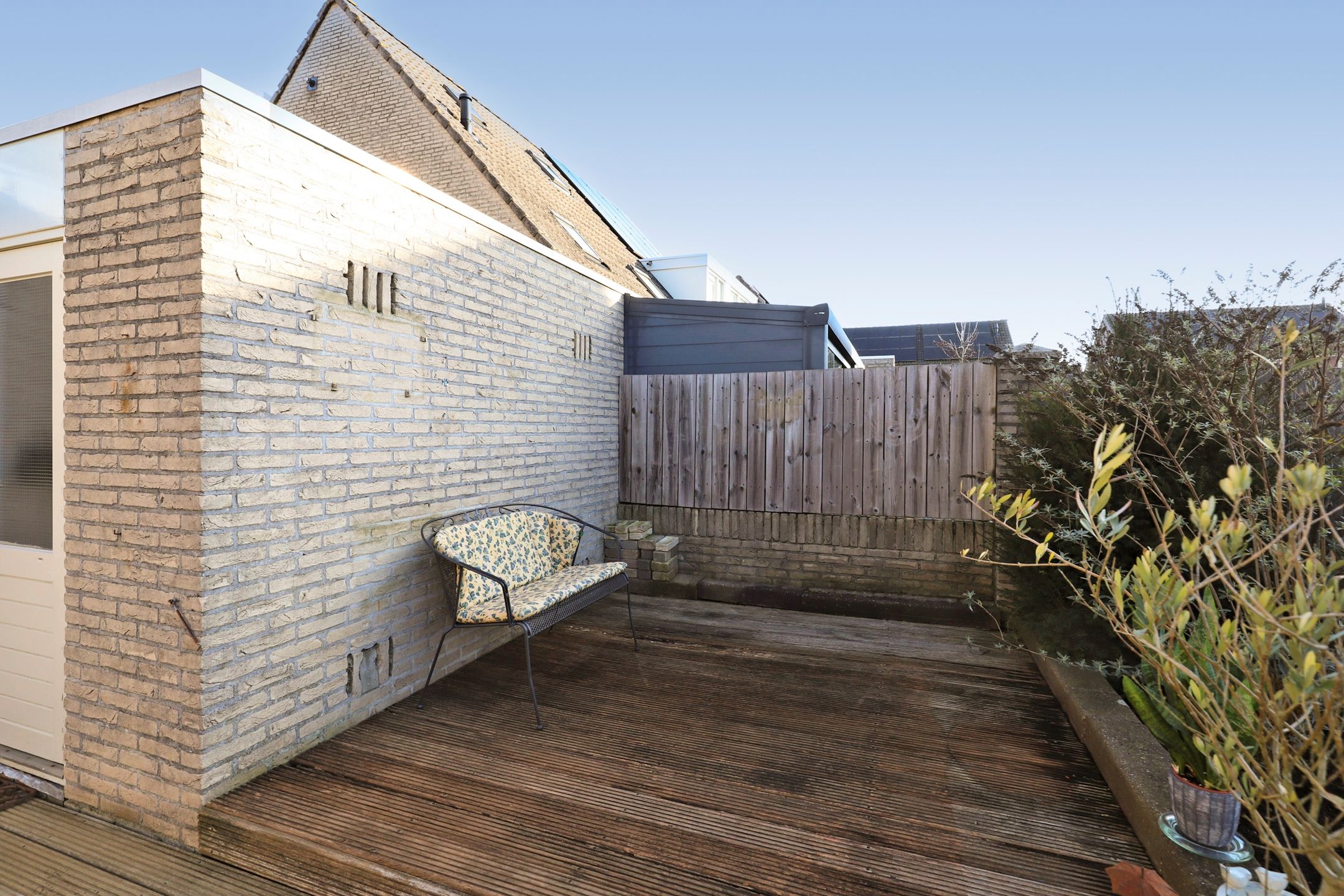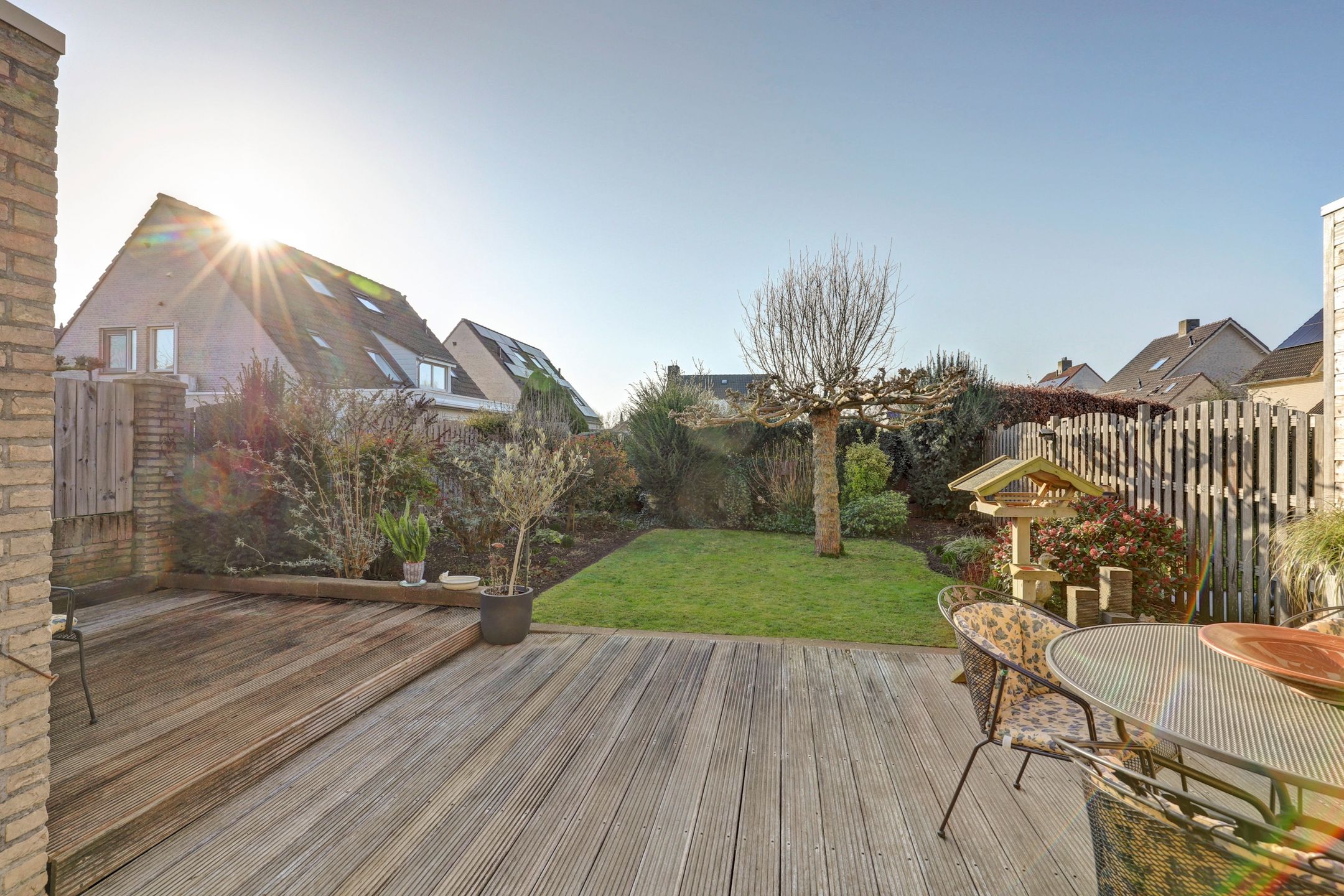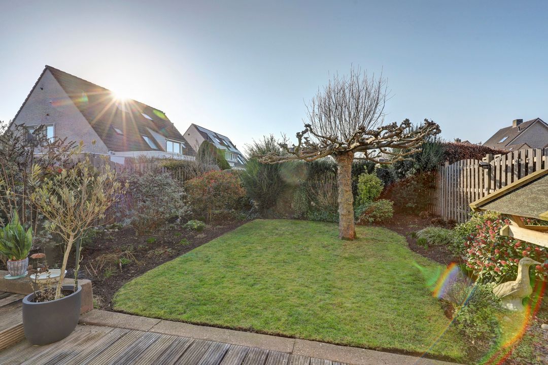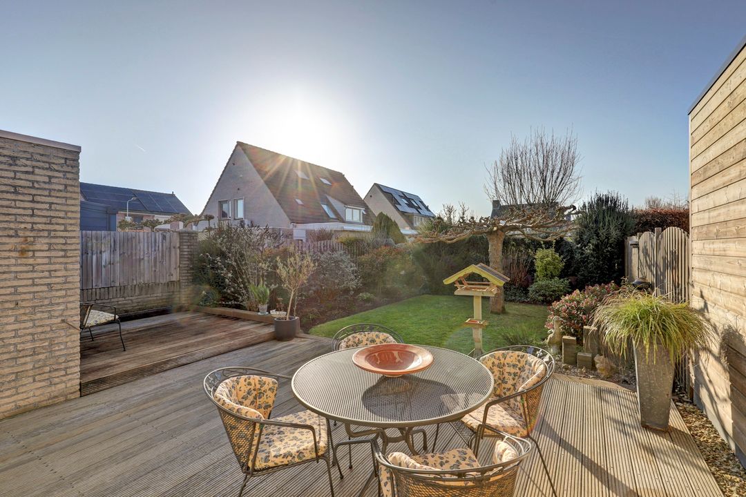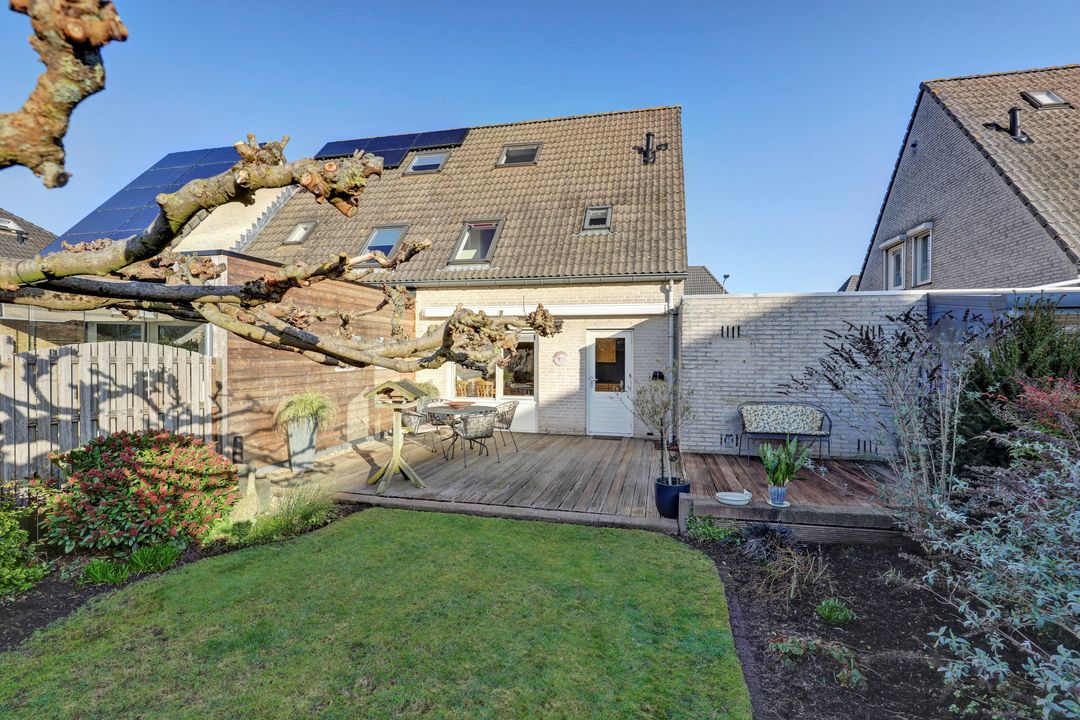 Direct achter de woning ligt een heerlijk terras op houten vlonderplanken. Dit is een fijne plek om te ontspannen, te dineren of gezellig samen te komen met familie en vrienden. Dankzij het elektrisch bedienbare zonnescherm maak je het terras in een handomdraai overdekt. Zo kies je op elk moment van de dag of je lekker in de zon wilt zitten of juist verkoeling zoekt in de schaduw. Midden in de tuin staat een prachtige, volwassen plantaanboom die in de zomer zorgt voor een natuurlijke parasol en tegelijkertijd veel sfeer en karakter toevoegt. In combinatie met het gazon geeft dit de tuin een rustige en groene uitstraling. Rondom het gazon liggen verzorgde borders met volop volwassen beplanting waaronder vrolijk gekleurde vlinderstruiken en diverse andere planten. Dit zorgt niet alleen voor kleur en leven maar trekt bijvoorbeeld ook vlinders en bijen aan. Doordat de woning op de kopse kant van de straat ligt en er uitsluitend andere tuinen aan de achterzijde grenzen geniet je hier van optimale privacy. Inkijk is er nauwelijks waardoor je in alle rust van het buitenleven kunt genieten.