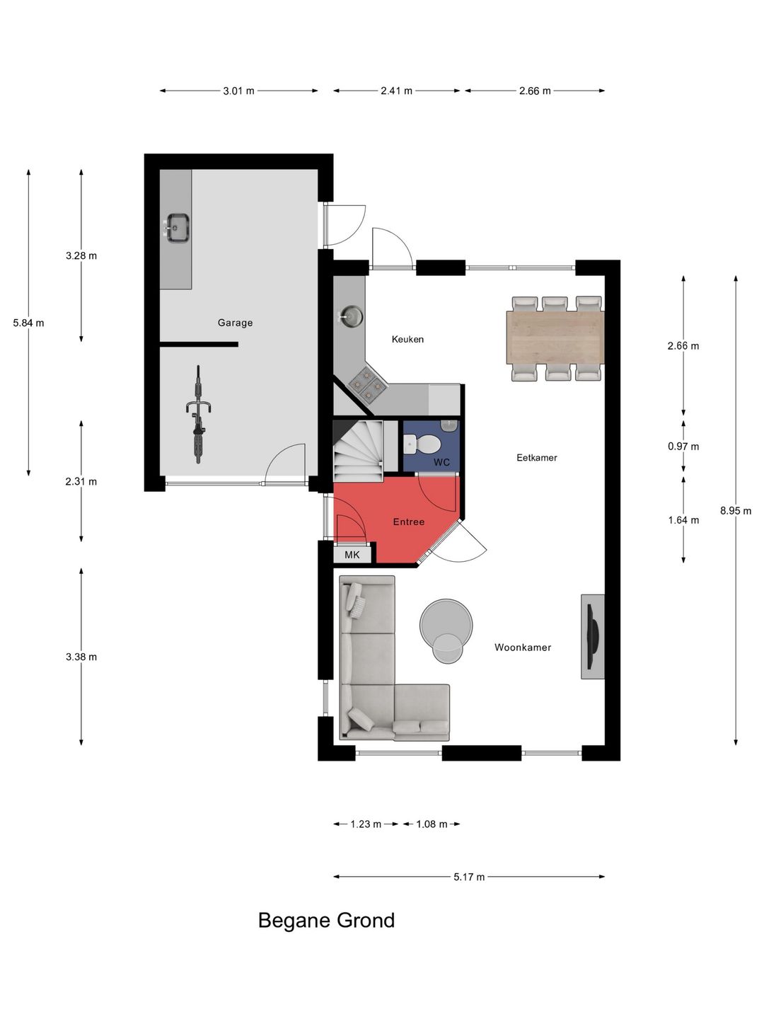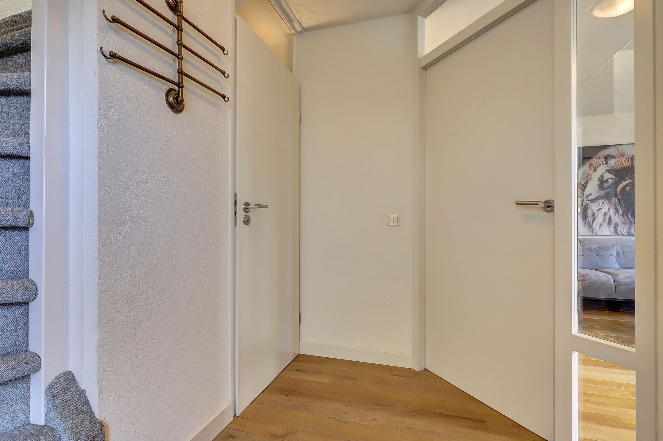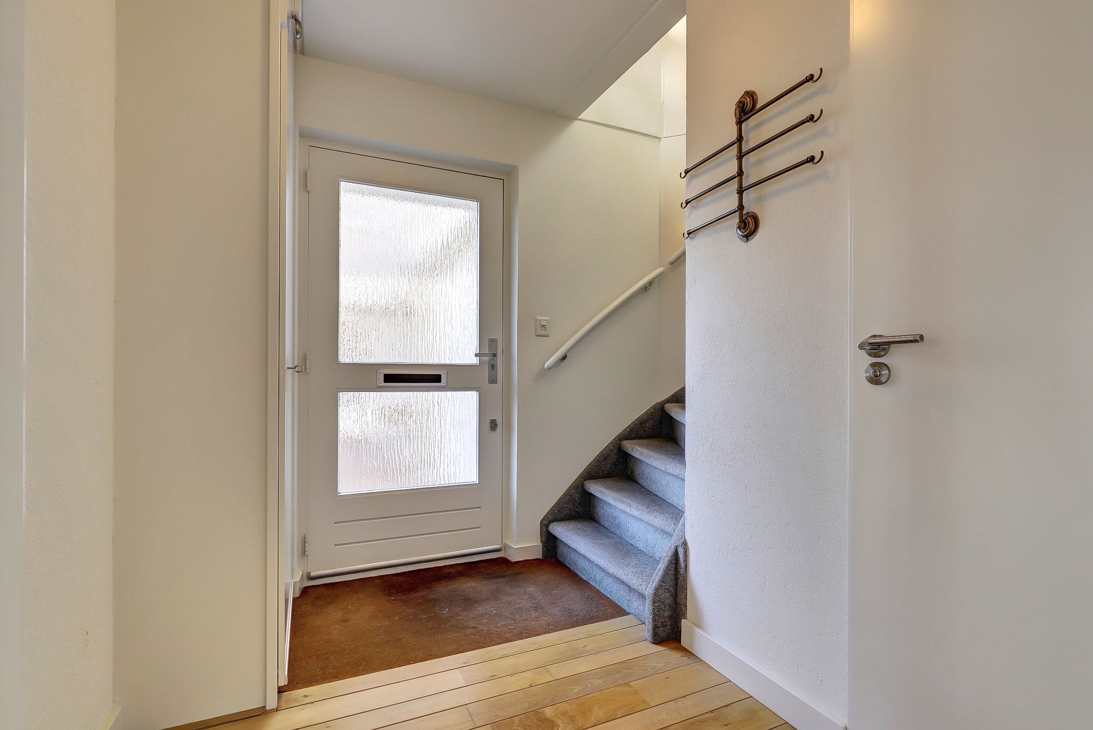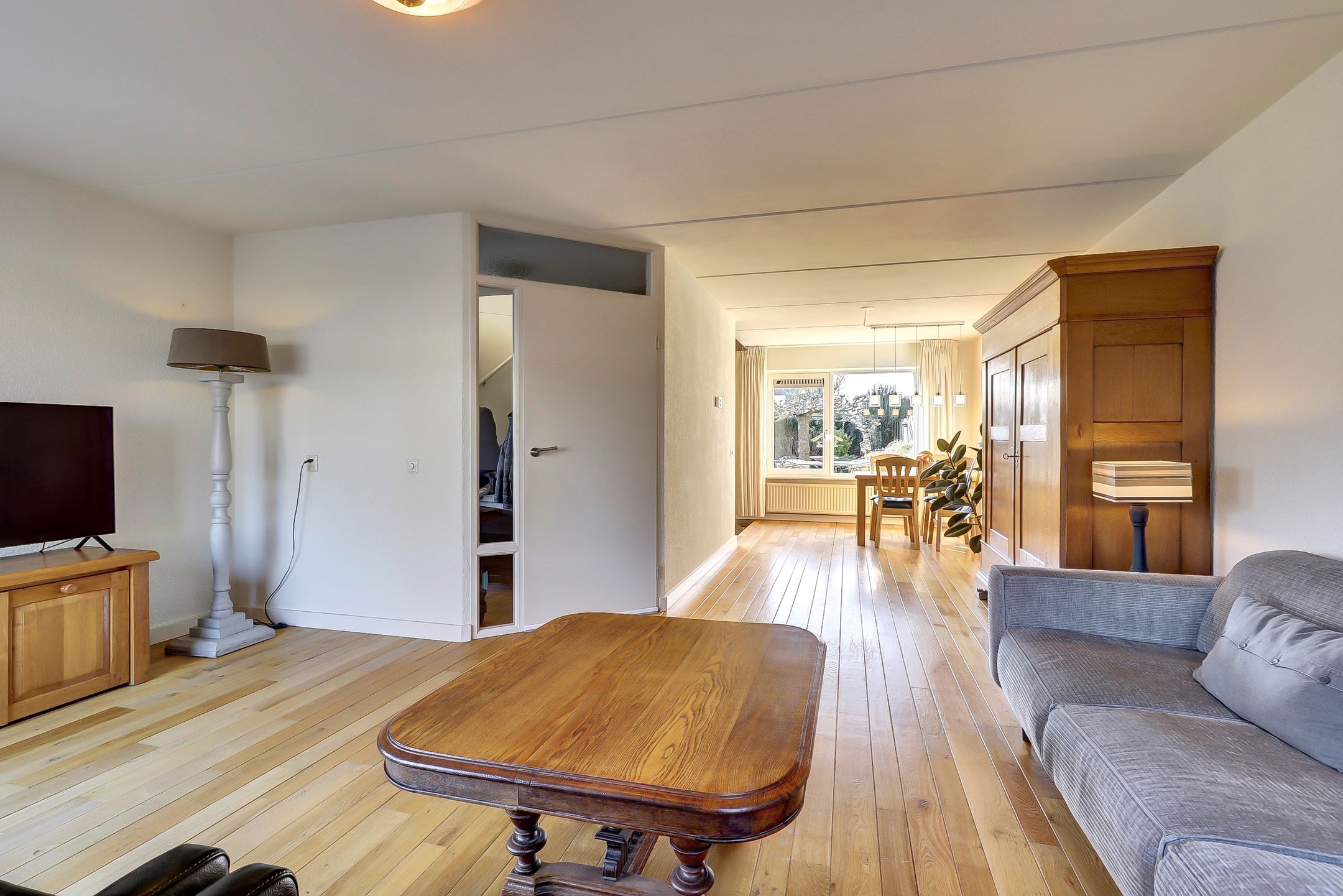 Via de eigen oprit loop je comfortabel naar de voordeur. Je komt binnen in de hal, een nette en verzorgde entree die meteen een goede eerste indruk geeft. Hier bevinden zich de meterkast met aansluiting op glasvezelinternet, een praktische en moderne voorziening, en een keurige toiletruimte. Daarnaast is er bij de voordeur een luik aanwezig dat toegang geeft tot de kruipruimte, handig voor extra bereikbaarheid en onderhoud. Bij binnenkomst valt direct de prachtige houten vloer op die vanuit de hal is doorgelegd naar de woonkamer en zorgt voor een warme, rustige uitstraling en een mooi geheel op de begane grond.