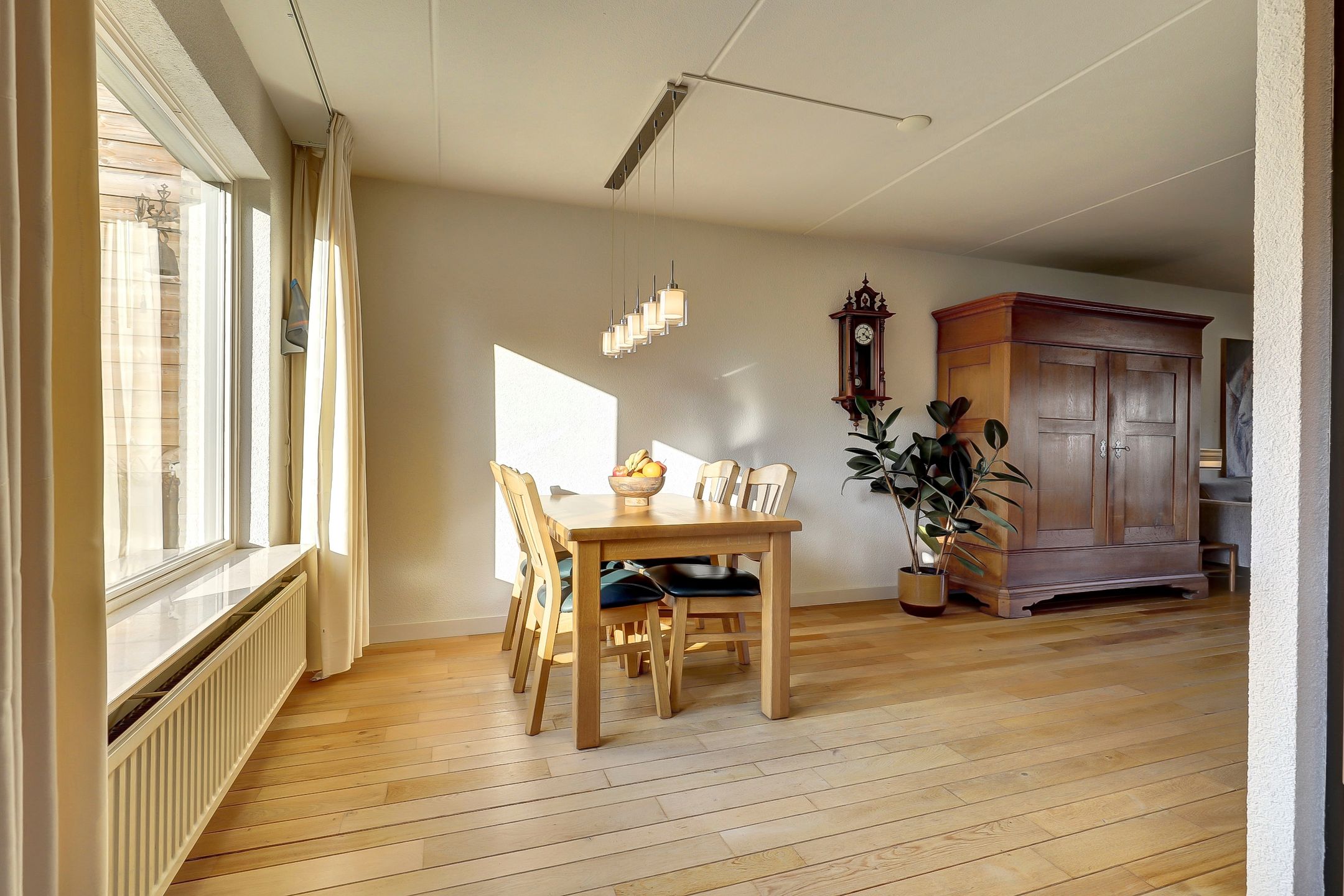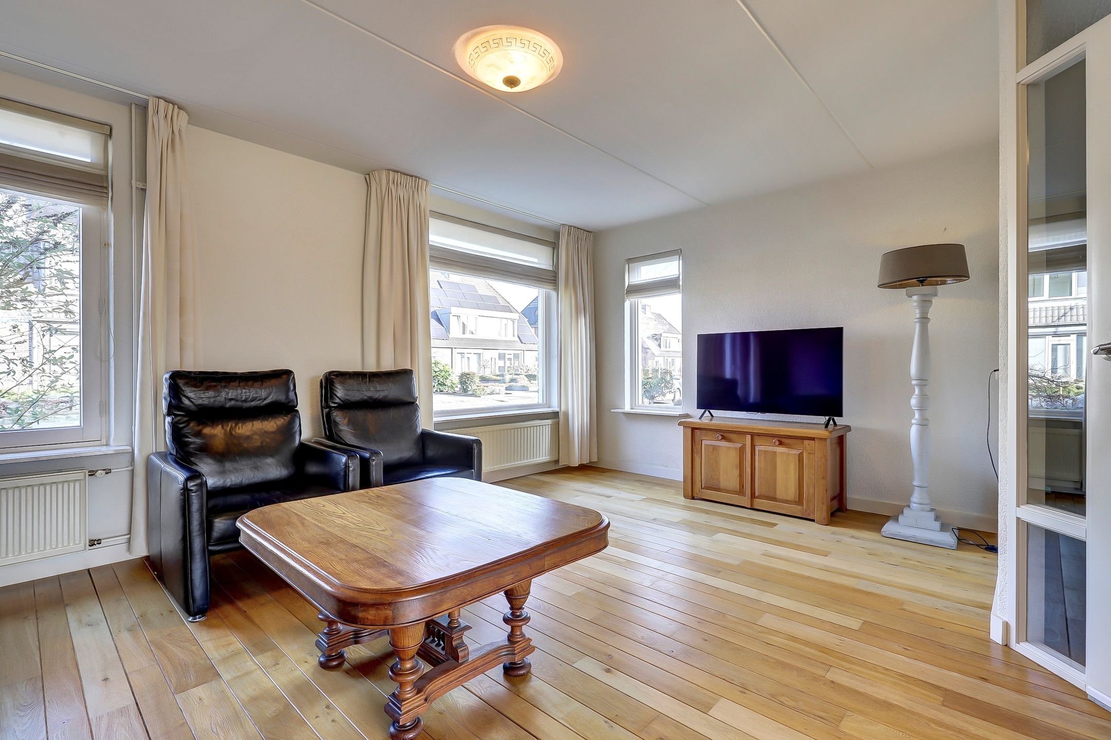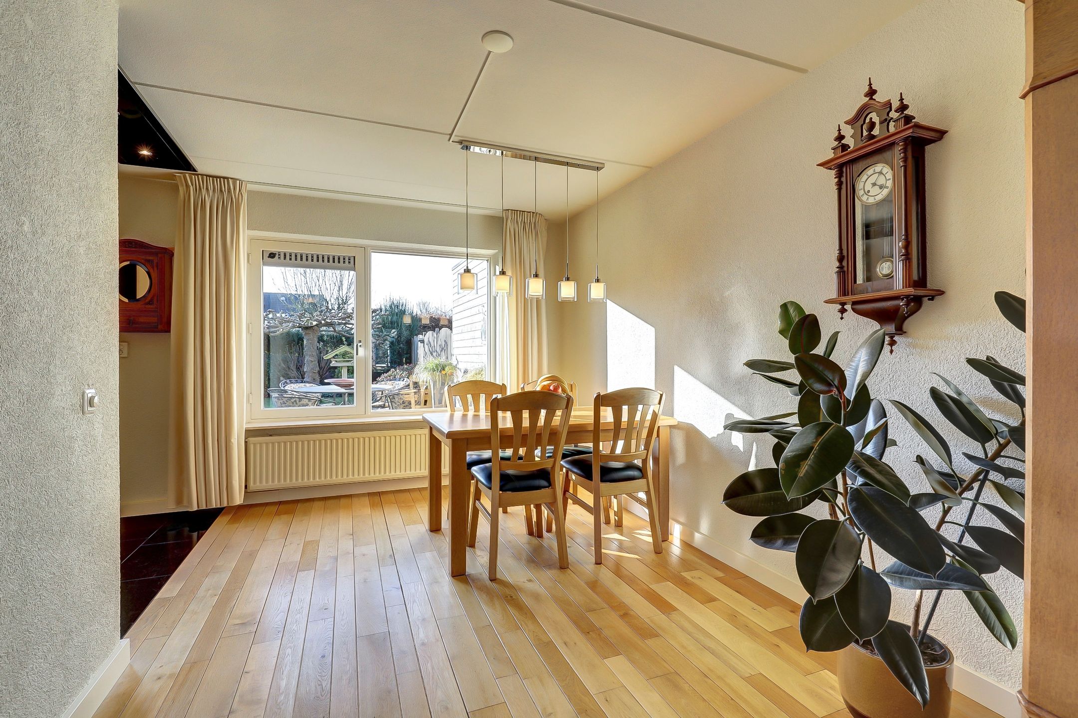 De woonkamer is aangenaam ruim en heerlijk licht. Aan de voorzijde zorgen drie grote ramen voor veel daglicht. Eén van de ramen is voorzien van een draaifunctie en een bovenlicht waardoor je niet alleen geniet van een open uitzicht, maar ook eenvoudig kunt ventileren. Richting de keuken is er volop ruimte voor een royale eettafel. Dé plek voor lange diners of gezellige momenten met familie en vrienden. Ook hier zorgt een grote raampartij met draaivenster en ventilatierooster voor extra licht en frisse lucht.