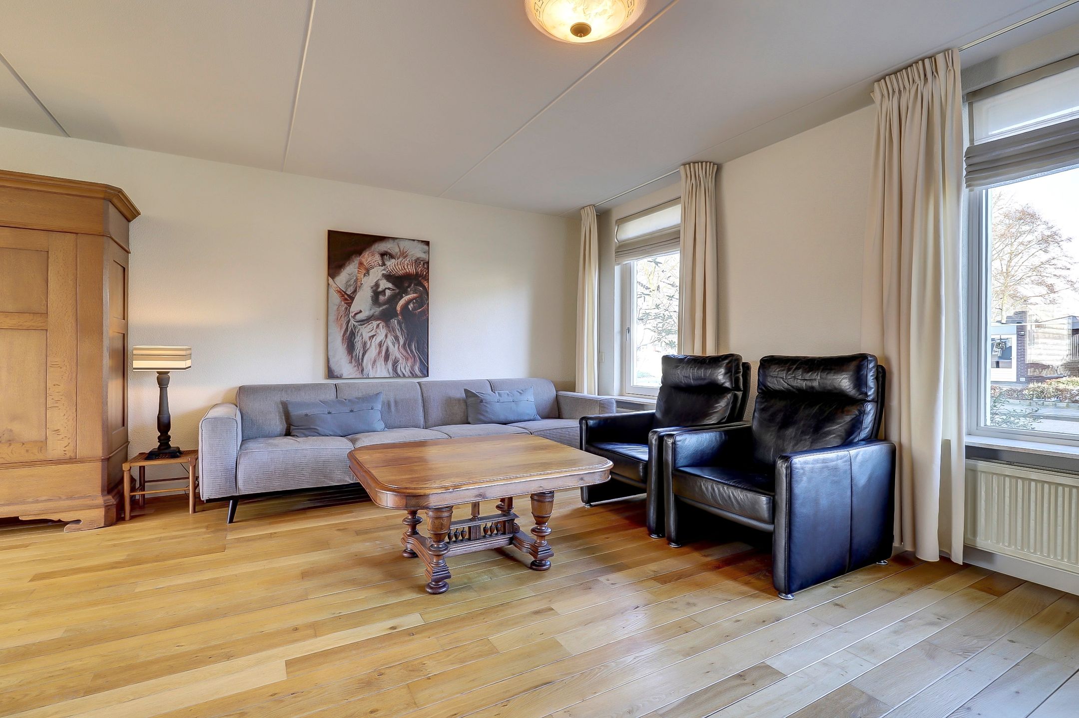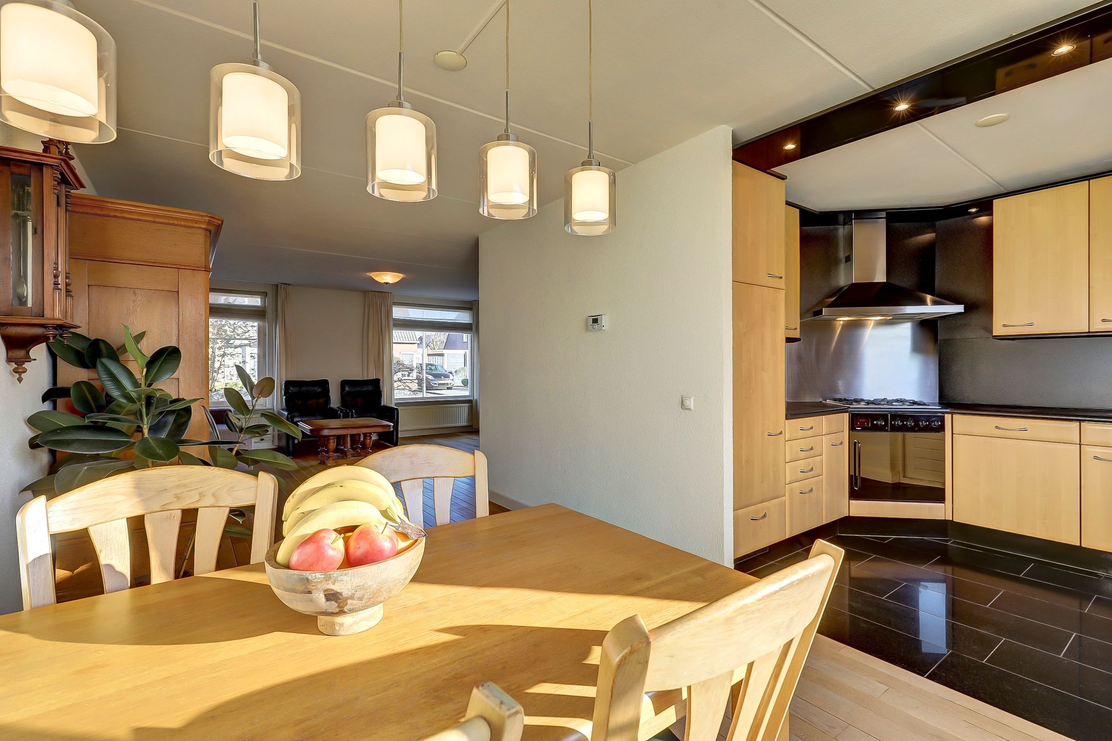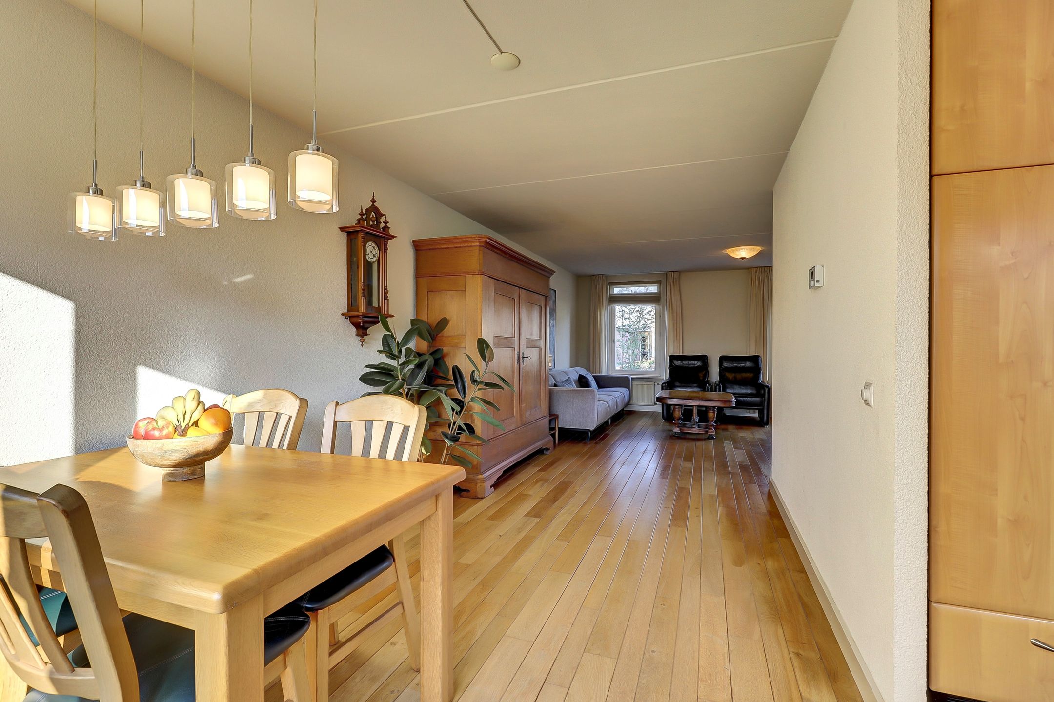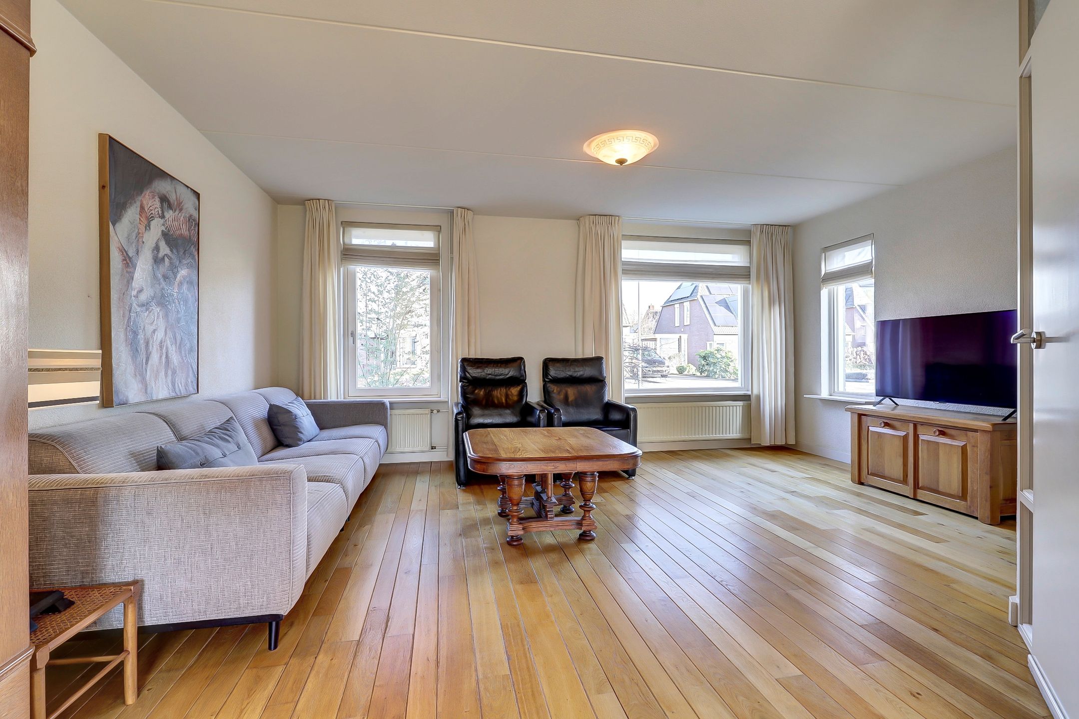 De woonkamer is aangenaam ruim en heerlijk licht. Aan de voorzijde zorgen drie grote ramen voor veel daglicht. Eén van de ramen is voorzien van een draaifunctie en een bovenlicht waardoor je niet alleen geniet van een open uitzicht, maar ook eenvoudig kunt ventileren. Richting de keuken is er volop ruimte voor een royale eettafel. Dé plek voor lange diners of gezellige momenten met familie en vrienden. Ook hier zorgt een grote raampartij met draaivenster en ventilatierooster voor extra licht en frisse lucht.