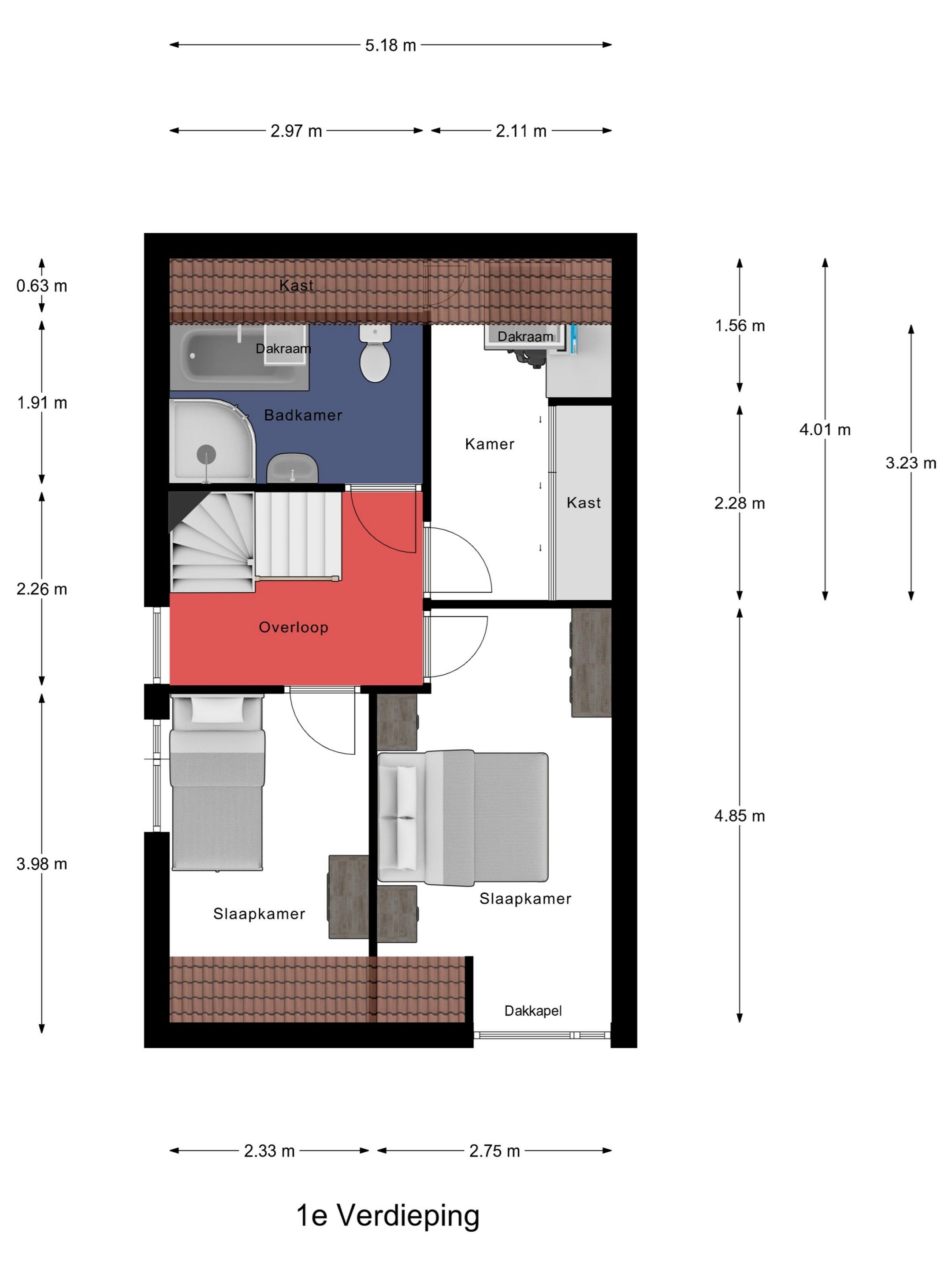 Via de trap in de hal, netjes bekleed met halve maantjes voor extra comfort en grip, bereik je de eerste verdieping. Boven aangekomen valt direct de ruime overloop op die dankzij het zijraam profiteert van een prettige en natuurlijke lichtinval. Dit zorgt voor een open en aangename sfeer op de hele verdieping. Hier bevinden zich drie slaapkamers en de badkamer.