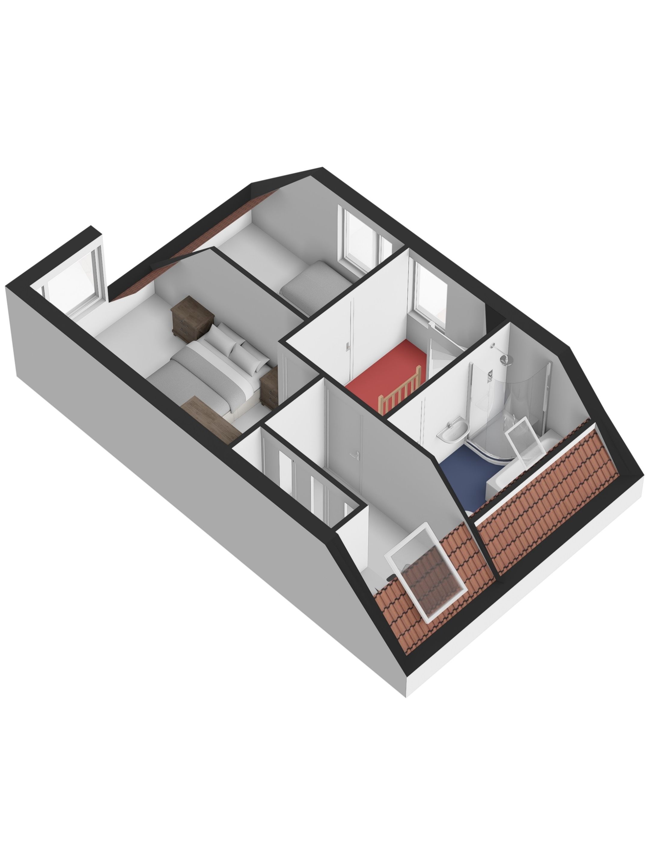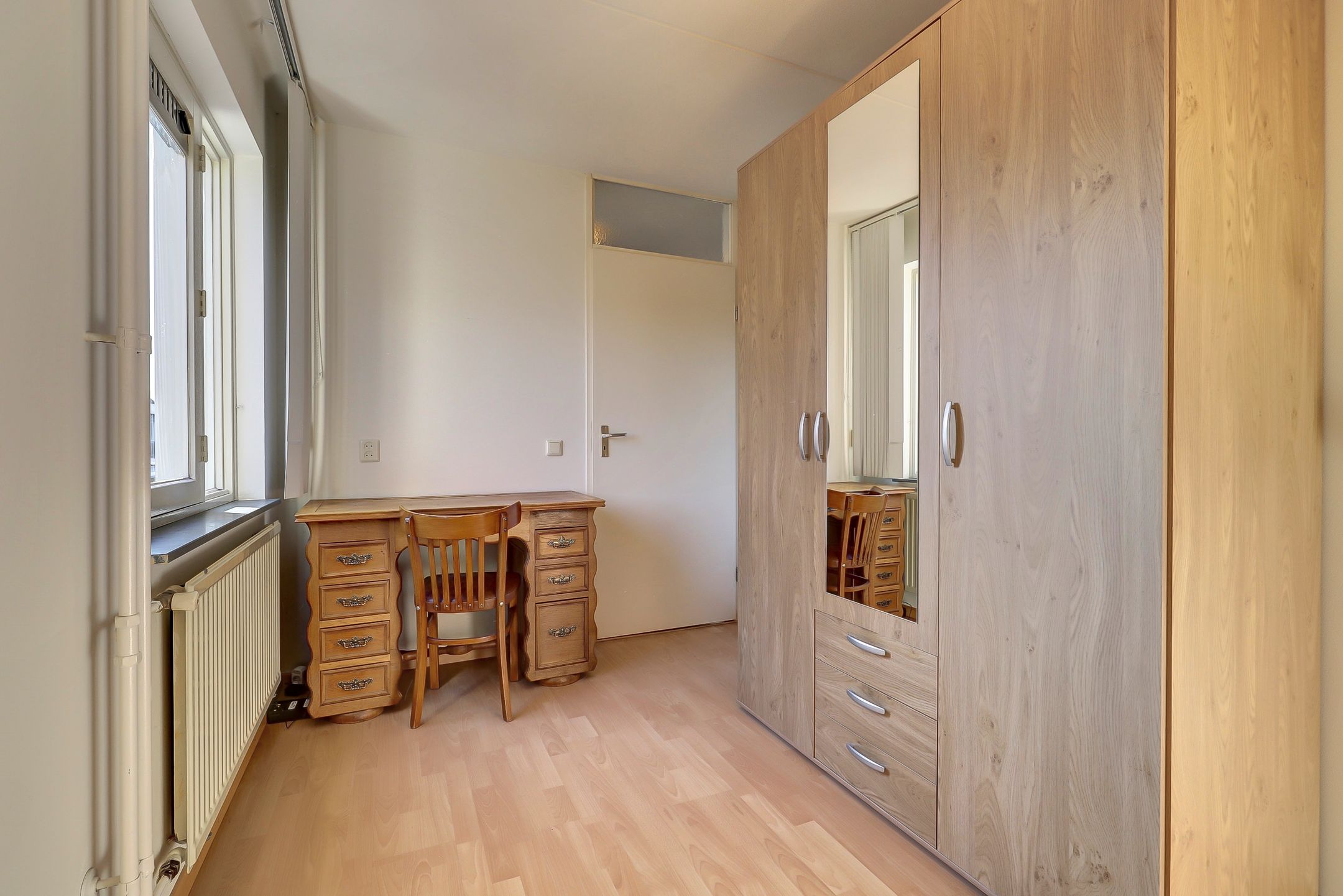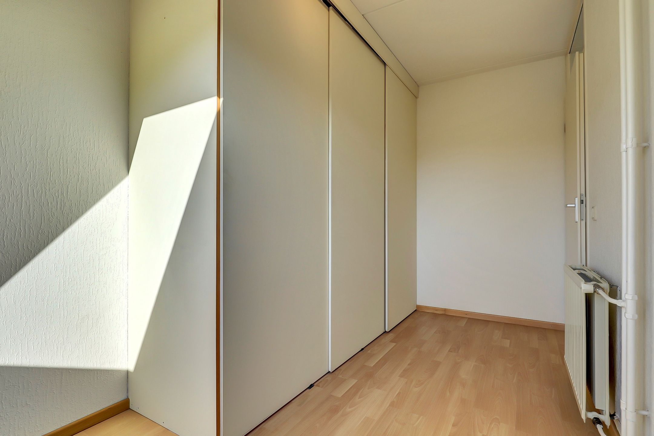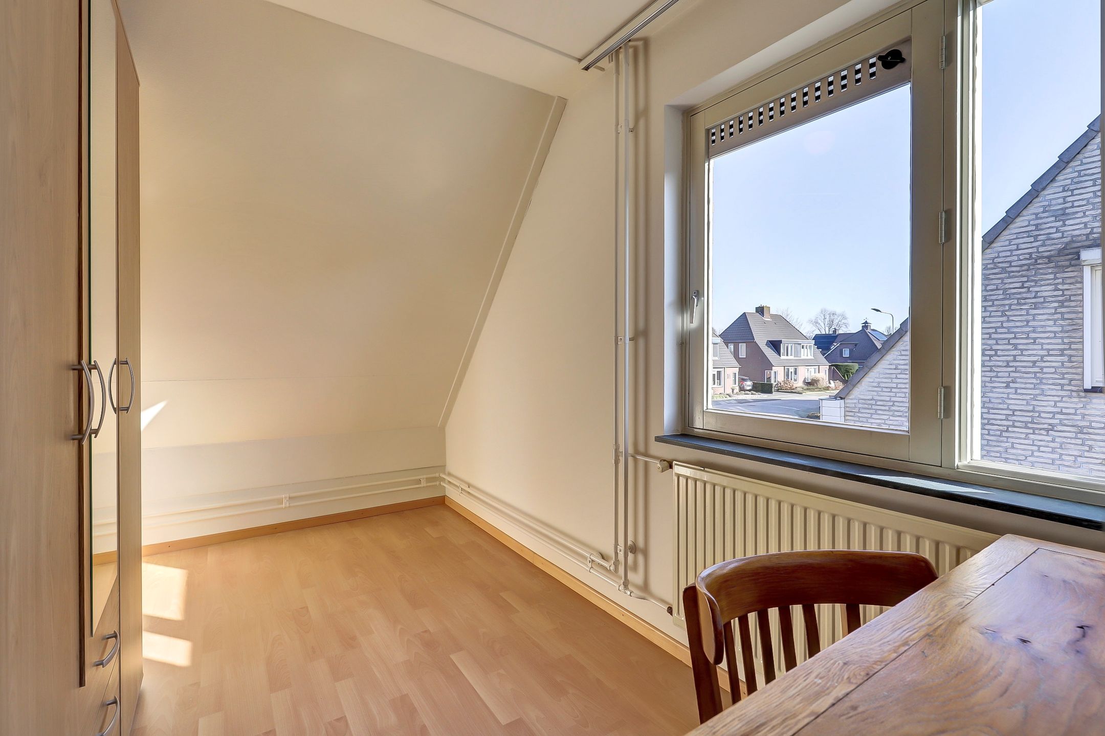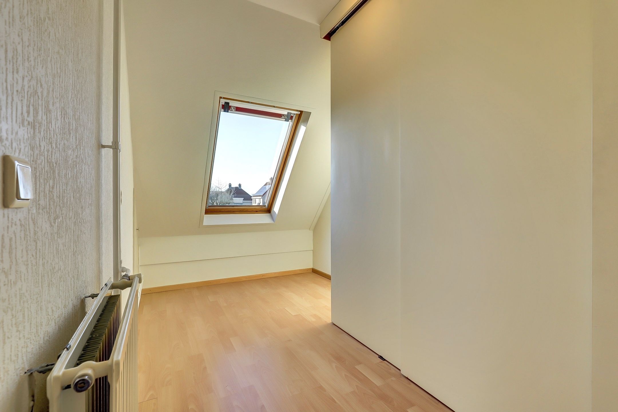 De twee overige slaapkamers zijn wat compacter van formaat maar daardoor juist ideaal als kinderkamer, logeerkamer of thuiswerkplek. De slaapkamer aan de voorkant beschikt over een zijraam met draaifunctie terwijl de kamer aan de achterzijde is voorzien van een groot Velux dakraam dat zorgt voor veel daglicht. In deze kamer vind je bovendien een praktische, grote inbouwkast met drie schuifdeuren. Perfect voor het opbergen van kleding, speelgoed of andere spullen. Beide kamers zijn afgewerkt met een nette laminaatvloer net zoals de overloop.