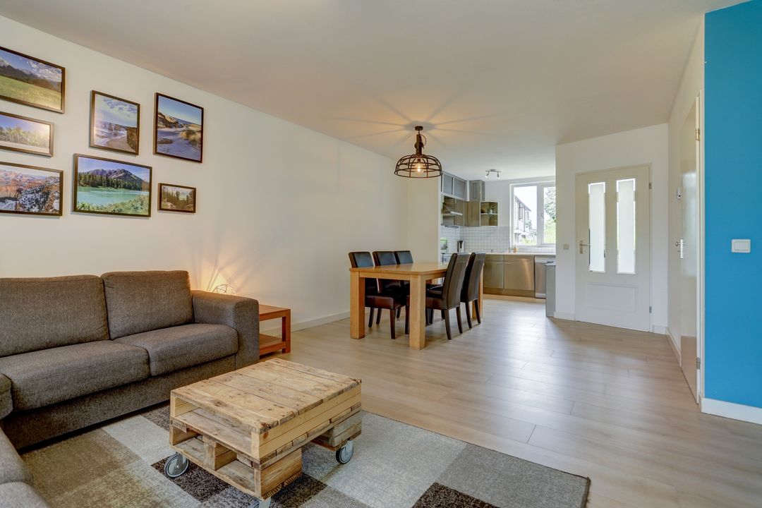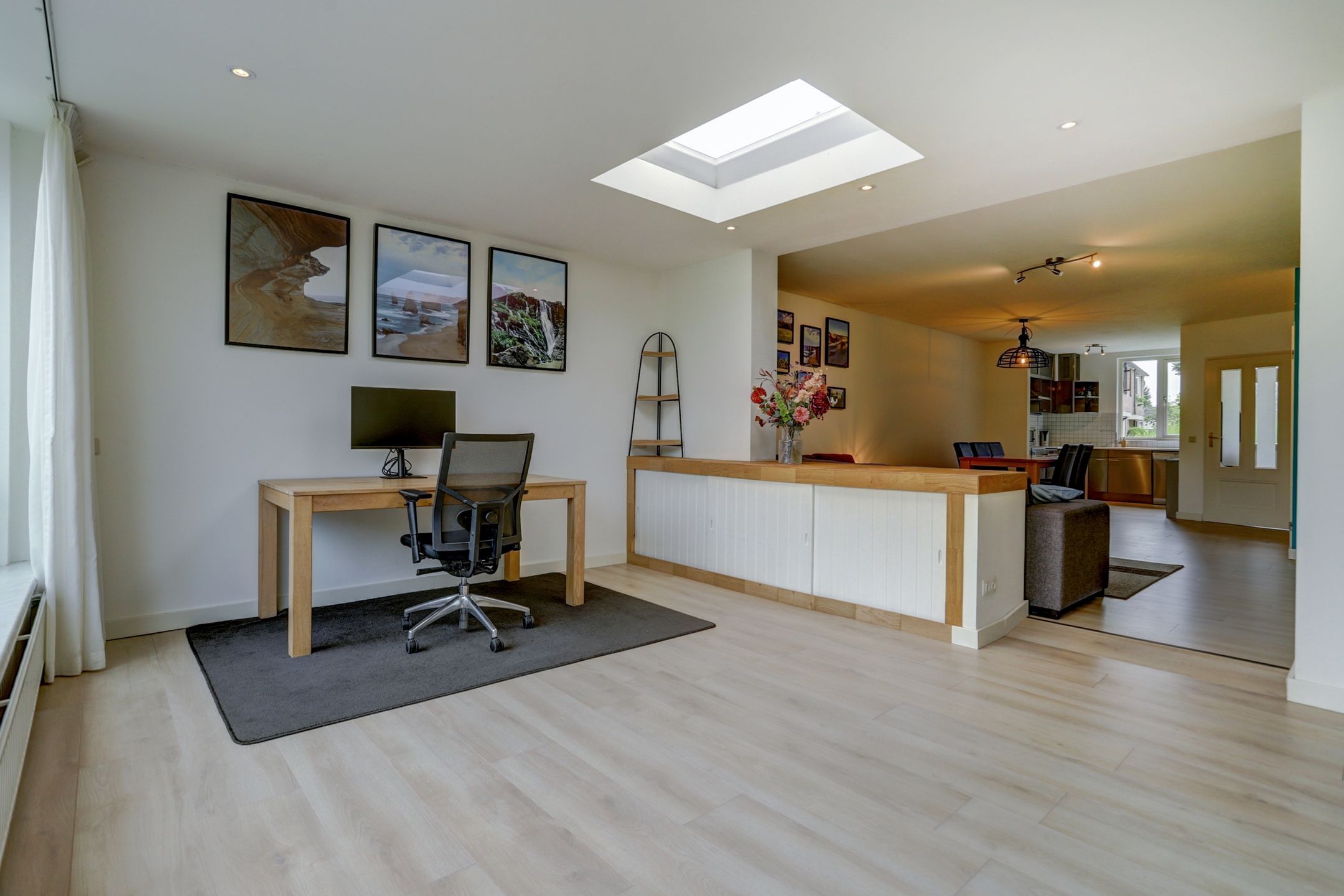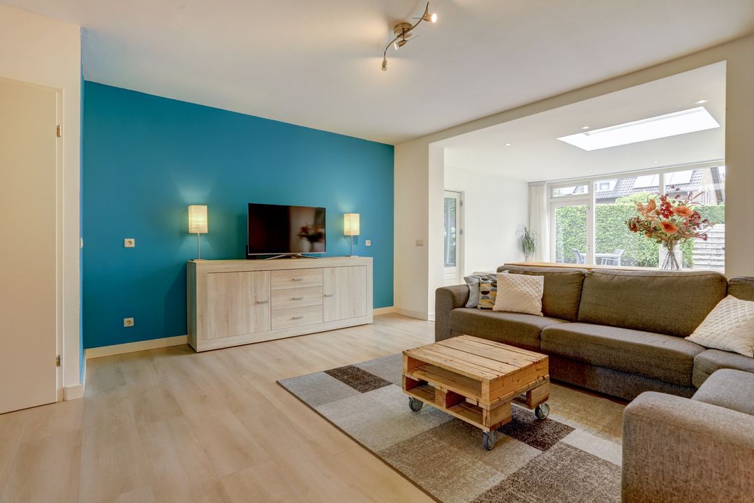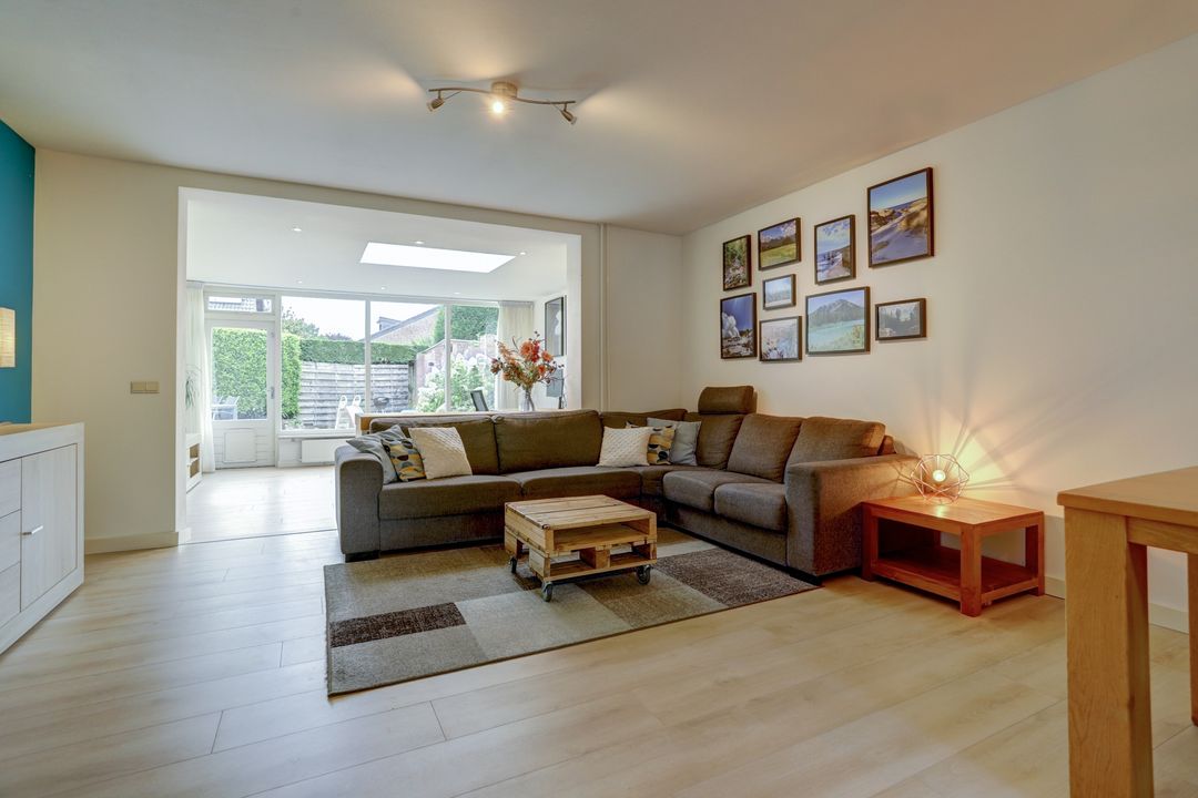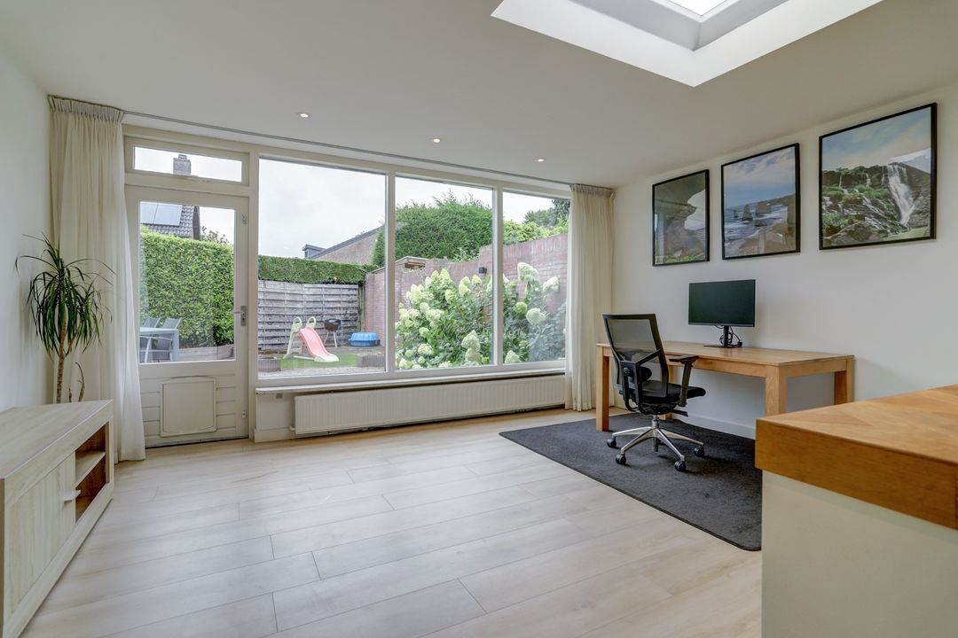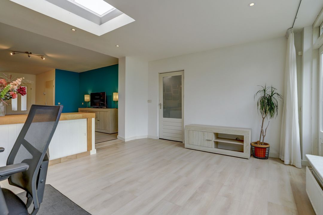 Door de uitbouw aan de achterkant van de woning is de woonkamer bijna verdubbeld in oppervlak! De kamer wordt door een lage, vaste kast met schuifdeuren als het ware opgedeeld in twee ruimtes. In het voorste deel is een grote zithoek gemaakt en in het achterste deel heb je fijn uitzicht op de tuin door de grote ramen. In het plafond is een lichtkoepel gemaakt waardoor er nog meer natuurlijk lichtinval is. In deze ruimte kun je een extra zithoek maken of een fijne speelplek voor de kinderen. Het behoort zelfs tot de mogelijkheden om hier een slaapkamer te creëren!
