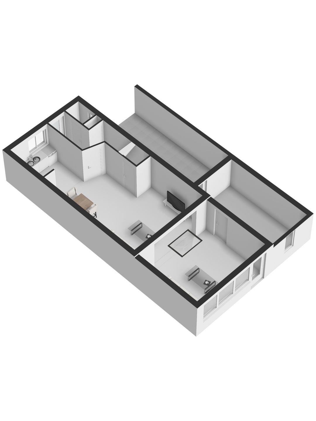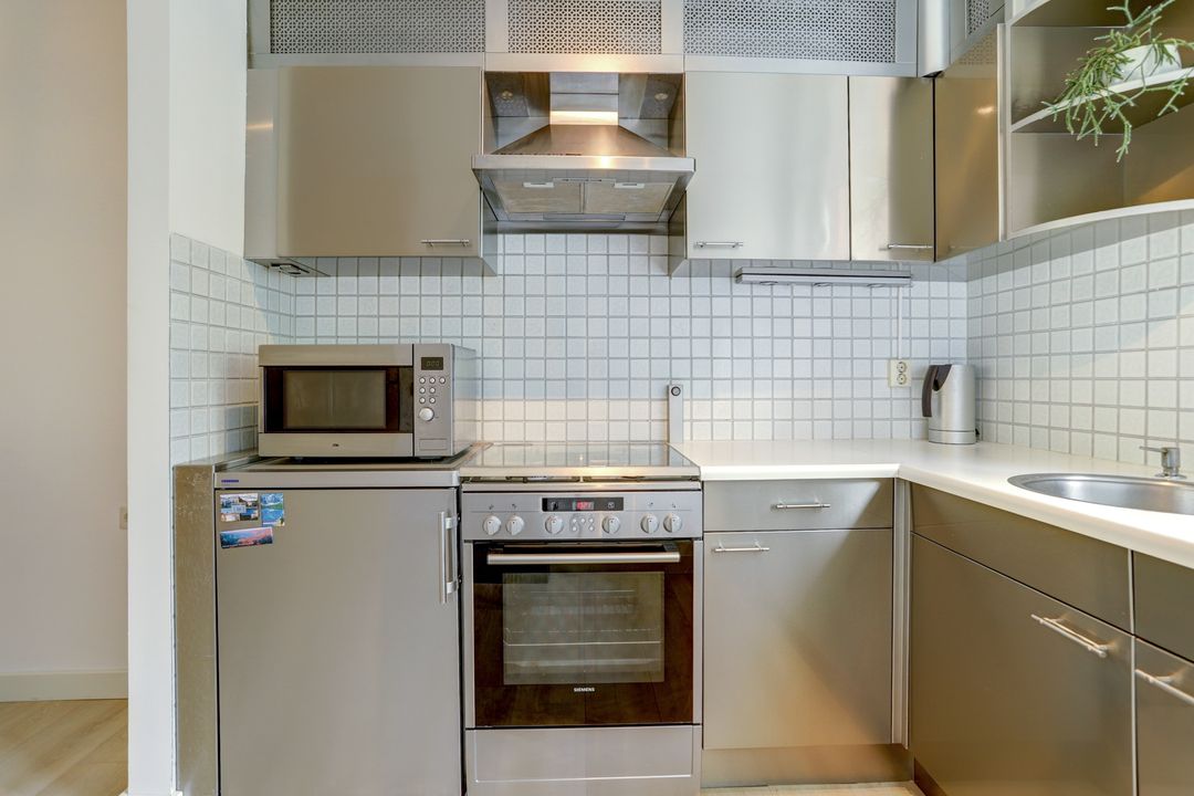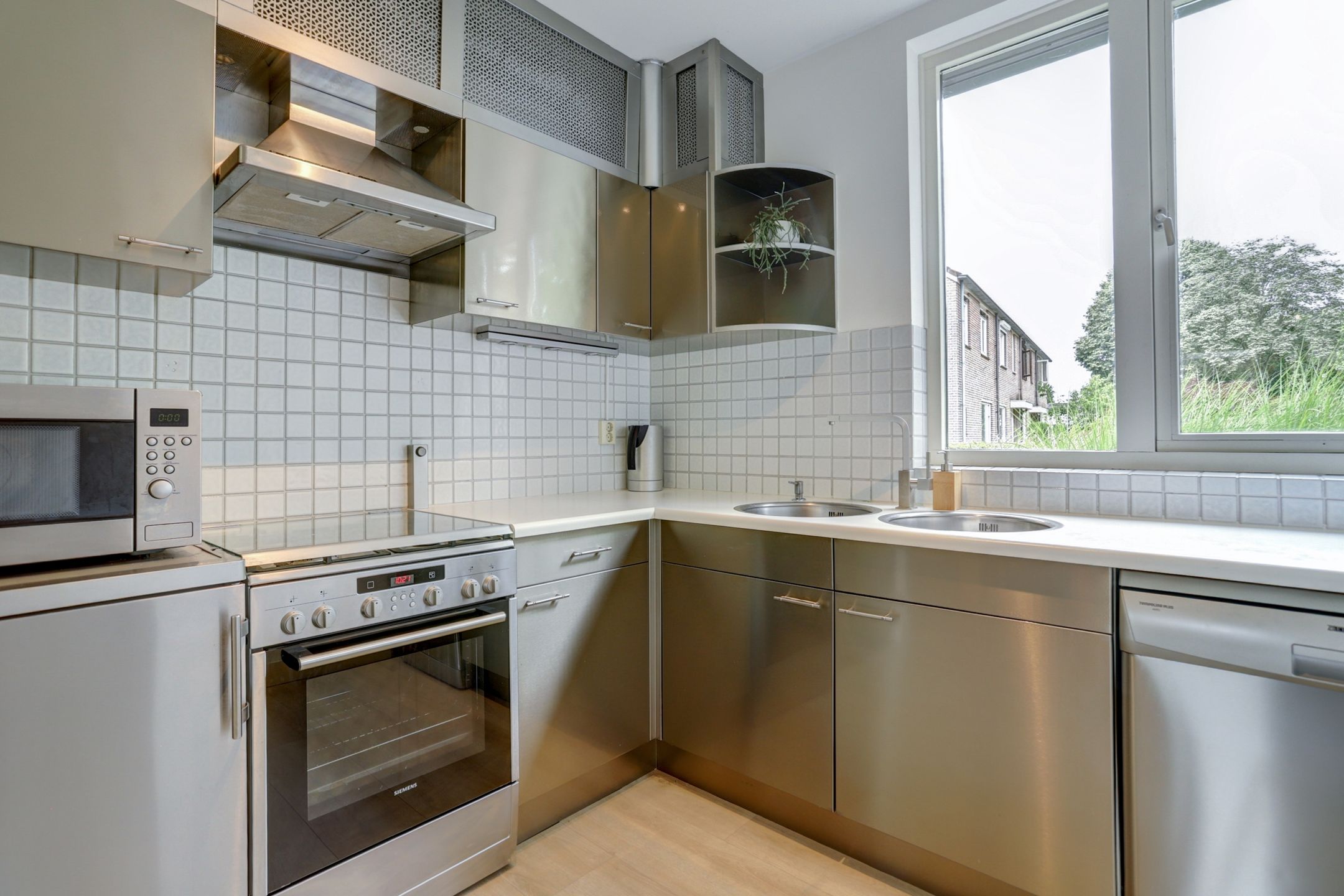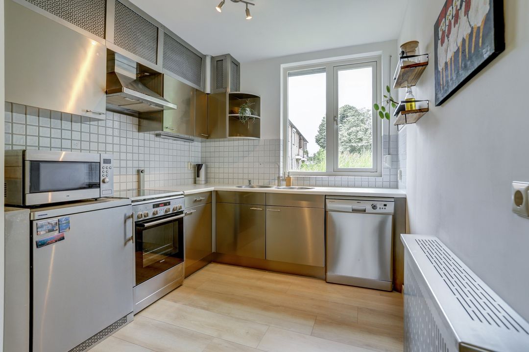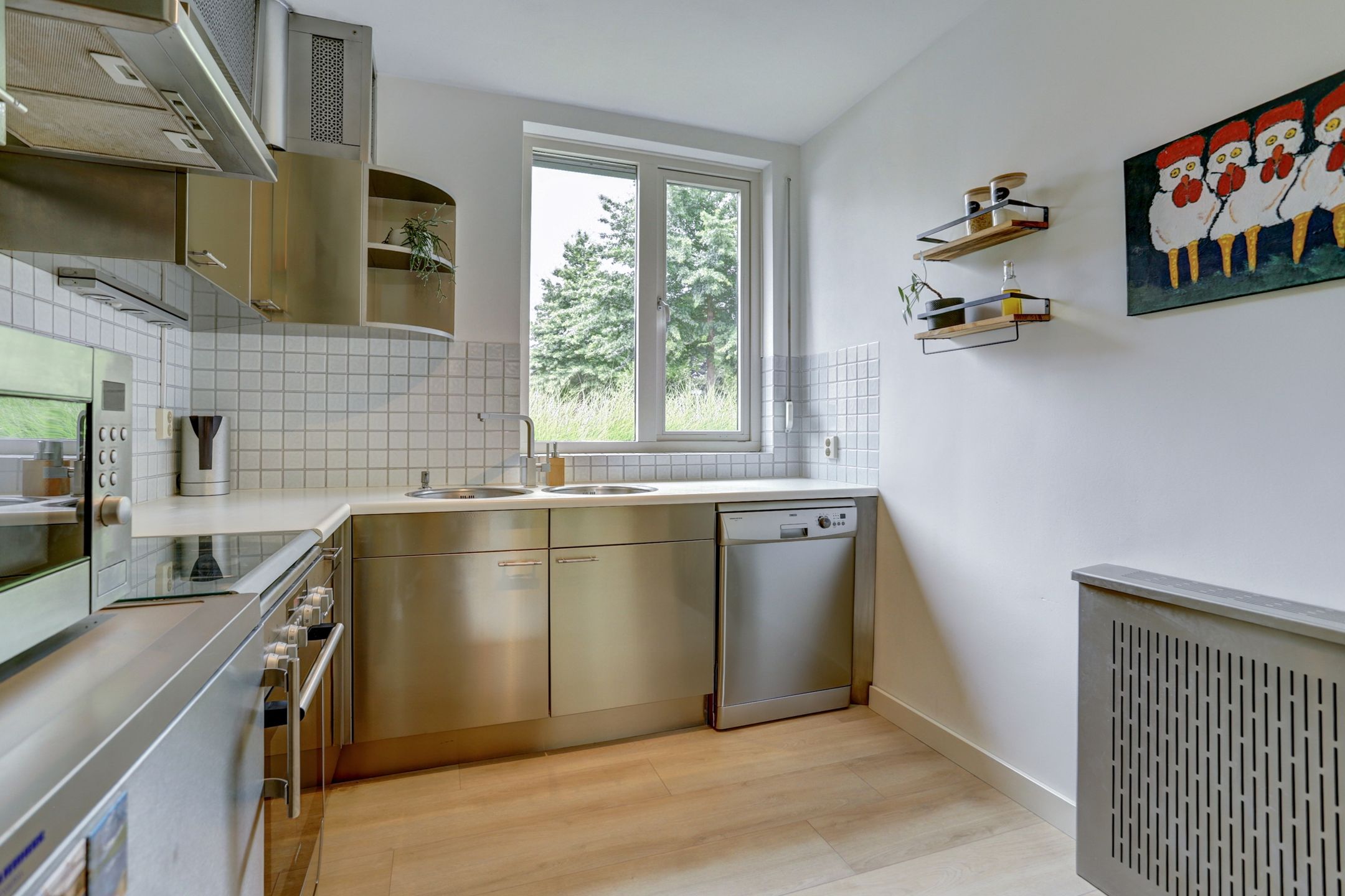De keuken bevindt zich aan de voorkant van de woning en via een raam met draaifunctie en rolluik heb je zicht op de straat en het speelveld dat voor de woning ligt. De keuken is eenvoudig maar functioneel ingericht en beschikt over een vierpits gasfornuis, een oven, kleine koelkast met vriesvak en een vaatwasser.