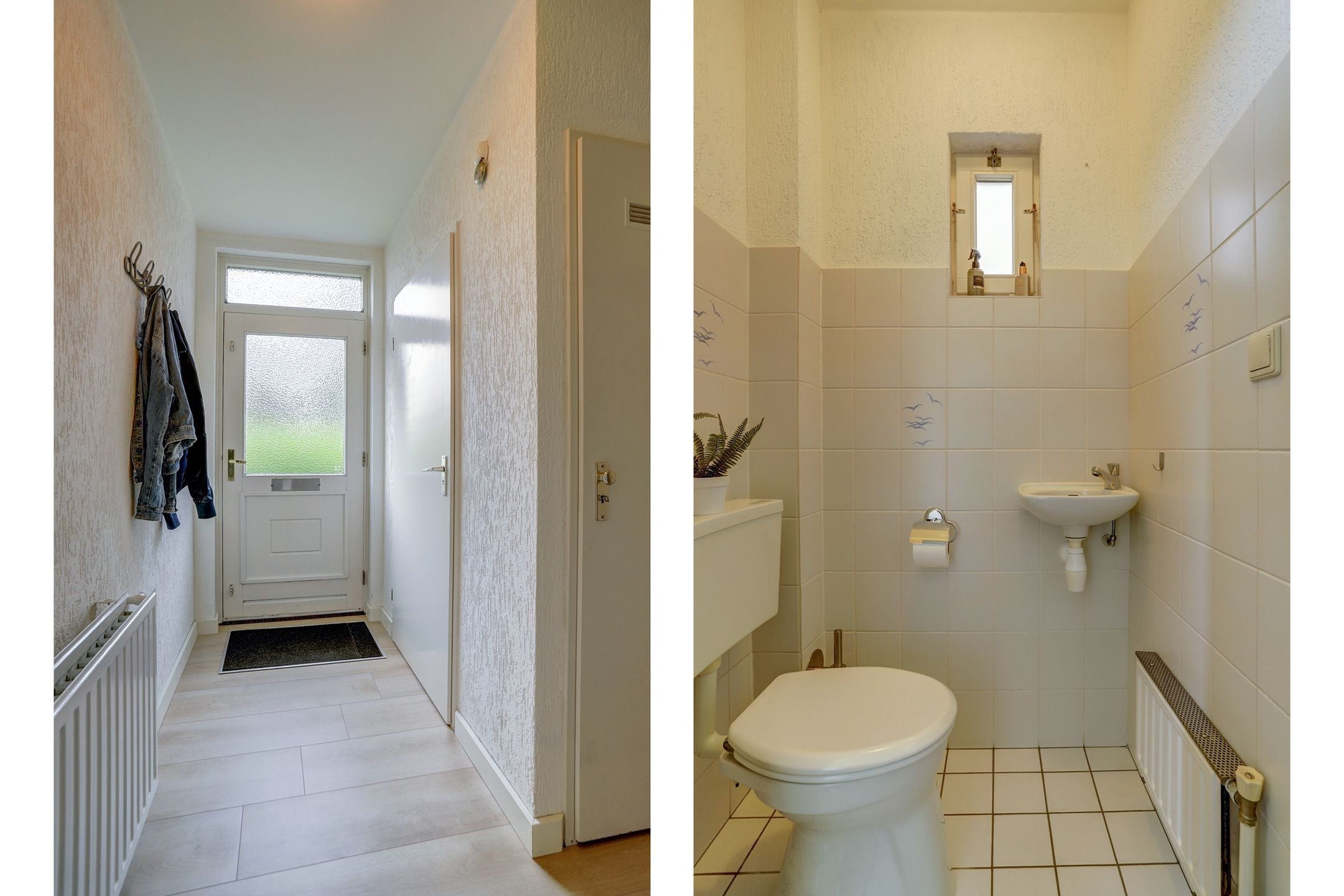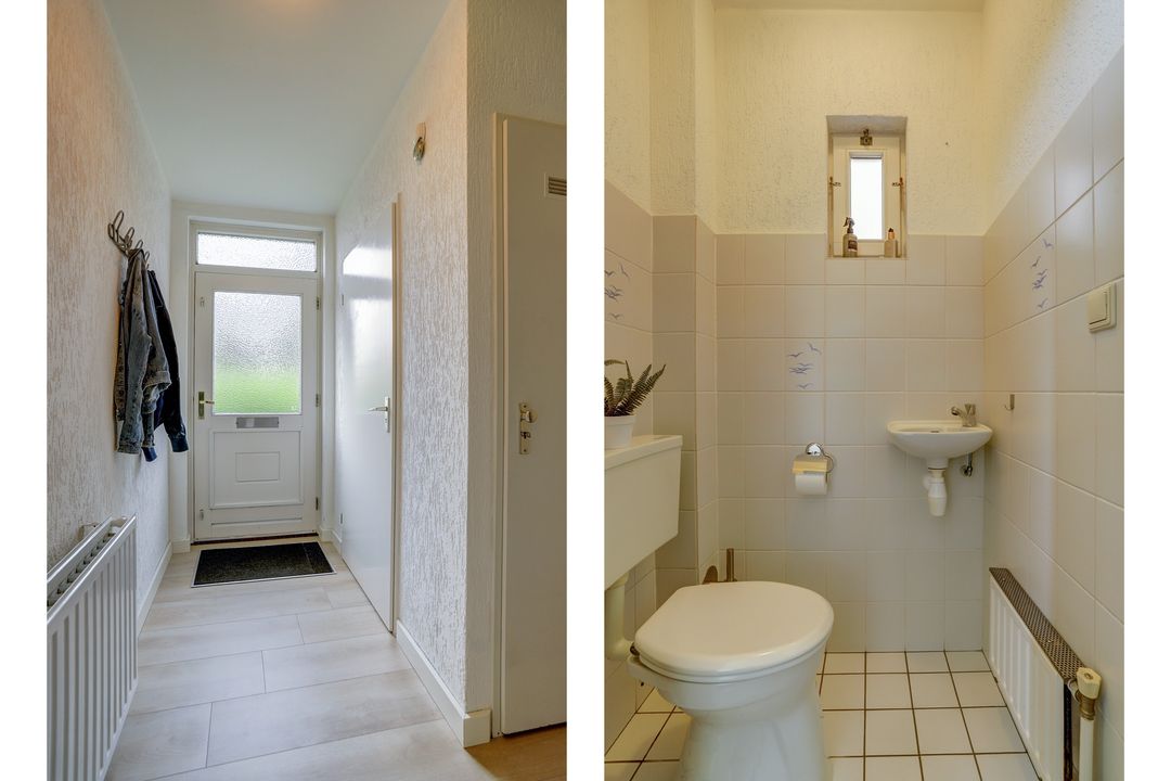 Via de oprit en een klein paadje bereik je de voordeur die toegang geeft tot de hal. In deze hal is een betegelde toiletruimte aanwezig, met een staand toilet, fonteintje en kiepraam, en de meterkast met aansluiting op het glasvezelnetwerk. Direct achter de voordeur heb je via een luik toegang tot de kruipruimte die tot aan de aanbouw doorloopt. De gehele begane grond is voorzien van een laminaatvloer in een lichte kleur.
