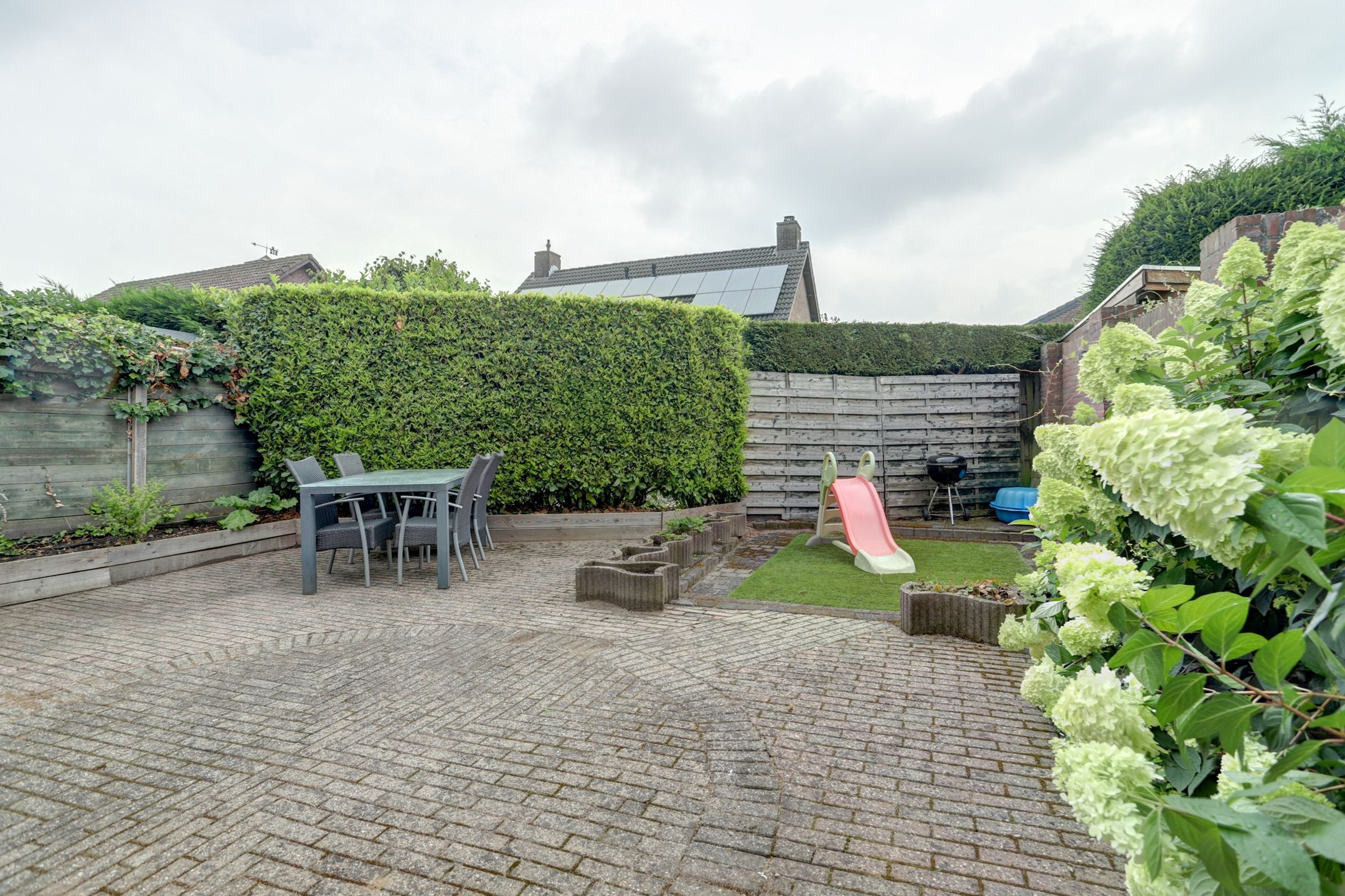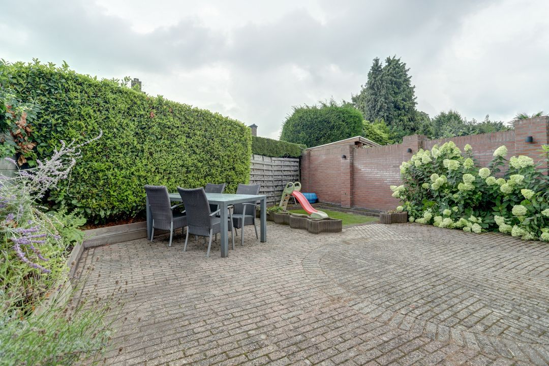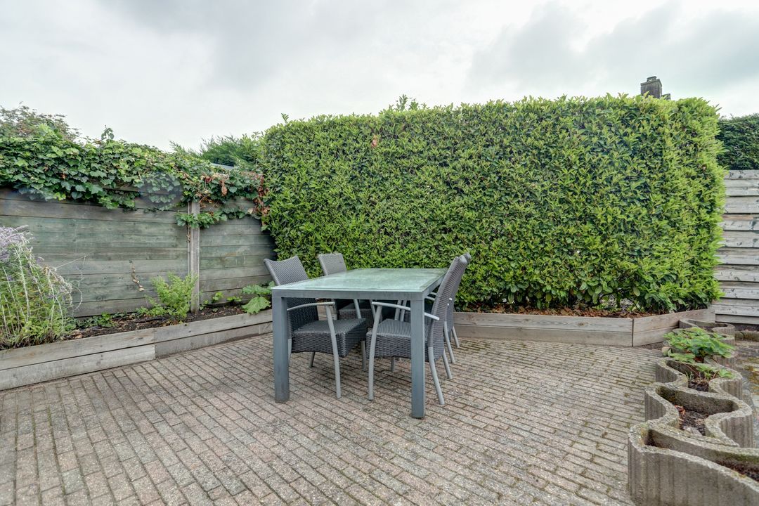 De achtertuin is volledig omheind en daardoor ook veilig voor kinderen en huisdieren. De tuin is onderhoudsvriendelijk aangelegd en heeft twee terrassen waarvan er één overdekt te maken is door middel van een elektrisch te bedienen zonnescherm. In de borders staan diverse volwassen planten waardoor de tuin het hele jaar door groen is.