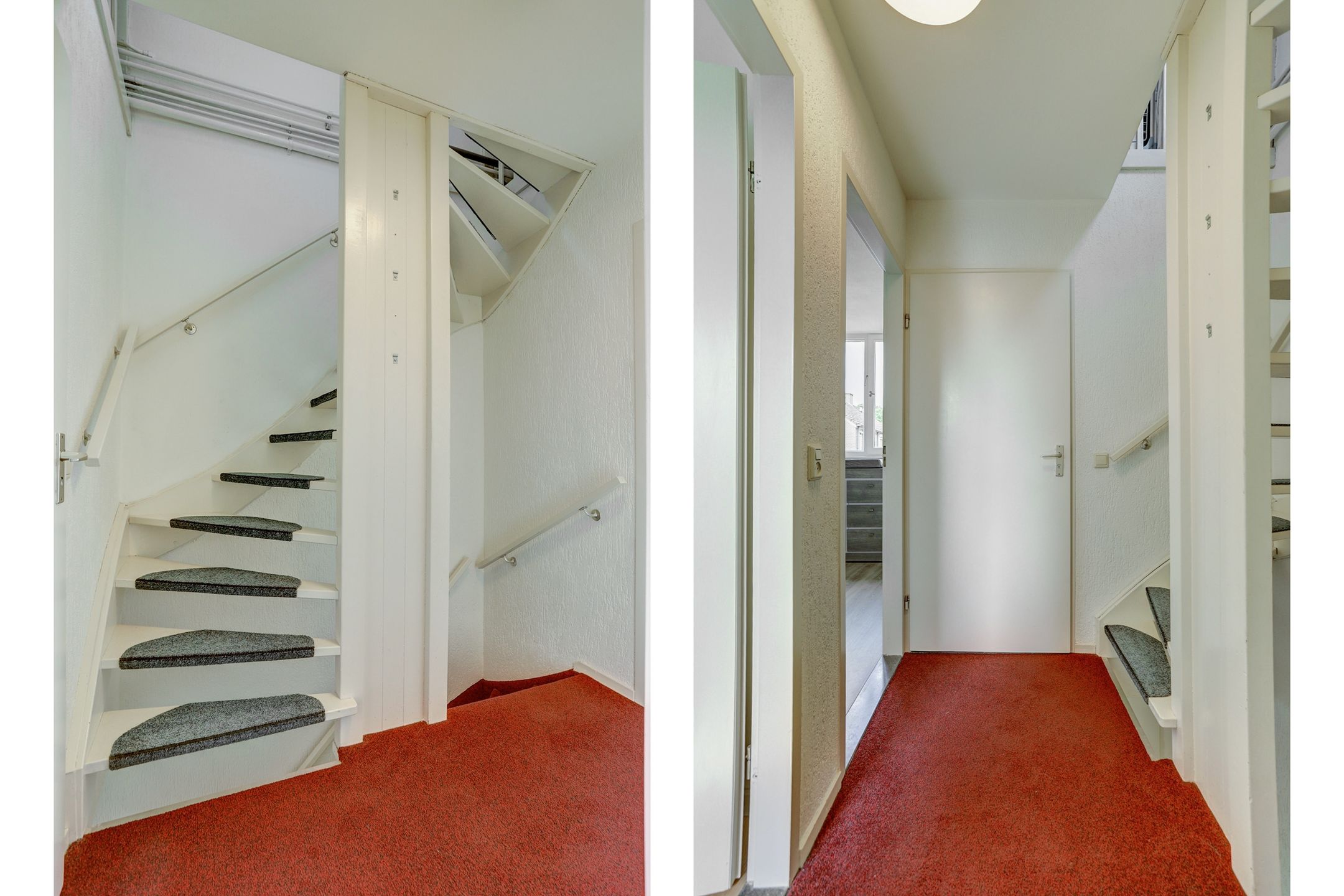 De trap in de hal leidt naar de eerste verdieping waar zich drie slaapkamers en een badkamer bevinden.