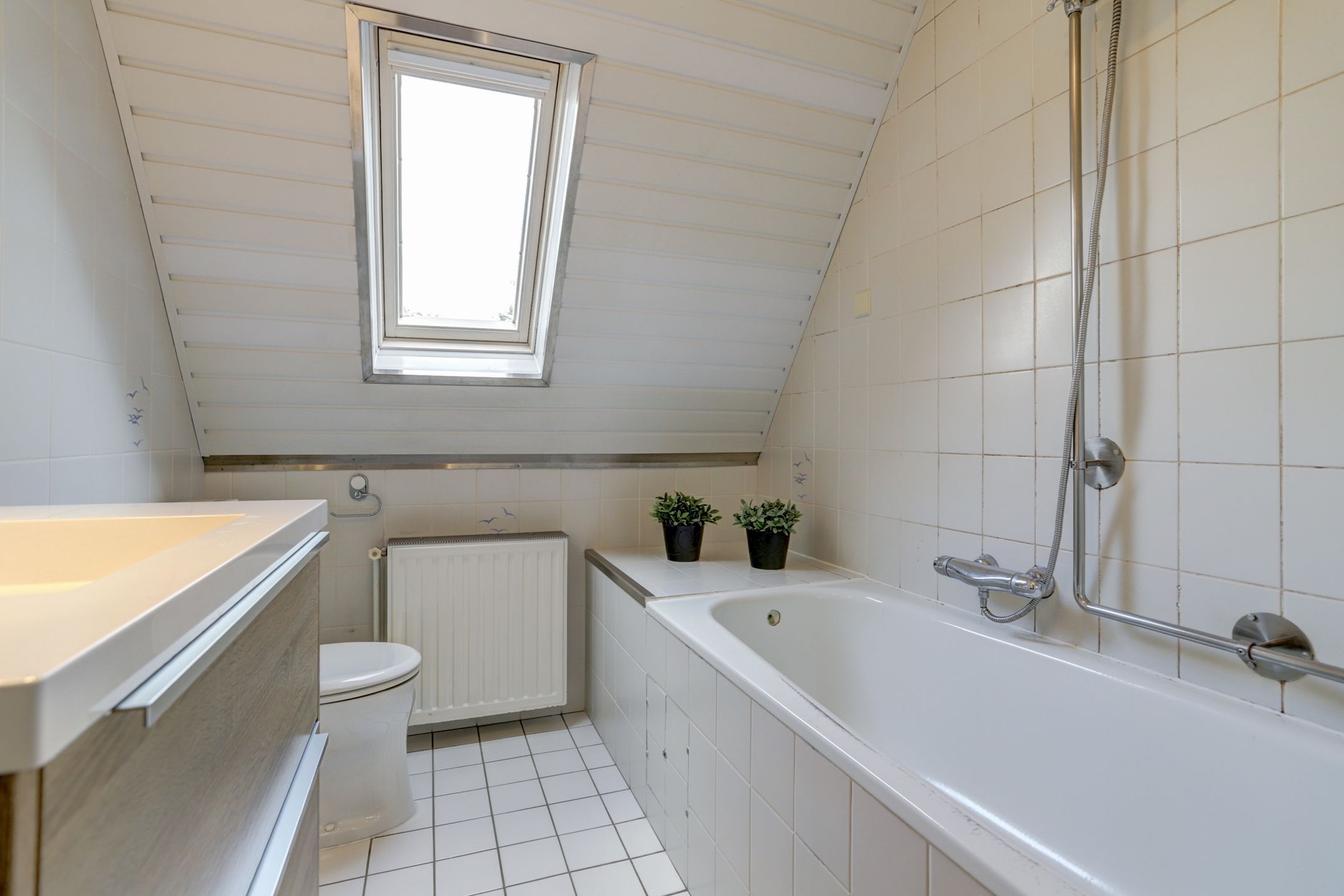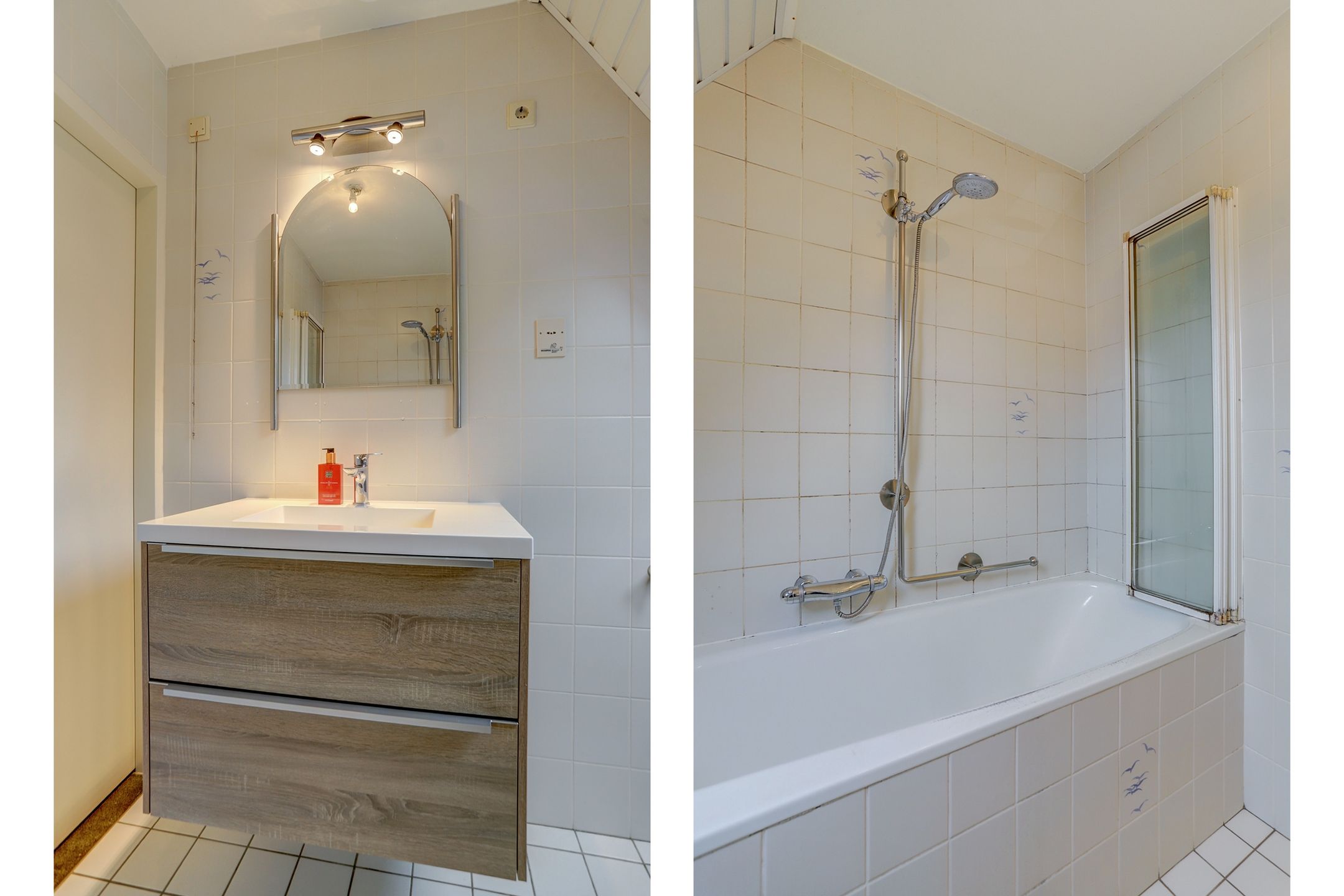 De badkamer is enigszins verouderd maar functioneel en uitgevoerd in neutrale kleuren. In het ligbad is een uitklapbaar douchescherm geplaatst zodat je ook kunt douchen in bad. Verder beschikt de badkamer over een toilet, een wastafel met meubel en een Velux dakraam.