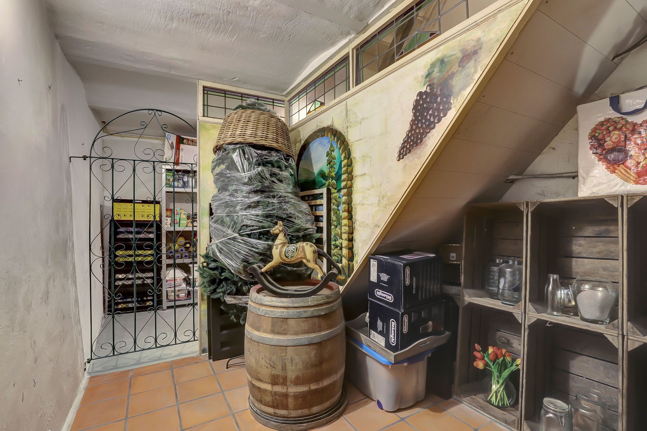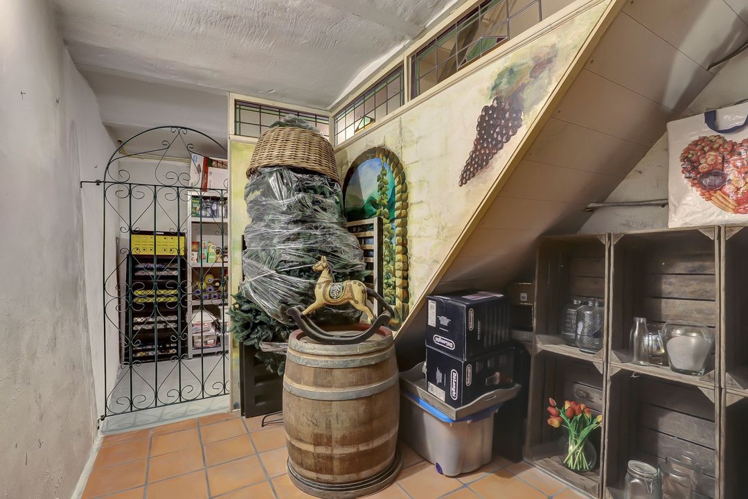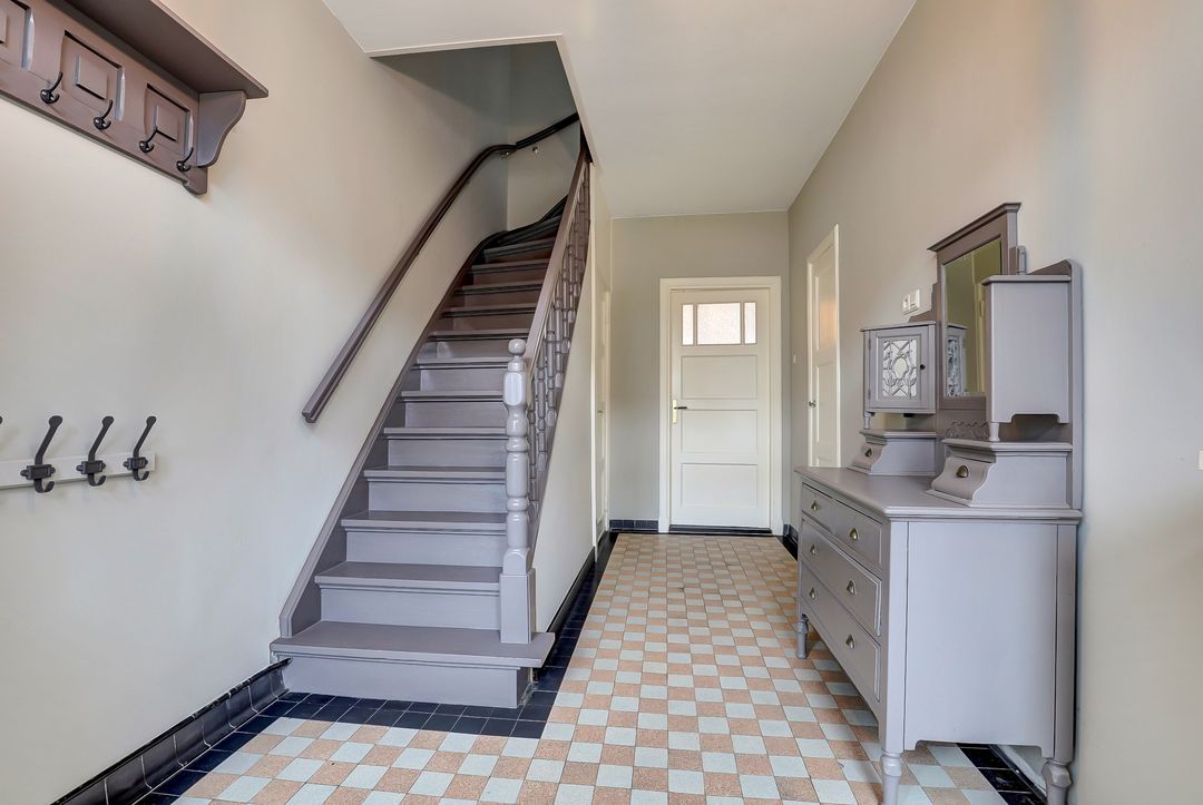 Via een charmant paadje door de verzorgde voortuin, omheind door sierlijke hekjes en groene heggen, wandel je naar de prachtige voordeur. Deze is nog maar anderhalf jaar geleden vernieuwd geheel in jaren ’30 stijl, maar met het comfort van nu. De hal verwelkomt je met een originele authentieke tegelvloer, die uitzonderlijk goed bewaard is gebleven en meteen karakter toevoegt. In de houten kast bevindt zich de meterkast met glasvezelaansluiting, terwijl een handige garderobekast zorgt voor een opgeruimde entree. Achter een deur ligt de trap naar de kelder waar een stalen poortje toegang geeft tot de wijnkelder. De ruimte is ideaal voor het bewaren van wijn maar natuurlijk ook voor voorraad of andere spullen. In de kelder is ook de verdeler van de vloerverwarming geplaatst en bovenaan bij de trap hangt de Nefit CV ketel (2018).