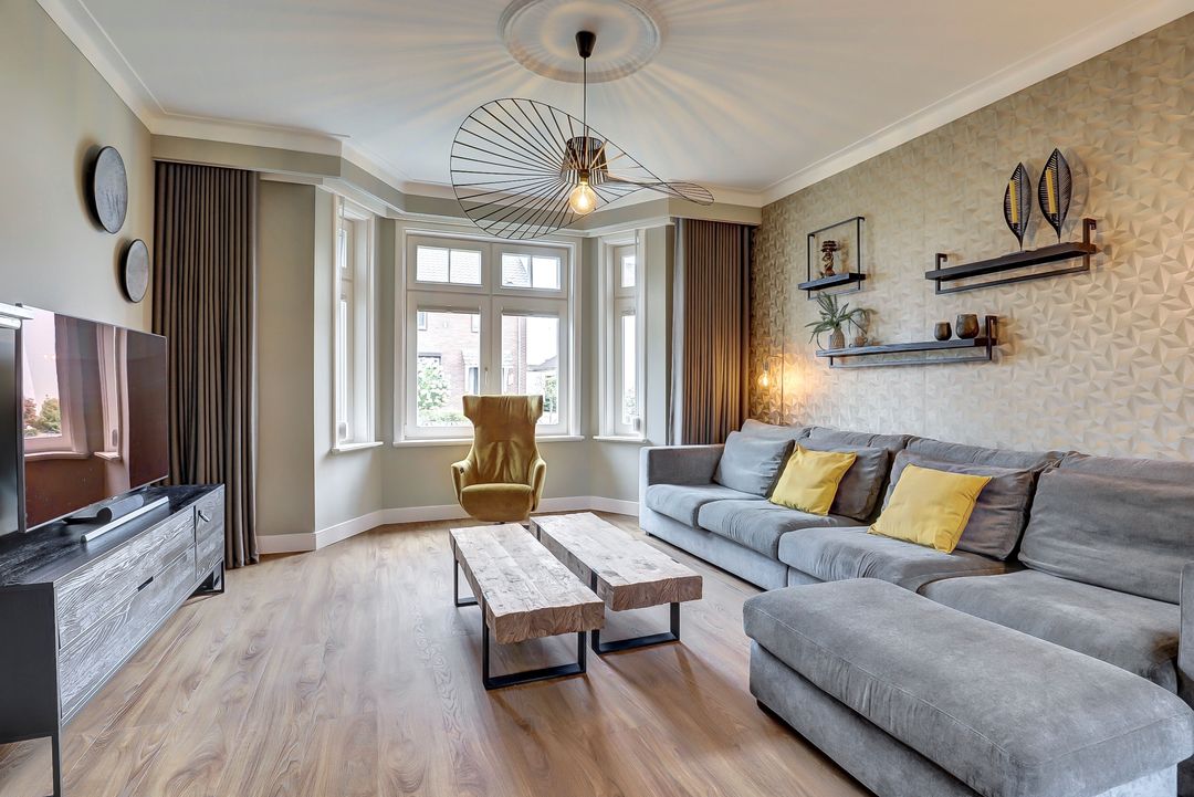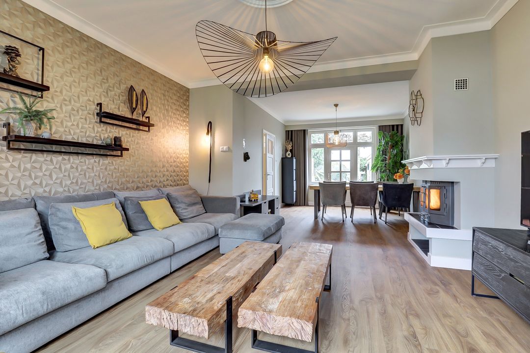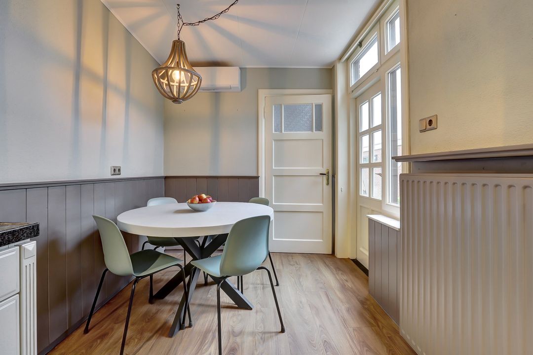 De woonkamer ademt pure jaren ’30 charme en is tot in de details perfect gestyled. De houtkachel vormt het warme middelpunt van de ruimte, waar je ’s avonds heerlijk bij kunt ontspannen. De erker aan de voorzijde vangt het zonlicht vanuit het zuidwesten, waardoor de woonkamer een prettige, lichte sfeer heeft. Op warme dagen kun je de markies buiten uitrollen en de rolluikjes sluiten voor verkoeling en privacy. Aan de achterzijde zorgt de openslaande deur voor een directe verbinding met het terras onder de plataanboom, een prachtige plek om te genieten van de rust en het uitzicht. Zowel de woonkamer als de keuken en de bijkeuken en toilet zijn afgewerkt met een pvc-vloer in houtmotief en voorzien van vloerverwarming, wat zorgt voor zowel comfort als een stijlvolle uitstraling.
