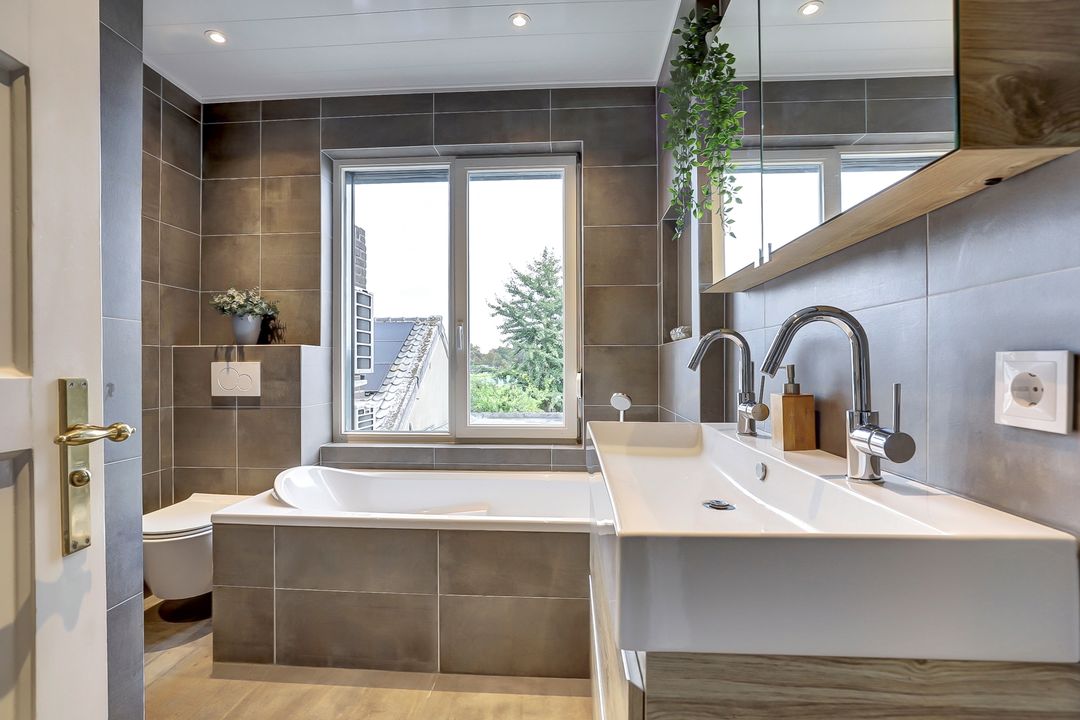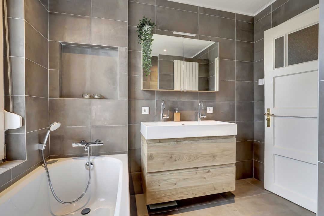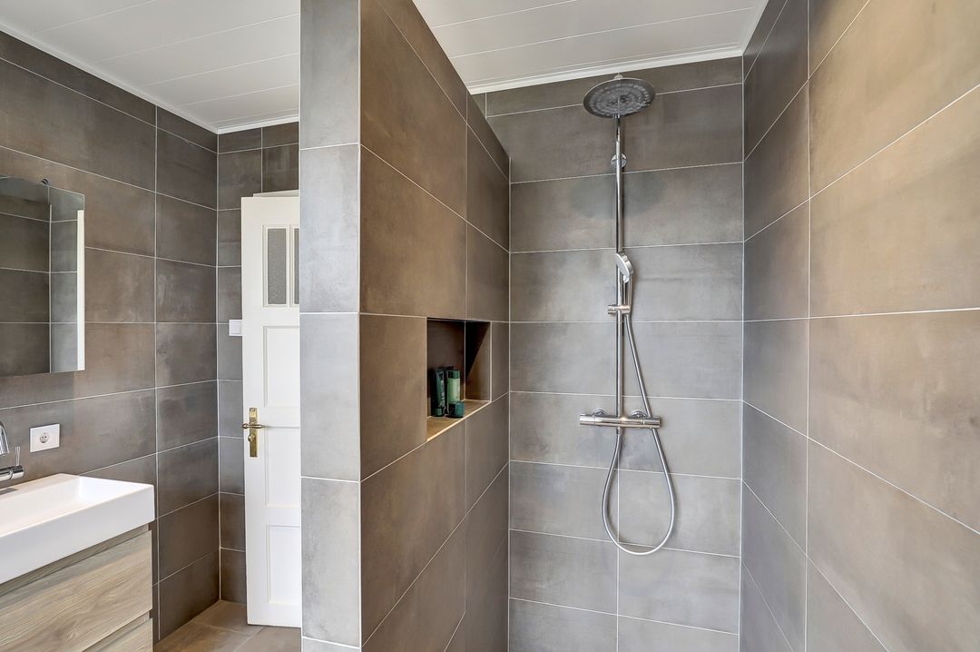 De badkamer is praktisch en sfeervol ingericht met alles wat je nodig hebt voor een comfortabel dagelijks ritueel. De ruime inloopdouche heeft zowel een grote regendouche als een handdouche en in de ingebouwde nis is plek voor shampoo en zeep. Daarnaast is er een ligbad om heerlijk in te ontspannen en een dubbele wastafel met opbergmeubel, zodat er voor iedereen genoeg ruimte is. De elektrische designradiator zorgt voor een behaaglijke temperatuur, ook op koude ochtenden. Wat deze badkamer extra bijzonder maakt is het vrije uitzicht over de achterliggende landerijen. Je geniet van het licht en het uitzicht zonder inkijk van buren. Voor extra privacy kun je de rolluiken bij de draaikiepvensters sluiten. De afwerking in rustige natuurtinten geeft de ruimte een kalme sfeer waarin je helemaal tot rust komt.