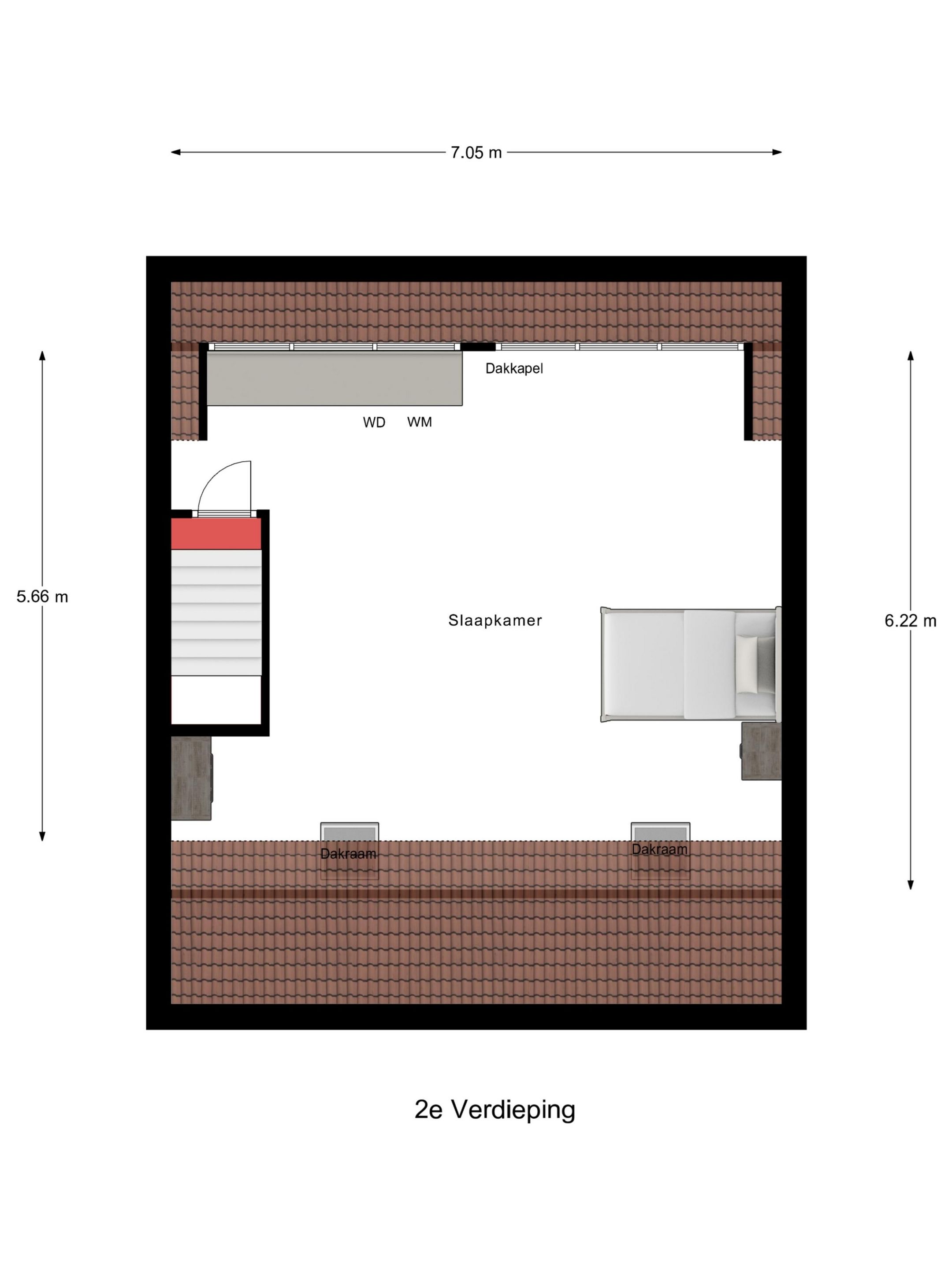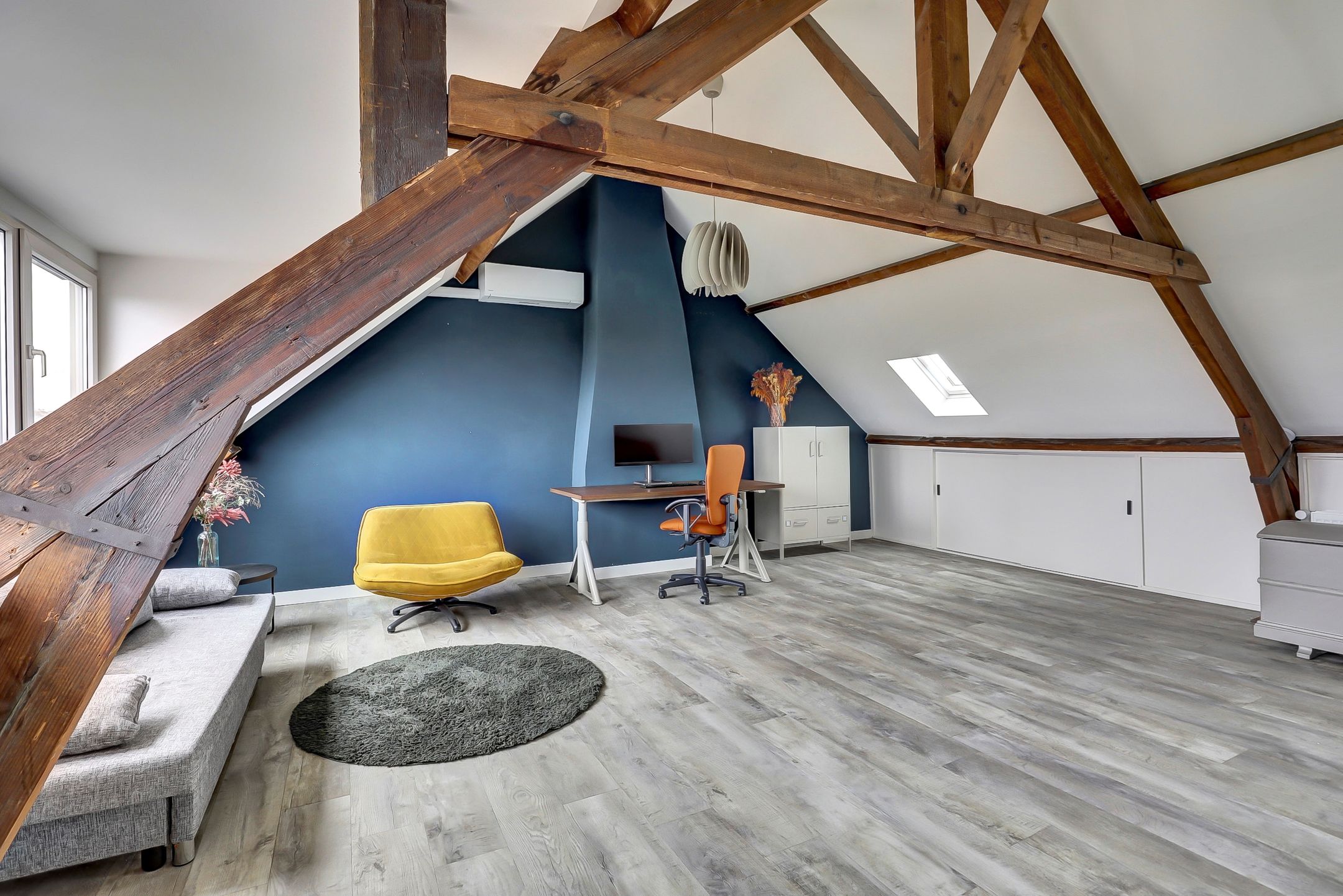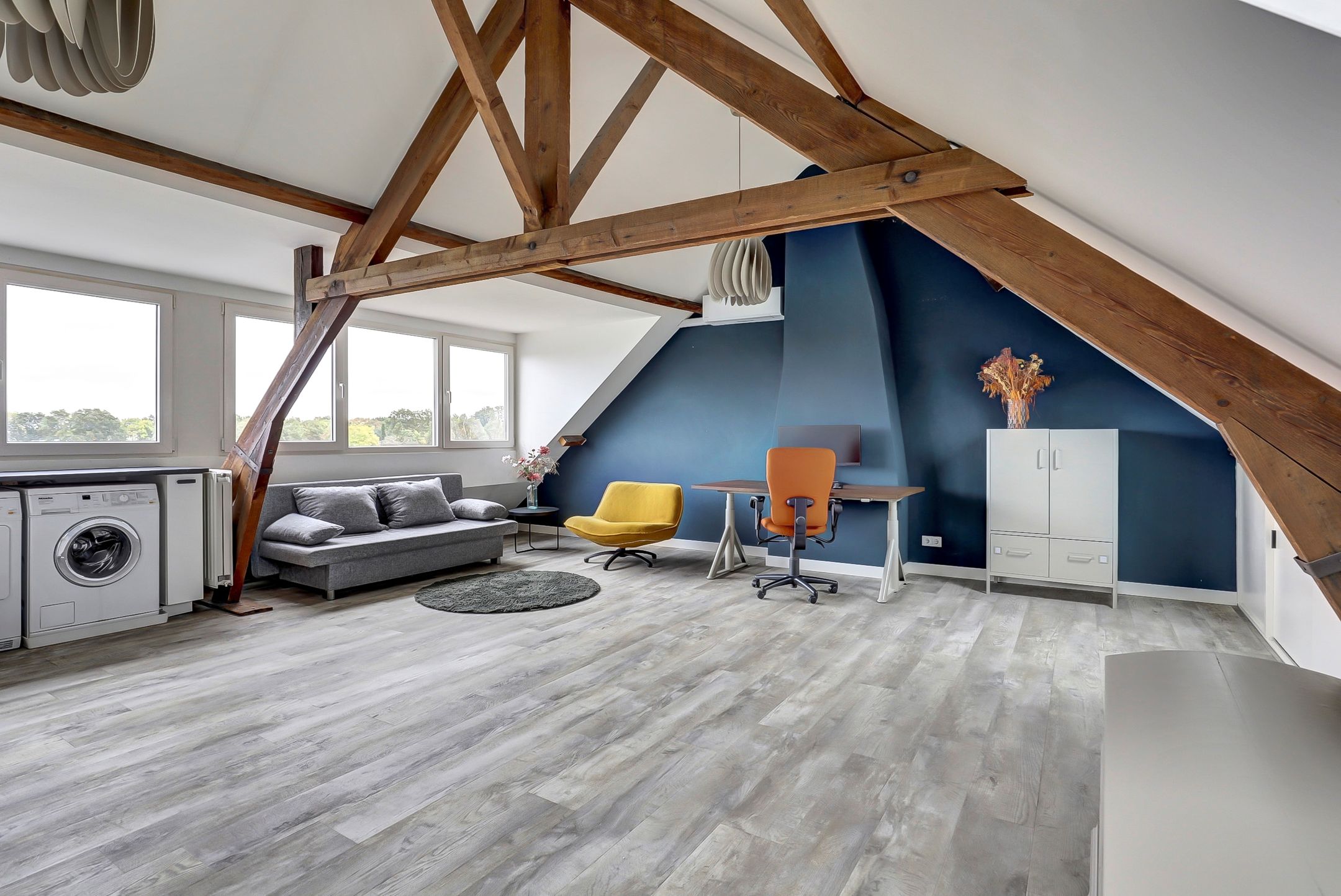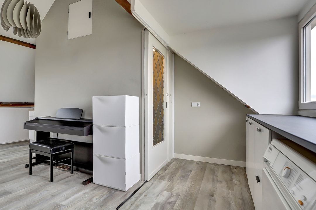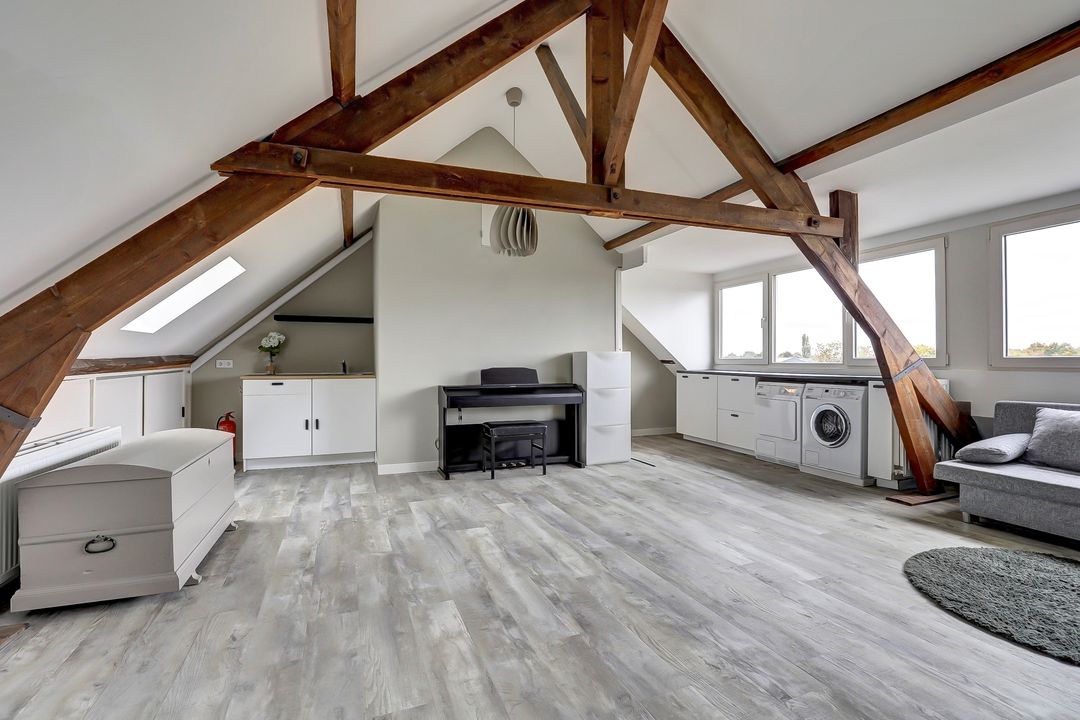 Zodra je de ruimte betreedt, valt je oog meteen op het indrukwekkende uitzicht. De grote dakkapel strekt zich uit over de volledige lengte van de zolder en bestaat uit maar liefst zes ramen, waarvan vier draaikiepramen. Hierdoor baadt de ruimte in natuurlijk daglicht en geniet je van een panoramisch uitzicht over de achterliggende landerijen, elke dag weer anders maar altijd prachtig. De dakspanten zijn bewust in het zicht gelaten, wat de zolder een robuuste en sfeervolle uitstraling geeft. Dankzij de handige indeling kun je hier met gemak één of twee extra slaapkamers creëren of juist kiezen voor een royale werk- of hobbyruimte waar rust en inspiratie samenkomen. Een compact keukenblokje met warm en koud water maakt de ruimte extra veelzijdig. De aansluitingen hiervan bieden bovendien de mogelijkheid om hier eenvoudig een tweede badkamer te realiseren. Ook de witgoedaansluitingen bevinden zich op deze verdieping, praktisch en uit het zicht. De aanwezige airco kan zowel koelen als verwarmen, waardoor het hier het hele jaar door comfortabel vertoeven is. Ook op de zolder ligt een pvc vloer.