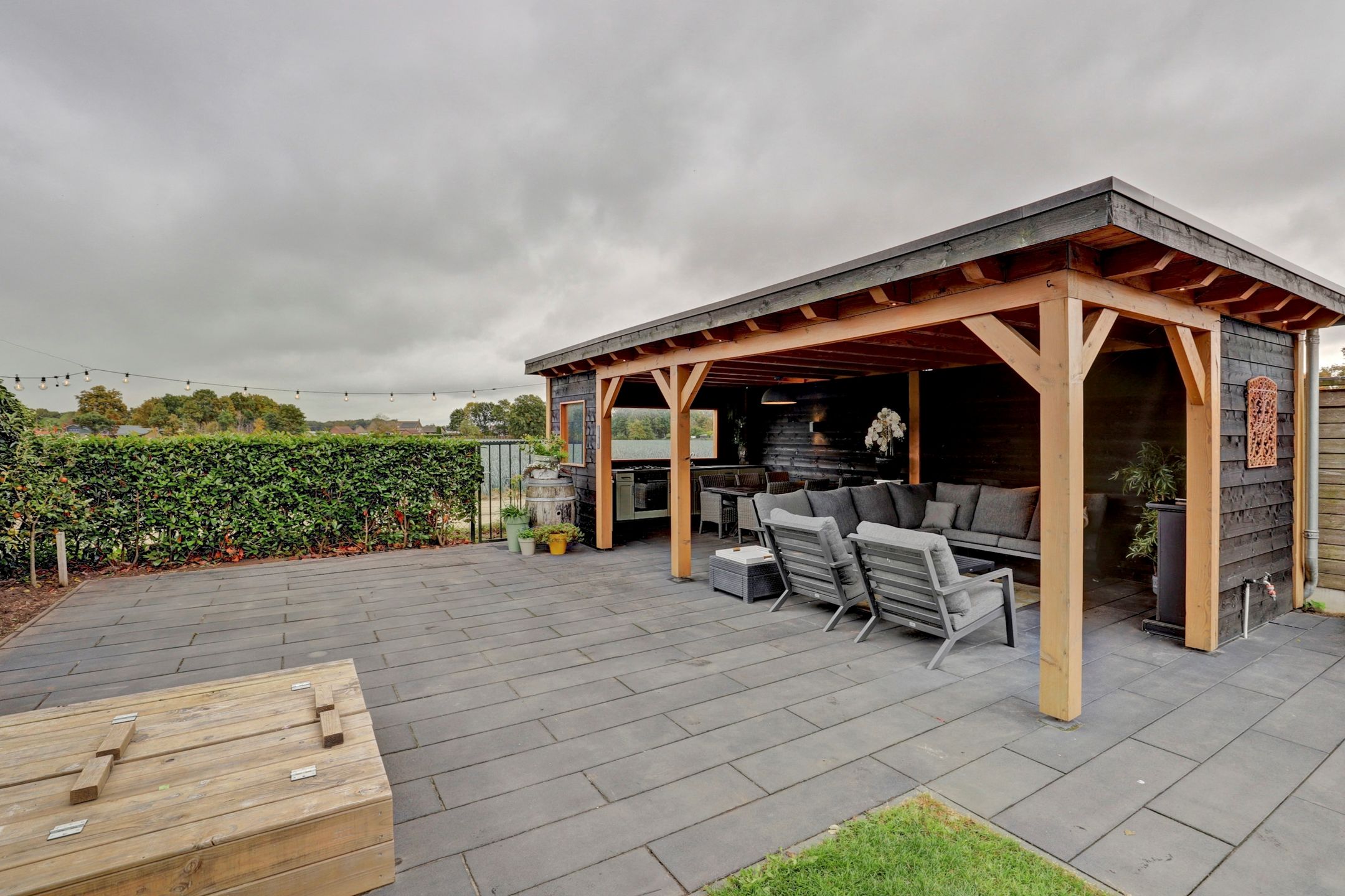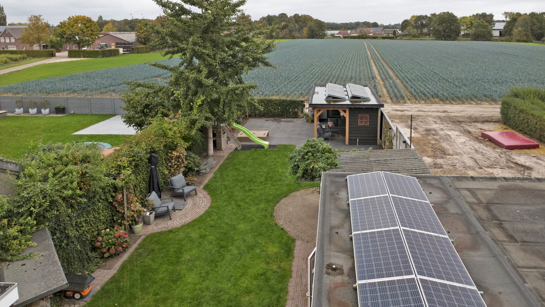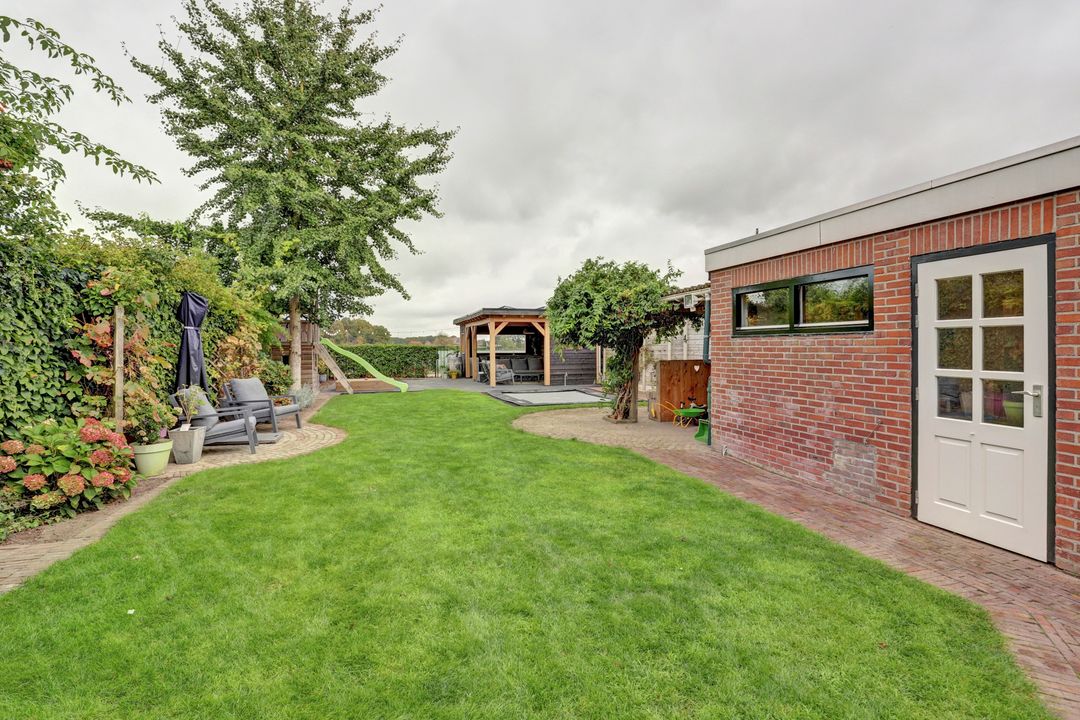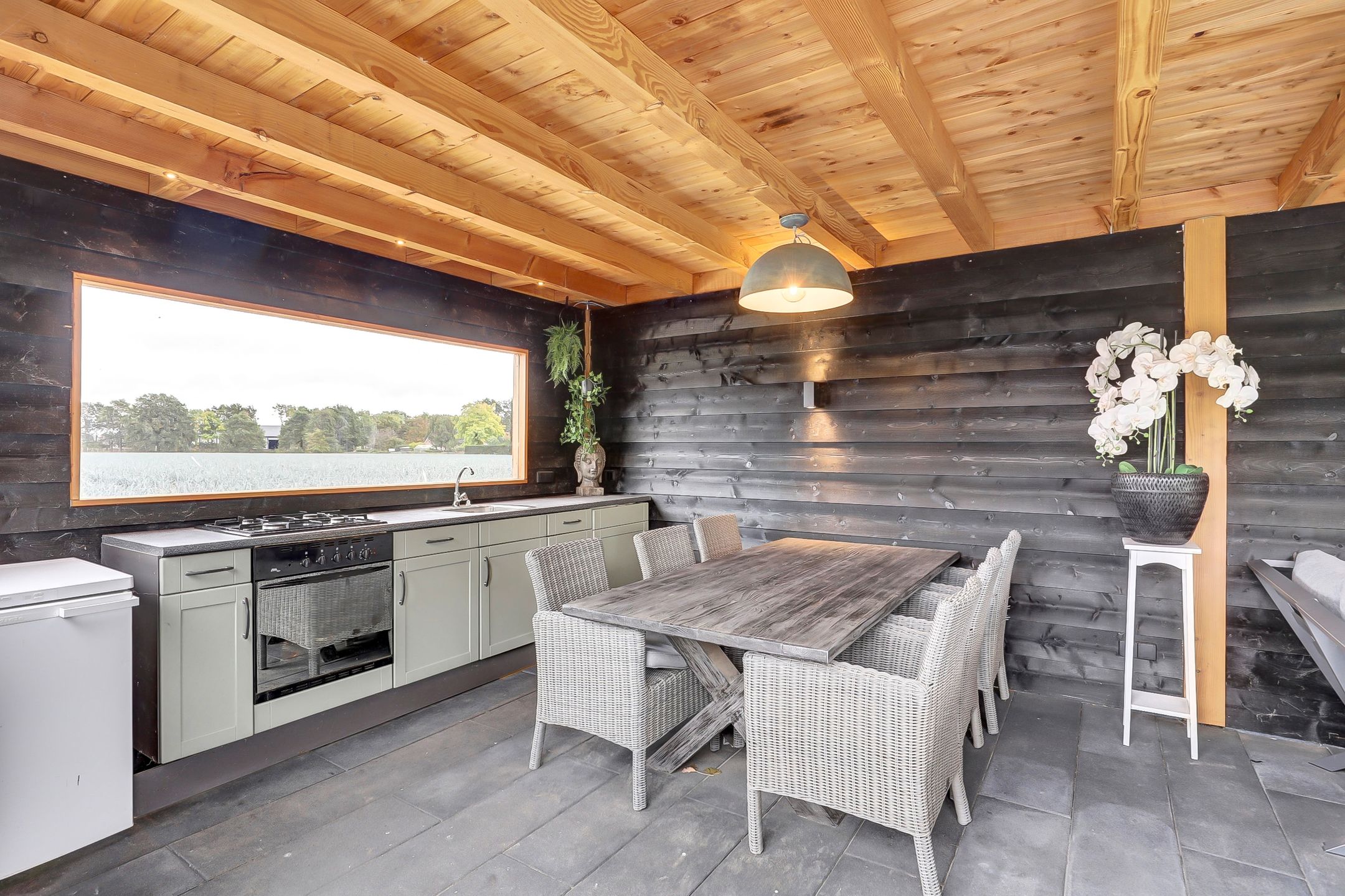Achter in de tuin ligt de loungeplek, een waar paradijs voor liefhebbers van het buitenleven. Hier kun je urenlang genieten van het vrije uitzicht over de landerijen, dat telkens verandert met de seizoenen. De ruimte is voorzien van een buitenkeuken met wasbak en keukenkastjes (het gasfornuis is nog niet aangesloten), een grote eettafel voor lange zomeravonden én zelfs een zitgedeelte met bank en televisie. Hier wordt binnenleven moeiteloos buitenleven: van borrels met vrienden tot rustige avonden onder de sterrenhemel. De tuin is verder aangelegd met gazon en rijke plantenborders, die het geheel een groene en verzorgde uitstraling geven. Via een poortje aan de achterzijde wandel je zo het platteland op. Verder is de tuin voorzien van buitenkranen, stopcontacten en verlichting, zodat je er ook ’s avonds comfortabel van kunt genieten. Tot slot is er nog een grote garage, bestaande uit twee gedeeltes. In het voorste deel is ruimte om fietsen te stallen of zelfs een auto binnen te zetten, terwijl het achterste deel is ingericht als werkplaats, ideaal voor klussers of hobbyisten. Voor de garage ligt een oprit met dubbele poort waardoor je ook hier gemakkelijk in en uit kunt rijden. En tegen de gevel bij de oprit groeien twee perenbomen die perfect passen bij de landelijke sfeer. Deze tuin is echt een verlengstuk van de woning: ruim, groen, praktisch en vol beleving. Een plek waar elk seizoen zijn eigen charme heeft en waar buiten zijn vanzelfsprekend wordt.