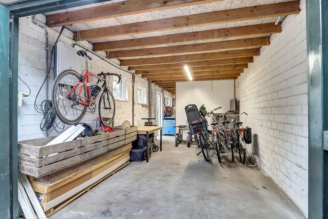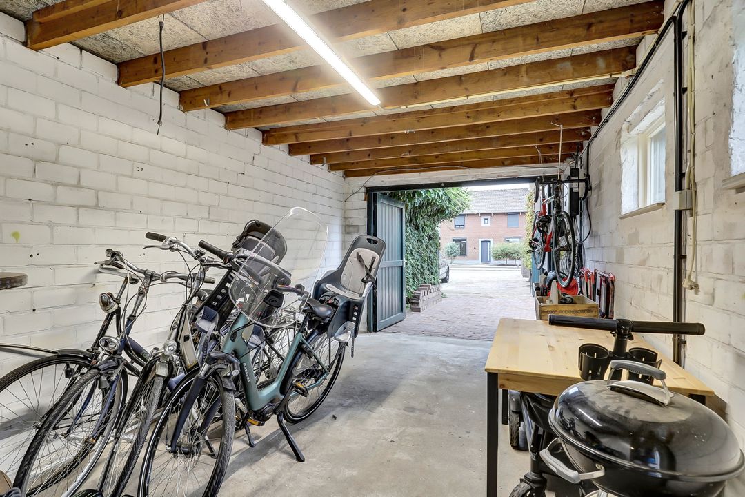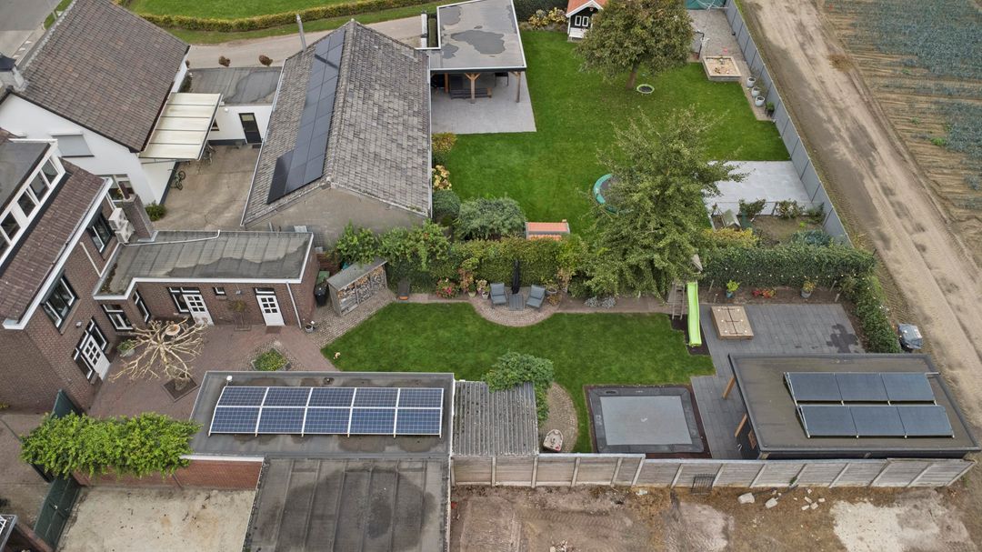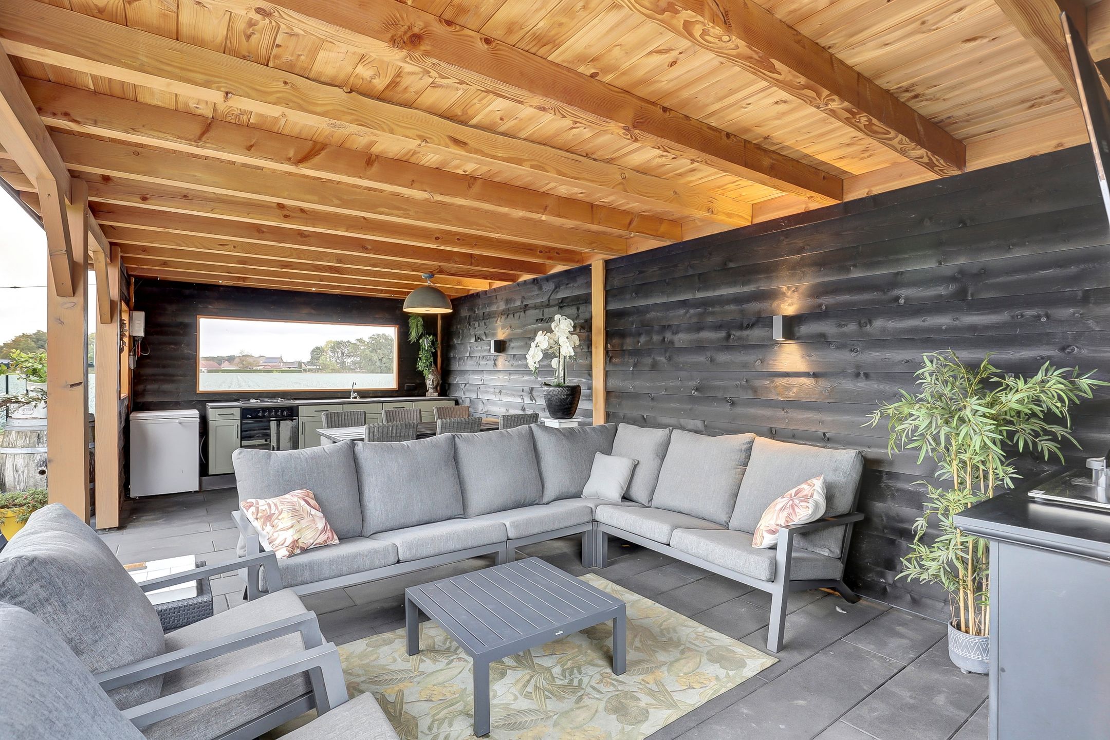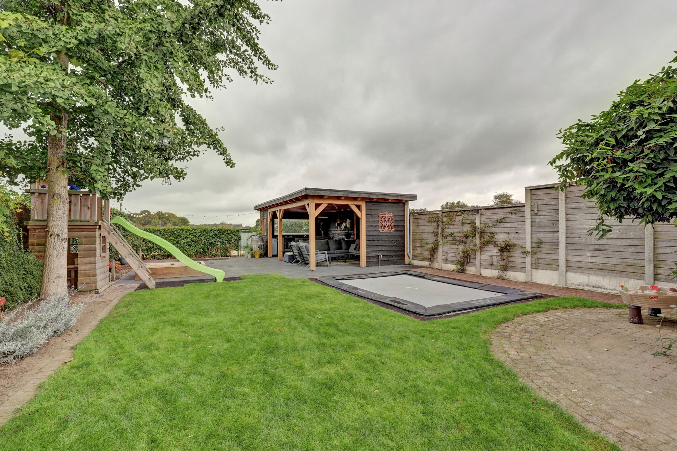 Achter in de tuin ligt de loungeplek, een waar paradijs voor liefhebbers van het buitenleven. Hier kun je urenlang genieten van het vrije uitzicht over de landerijen, dat telkens verandert met de seizoenen. De ruimte is voorzien van een buitenkeuken met wasbak en keukenkastjes (het gasfornuis is nog niet aangesloten), een grote eettafel voor lange zomeravonden én zelfs een zitgedeelte met bank en televisie. Hier wordt binnenleven moeiteloos buitenleven: van borrels met vrienden tot rustige avonden onder de sterrenhemel. De tuin is verder aangelegd met gazon en rijke plantenborders, die het geheel een groene en verzorgde uitstraling geven. Via een poortje aan de achterzijde wandel je zo het platteland op. Verder is de tuin voorzien van buitenkranen, stopcontacten en verlichting, zodat je er ook ’s avonds comfortabel van kunt genieten. Tot slot is er nog een grote garage, bestaande uit twee gedeeltes. In het voorste deel is ruimte om fietsen te stallen of zelfs een auto binnen te zetten, terwijl het achterste deel is ingericht als werkplaats, ideaal voor klussers of hobbyisten. Voor de garage ligt een oprit met dubbele poort waardoor je ook hier gemakkelijk in en uit kunt rijden. En tegen de gevel bij de oprit groeien twee perenbomen die perfect passen bij de landelijke sfeer. Deze tuin is echt een verlengstuk van de woning: ruim, groen, praktisch en vol beleving. Een plek waar elk seizoen zijn eigen charme heeft en waar buiten zijn vanzelfsprekend wordt.