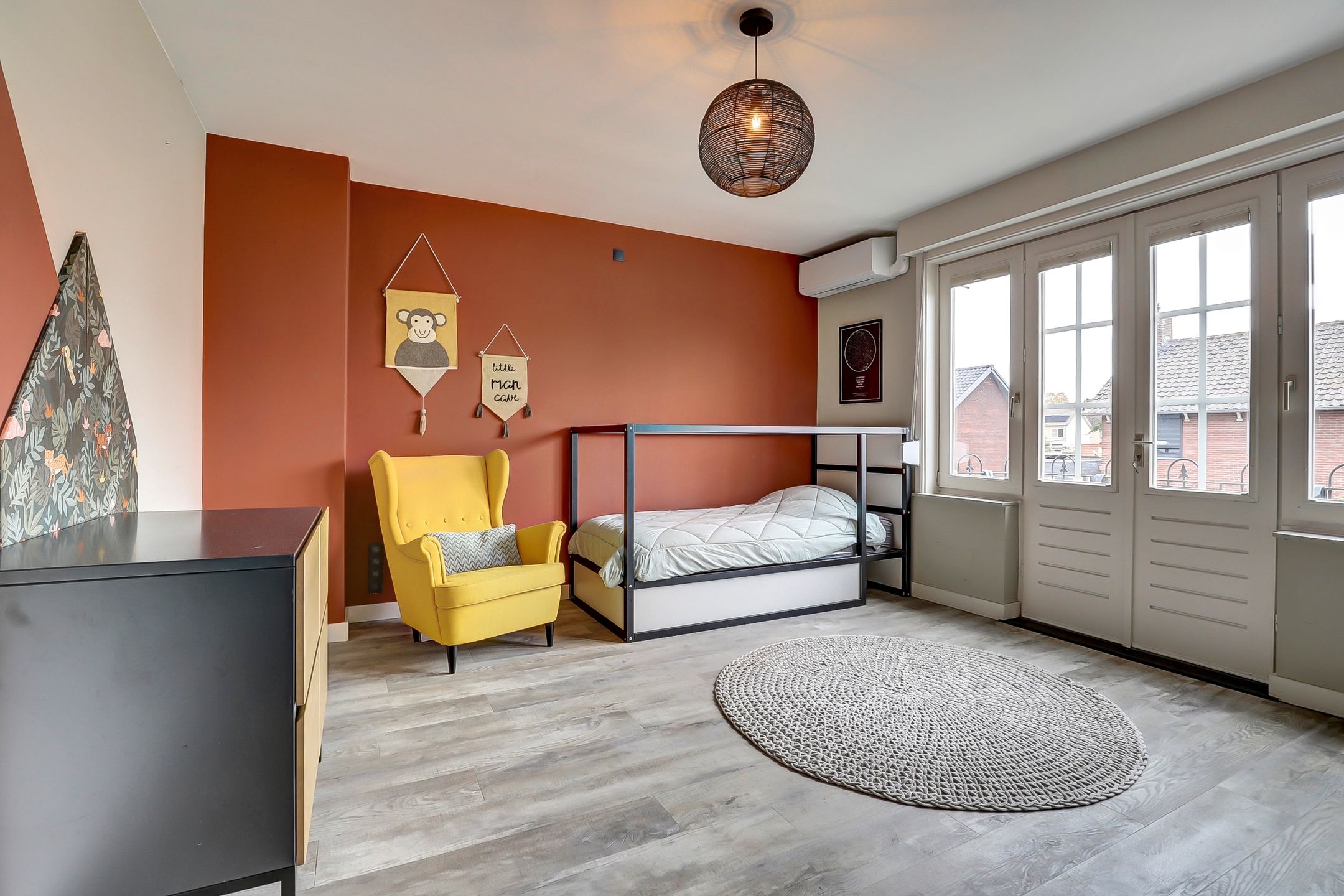 Via de authentieke houten trap in een warme, donkere kleur kom je op de eerste verdieping, waar de combinatie van sfeer en functionaliteit direct opvalt. De overloop en de drie slaapkamers zijn allemaal afgewerkt met een pvc-vloer in houtmotief.