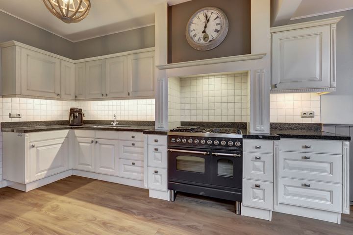 Vanuit de hal loop je door naar de ruime woonkeuken, het hart van het huis. Hoewel de keuken al meer dan vijftien jaar geleden is geplaatst, oogt ze nog steeds tijdloos en sfeervol. De landelijke kastfronten, gecombineerd met het donker granieten werkblad, geven de ruimte een warme, huiselijke uitstraling. Kookliefhebbers kunnen hier hun hart ophalen met maar liefst zes gaspitten, een dubbele oven en een combimagnetron. Verder is de keuken uitgerust met een grote koelkast, vaatwasser en een praktische muurkast voor extra opbergruimte. Er is voldoende plek voor een eettafel en een airco zorgt voor een aangenaam binnenklimaat. Achter de keuken ligt een praktische bijkeuken met een wasbak, inbouwkasten en een toiletruimte met wandtoilet en fonteintje. Zowel vanuit de keuken als de bijkeuken stap je zo de achtertuin in, een fijne verbinding tussen binnen en buiten.